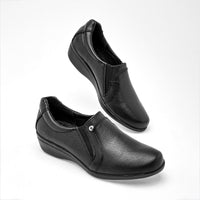 diseño con elásticos laterales para facilitar el calce y pin de la marca a un costado. Corte en Piel
