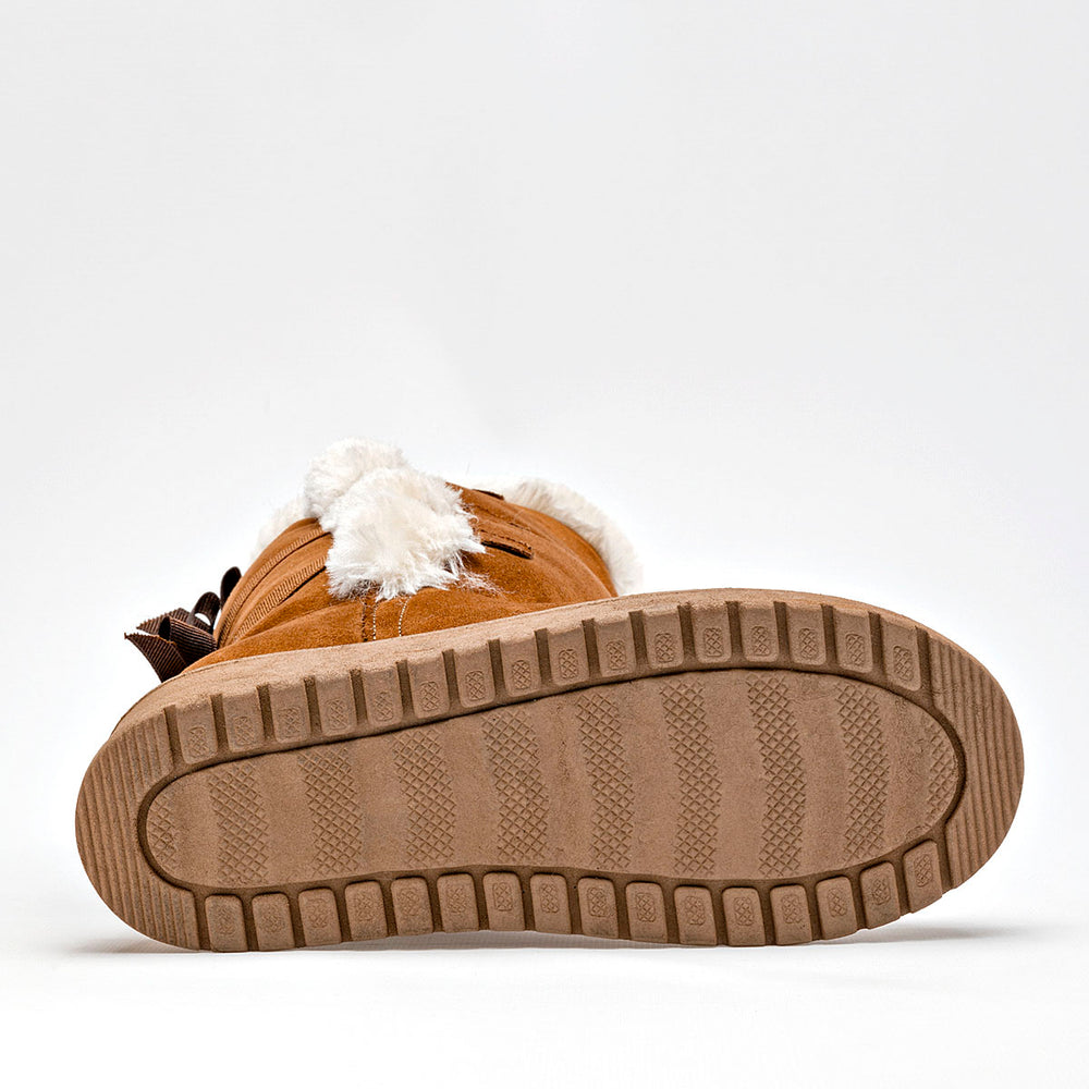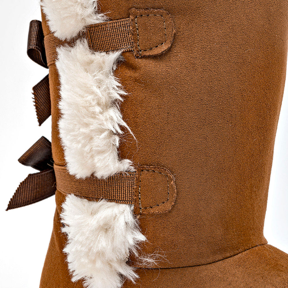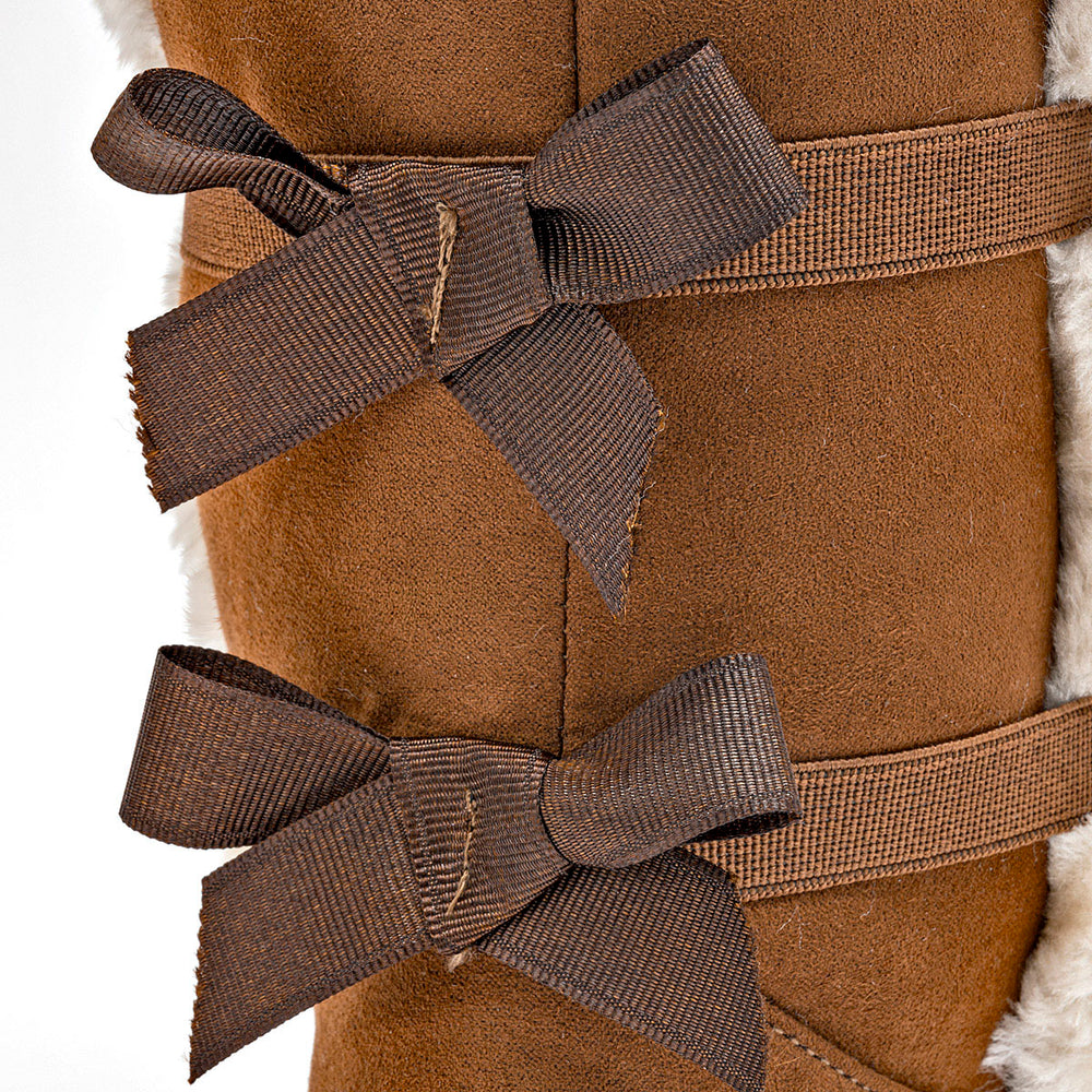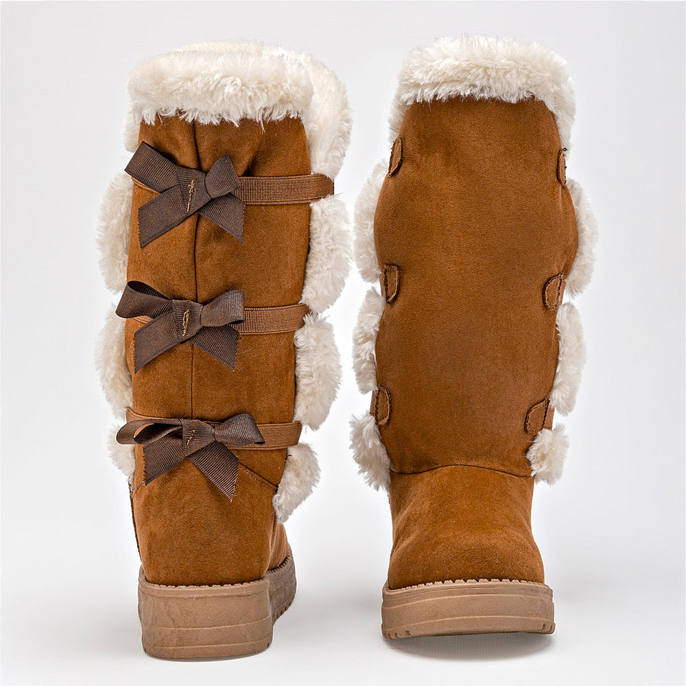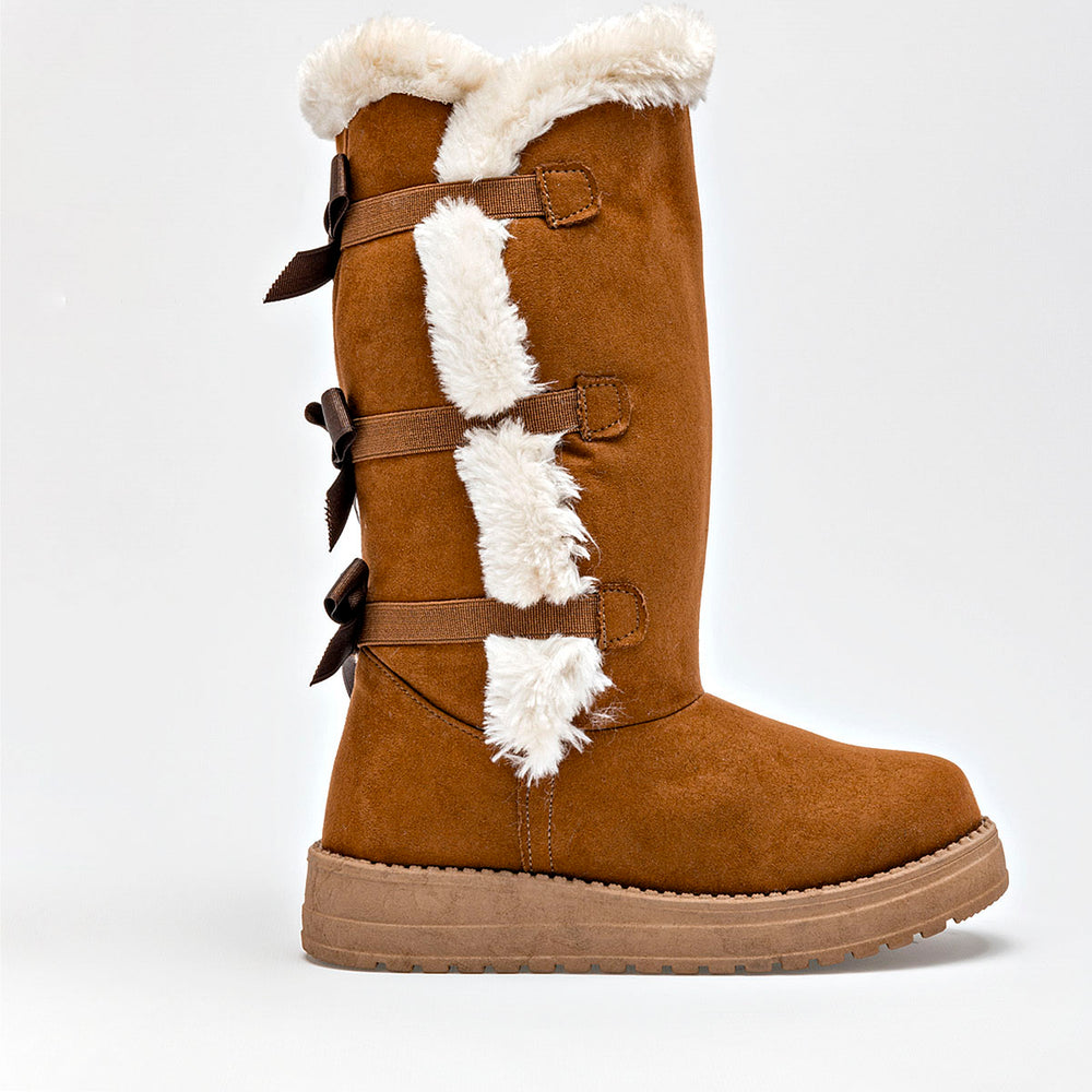 Estas botas son la combinación perfecta de calidez y moda. Su exterior de suave gamuza en color camel se combina a la perfección con un acogedor forro interior de pelo sintético, brindándote una sensación de suavidad y calidez en cada paso. Los detalles de lazos decorativos añaden un toque femenino, mientras que su suela sintética plana y flexible te garantiza comodidad durante todo el día. Ideales para completar tus looks más invernales.