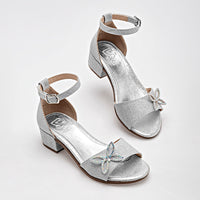 Estas sandalias para niña son una elección elegante y sofisticada. Su diseño destaca por un color plateado brillante con un acabado ligeramente brillante, que les da un toque de glamour y sofisticación. El empeine está adornado con una delicada flor de pedrería que le añade un toque femenino y romántico. La sandalia cuenta con una correa ajustable con hebilla para asegurar un ajuste perfecto.
