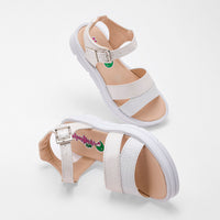 Las sandalias tienen un diseño de tiras cruzadas, con una hebilla ajustable en el tobillo para un calce perfecto. La suela es ligeramente elevada y cuenta con una plataforma que proporciona comodidad y un toque moderno.