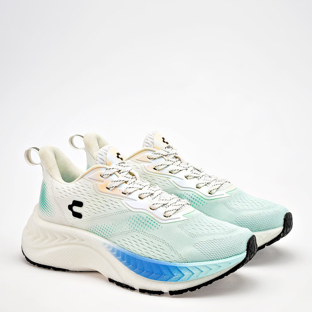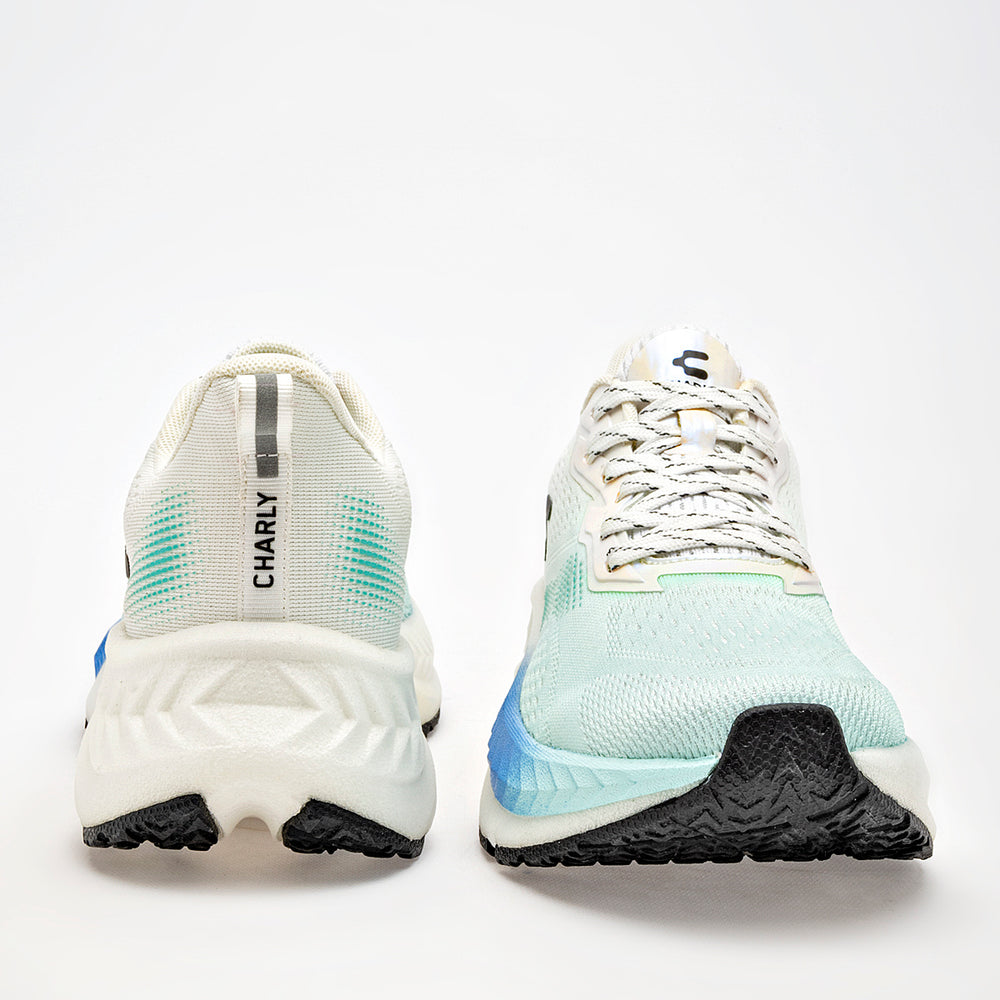 Predominan los colores blanco y menta, con un tejido de malla transpirable. El calzado cuenta con una suela gruesa y ergonómica, con un diseño que combina blanco, azul degradado y negro, además de una suela antiderrapante para mayor seguridad. Los cordones son gruesos y la lengüeta presenta un acabado iridiscente. El logo de la marca se encuentra en el lateral y en la lengüeta.