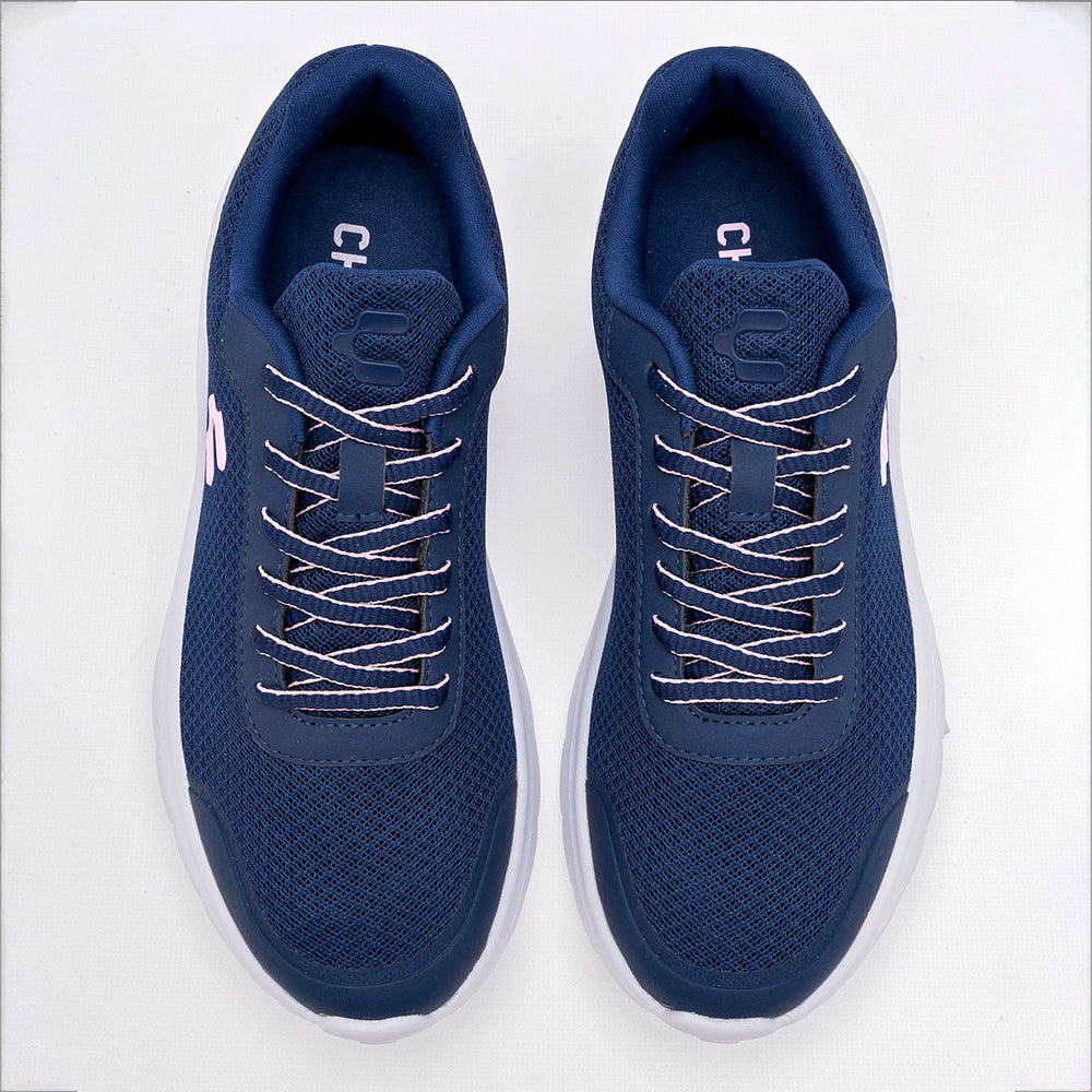 La parte superior es de malla transpirable de color marino, que ofrece una excelente ventilación. Cuentan con detalles en color beige, como el logo de la marca en el lateral y los cordones, que le dan un toque de color vibrante. La suela, en color blanco, es gruesa y antiderrapante, proporcionando amortiguación y tracción, ideal para diferentes actividades. El diseño general es cómodo, versátil y funcional.