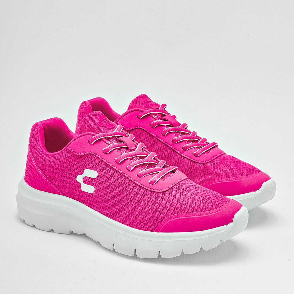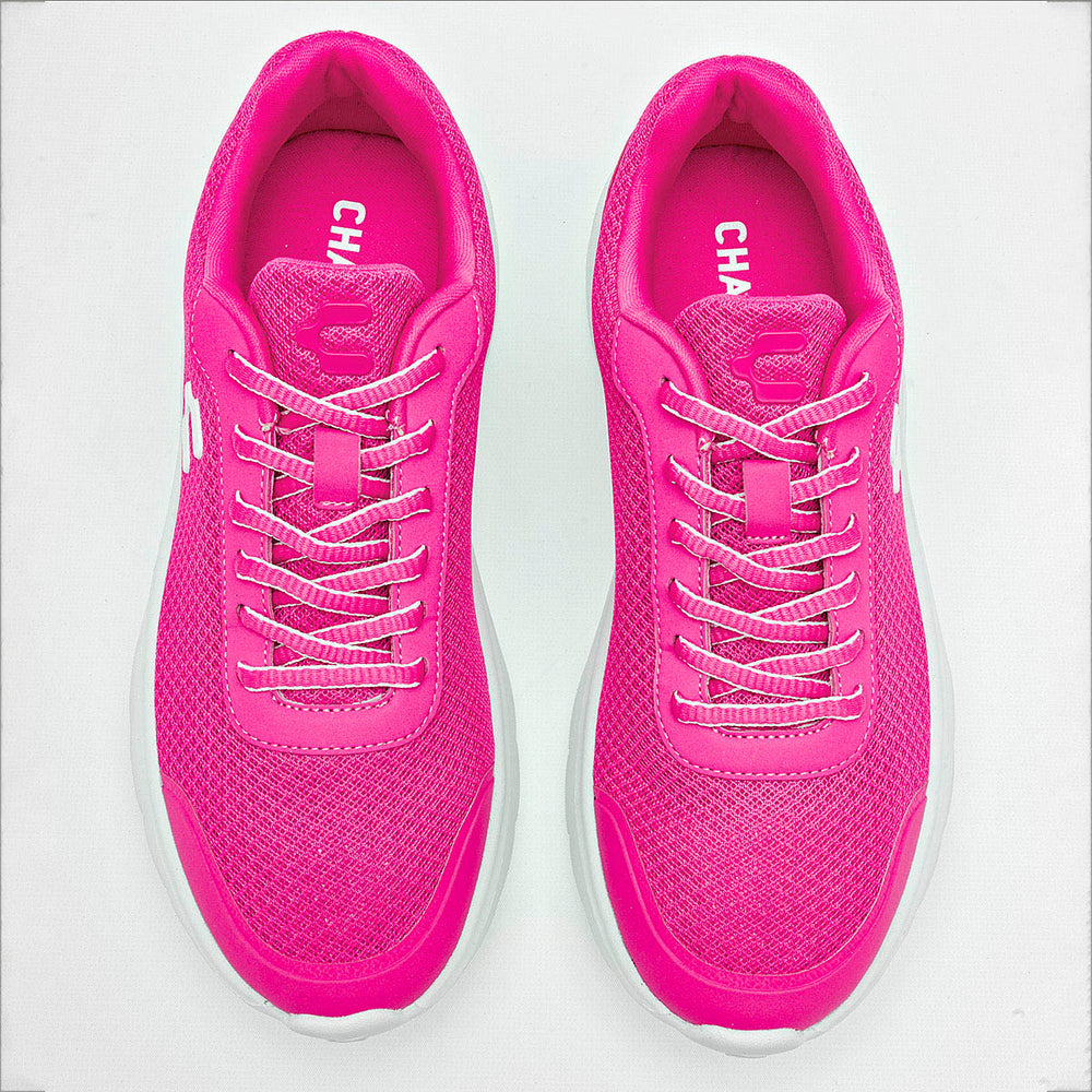 La parte superior es de malla transpirable de color fiusha, que ofrece una excelente ventilación. Cuentan con detalles en color blanco, como el logo de la marca en el lateral y los cordones, que le dan un toque de color vibrante. La suela, en color blanco, es gruesa y antiderrapante, proporcionando amortiguación y tracción, ideal para diferentes actividades. El diseño general es cómodo, versátil y funcional.