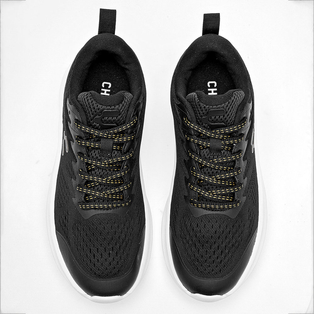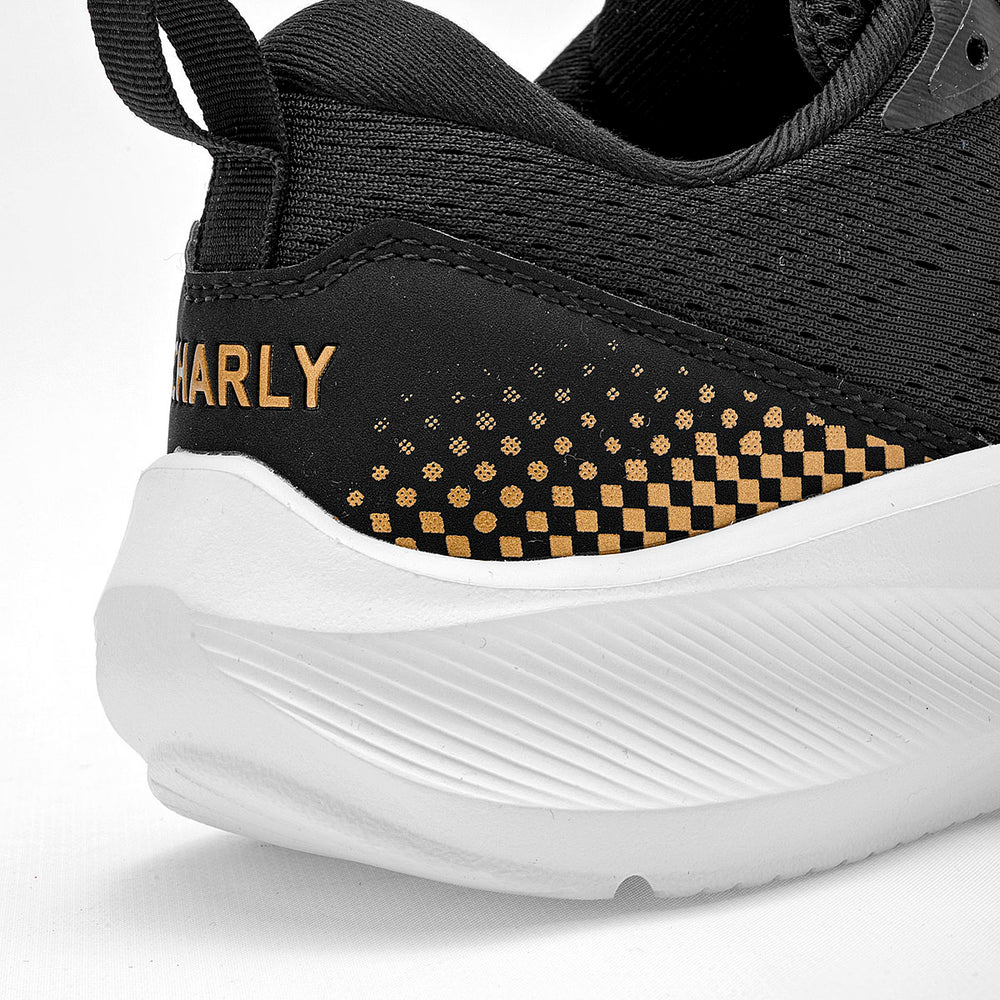 La parte superior es de malla transpirable en tono negro, lo que asegura una óptima ventilación y ligereza. Cuenta con detalles en color oro, como el logo de la marca en el lateral y un patrón geométrico en la parte trasera, que añaden un toque de estilo. Los cordones son una mezcla de negro y oro, complementando el diseño. La suela es ancha, de color blanco y de apariencia robusta, diseñada para ofrecer máxima comodidad, soporte y una excelente amortiguación.