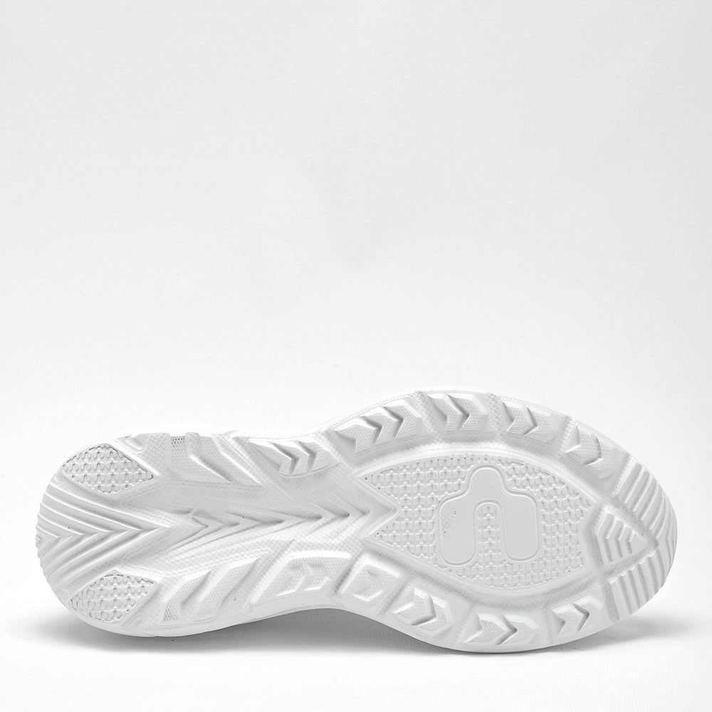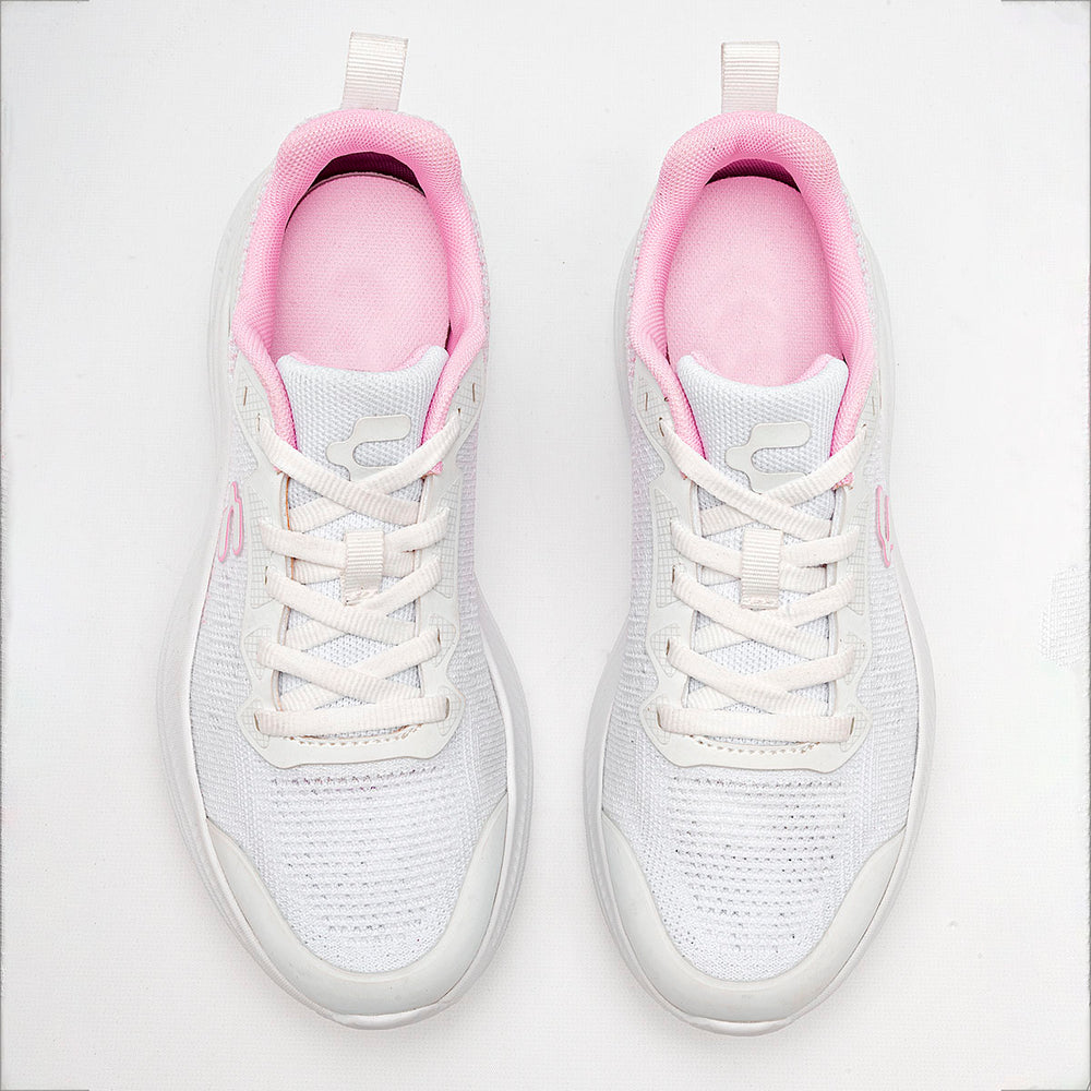 La parte superior es de malla transpirable de color blanco, que permite una excelente ventilación y un ajuste ligero. Presentan acentos en un delicado tono rosa pastel en el interior, los bordes de la lengüeta y en el logo de la marca en el lateral, lo que les da un toque suave y moderno. Cuentan con cordones blancos que complementan el diseño. La suela es robusta y ancha, de color blanco, diseñada para proporcionar una amortiguación superior y soporte para el pie.