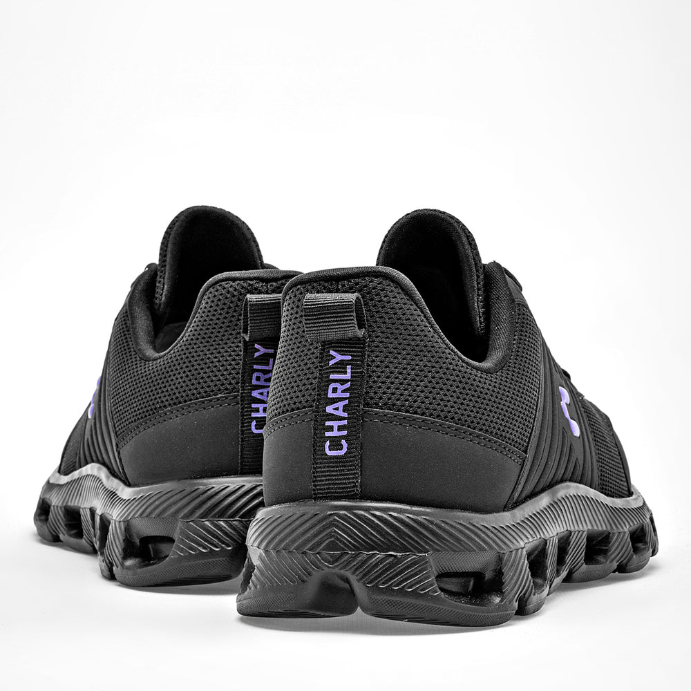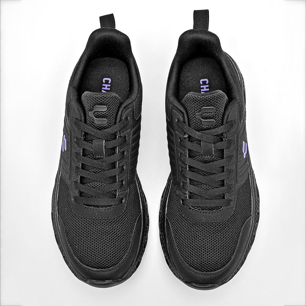 La parte superior está confeccionada en malla transpirable, lo que asegura ligereza y una óptima ventilación. Cuentan con un detalle distintivo de líneas en relieve en el lateral y un toque de color en el logo de la marca, que es de un sutil tono violeta, añadiendo un contraste de color. La suela es de color negro, con un diseño robusto y futurista de aberturas y canales que no solo proporciona un aspecto vanguardista, sino que también ofrece una excelente flexibilidad y amortiguación.