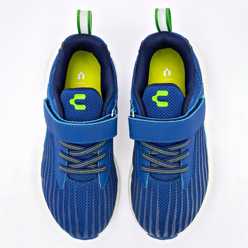 El empeine está fabricado en malla transpirable con un patrón de líneas verticales, lo que brinda ventilación y flexibilidad. Cuentan con un sistema de cierre práctico que incluye una correa de velcro en la parte superior para un ajuste rápido, y cordones elásticos que facilitan el calzado. El logo de la marca en verde neón resalta en el lateral. Su suela gruesa y ligera de color blanco ofrece una excelente amortiguación, mientras que la suela exterior de goma en azul proporciona tracción y durabilidad.