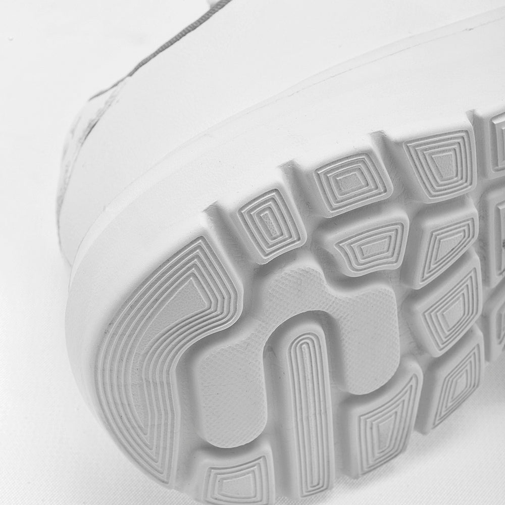 Cuentan con un sistema de ajuste híbrido que combina agujetas elásticas para un calce rápido y una correa de velcro en la parte superior que asegura un ajuste firme y personalizado. La parte superior es de material sintético liso y duradero, mientras que la suela es gruesa y robusta, con un diseño esculpido que proporciona una amortiguación superior. Los acentos en color gris en el forro interior y el logo de la marca en el lateral añaden un toque moderno al diseño limpio y versátil.