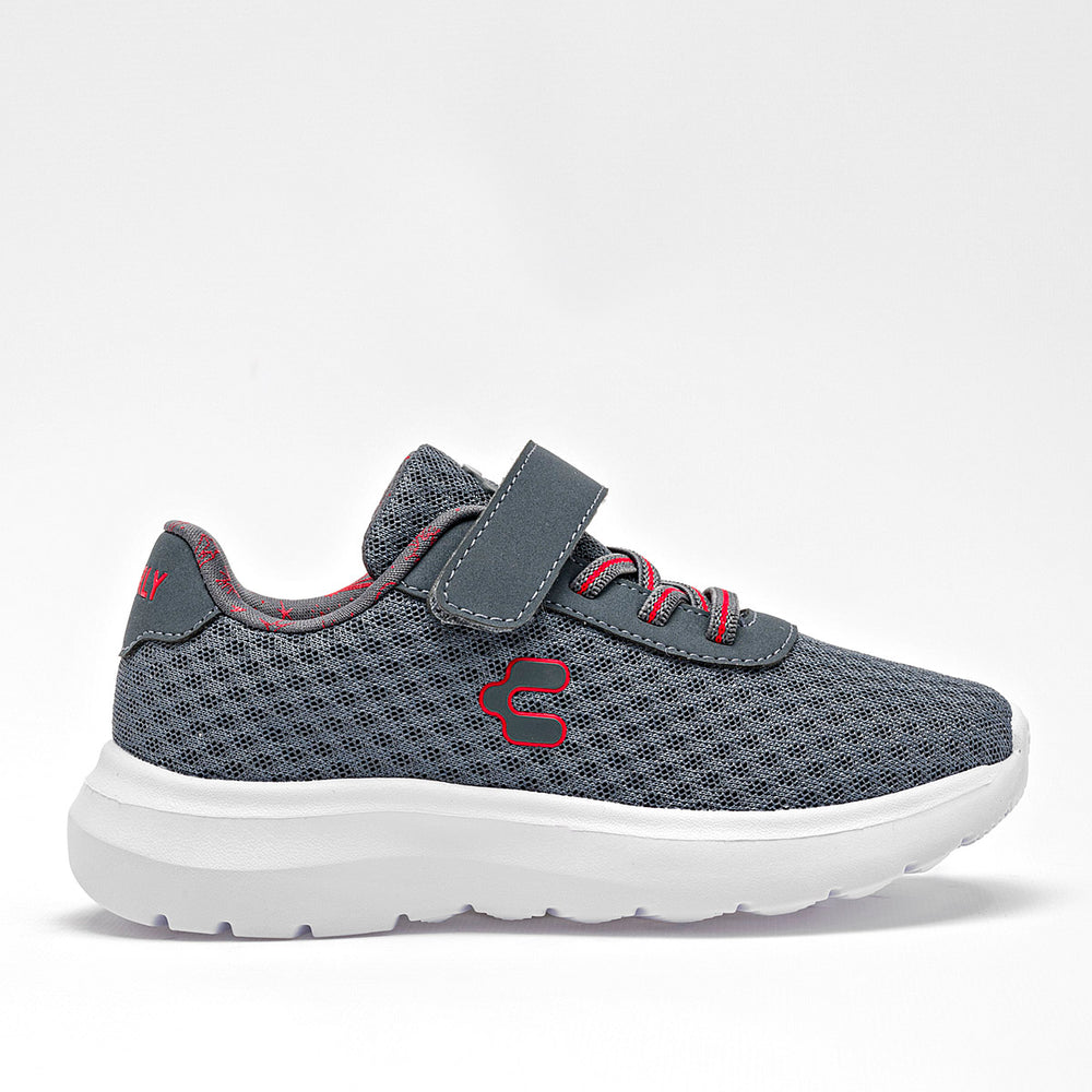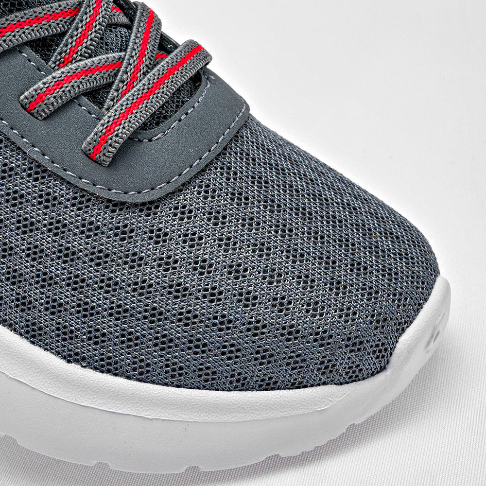 La parte superior está fabricada con una malla de alta calidad y transpirable, ideal para mantener los pies frescos. Cuentan con un sistema de cierre práctico y seguro que incluye agujetas elásticas para un calce rápido y una correa de velcro para un ajuste firme. El diseño destaca por sus detalles en color rojo, como el contorno del logo y las agujetas, que contrastan con la base gris. La suela, gruesa y de color blanco, proporciona una excelente amortiguación y ligereza para cualquier actividad.