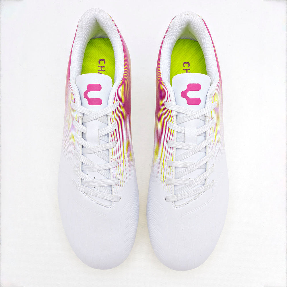 La parte superior es de , y en la zona lateral presenta un gráfico de líneas finas en degradado, que van del al amarillo, creando un efecto dinámico. La suela es de y cuenta con tacos de plástico cónicos y redondeados en es y amarillo, diseñados para proporcionar un buen agarre.