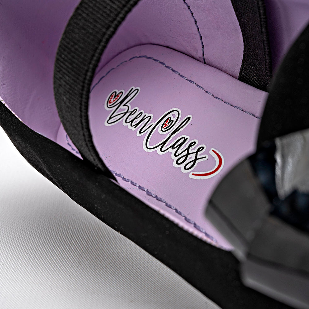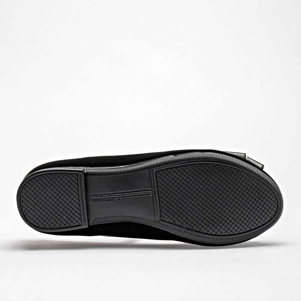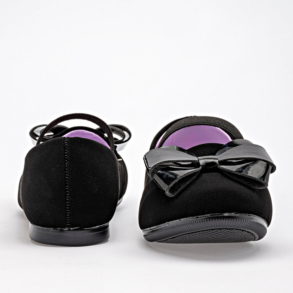 La parte superior está fabricada en material de ante, de tacto suave. Destaca un lazo decorativo de charol negro en la punta, que le añade un toque de brillo. Una banda elástica cruzada sobre el empeine asegura un ajuste cómodo y seguro. El interior está forrado de color morado lo que crea un contraste visual atractivo. La suela es plana y de bajo perfil.