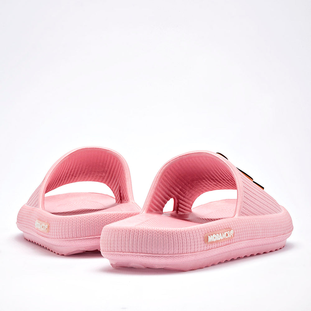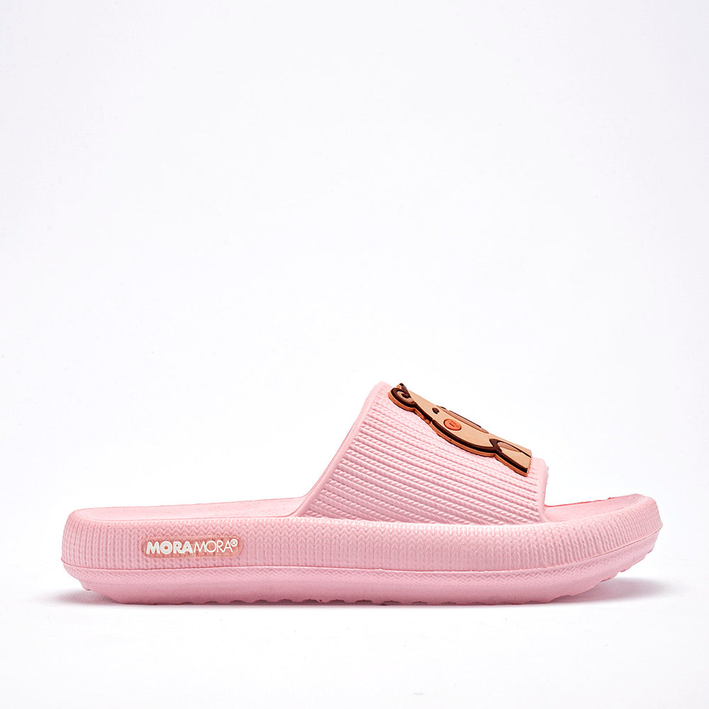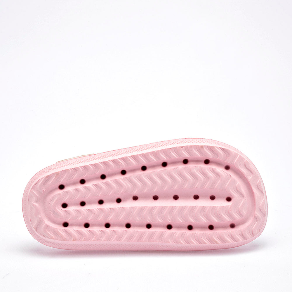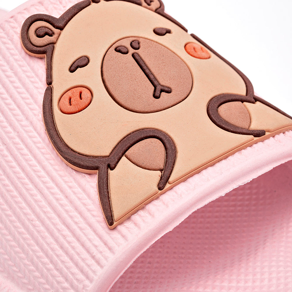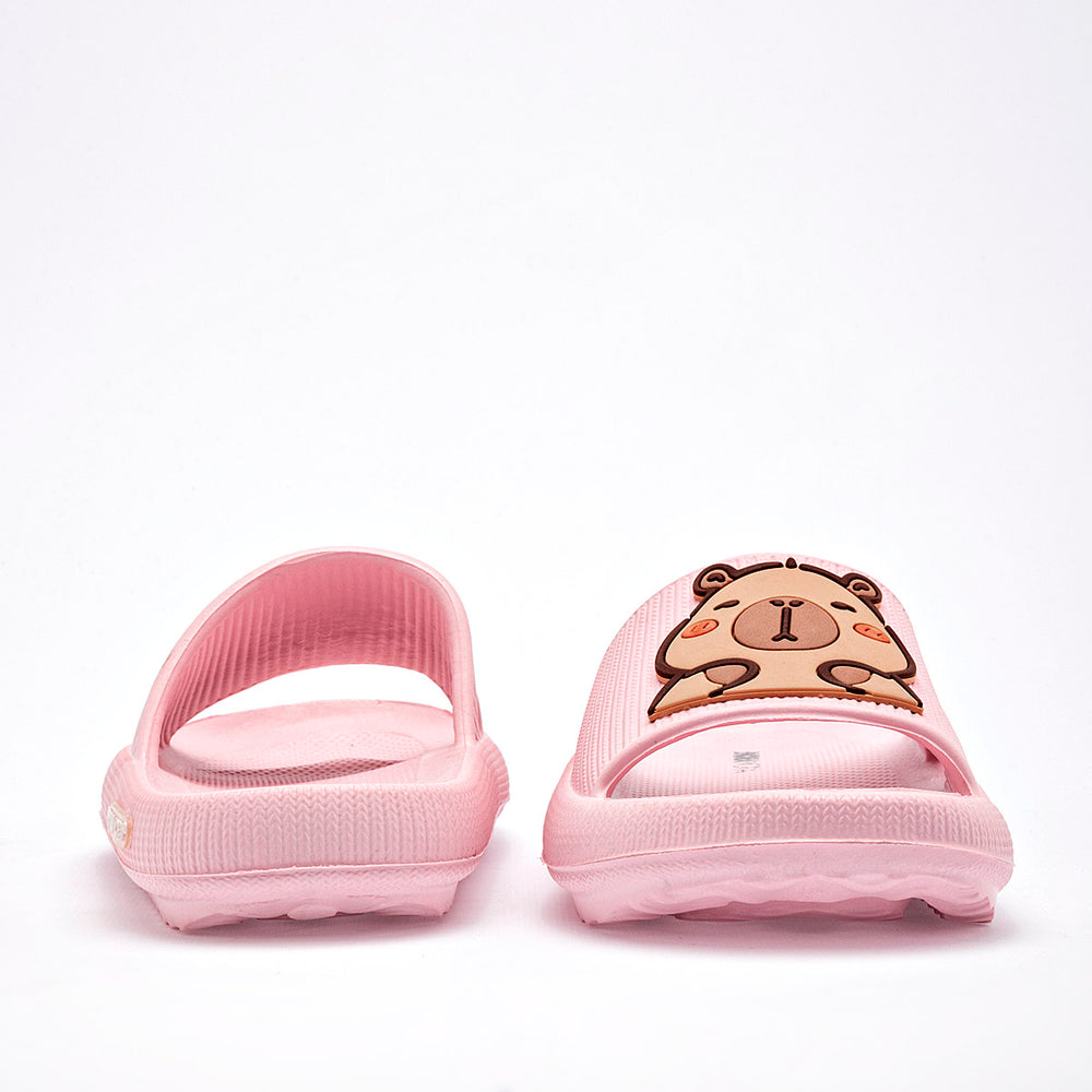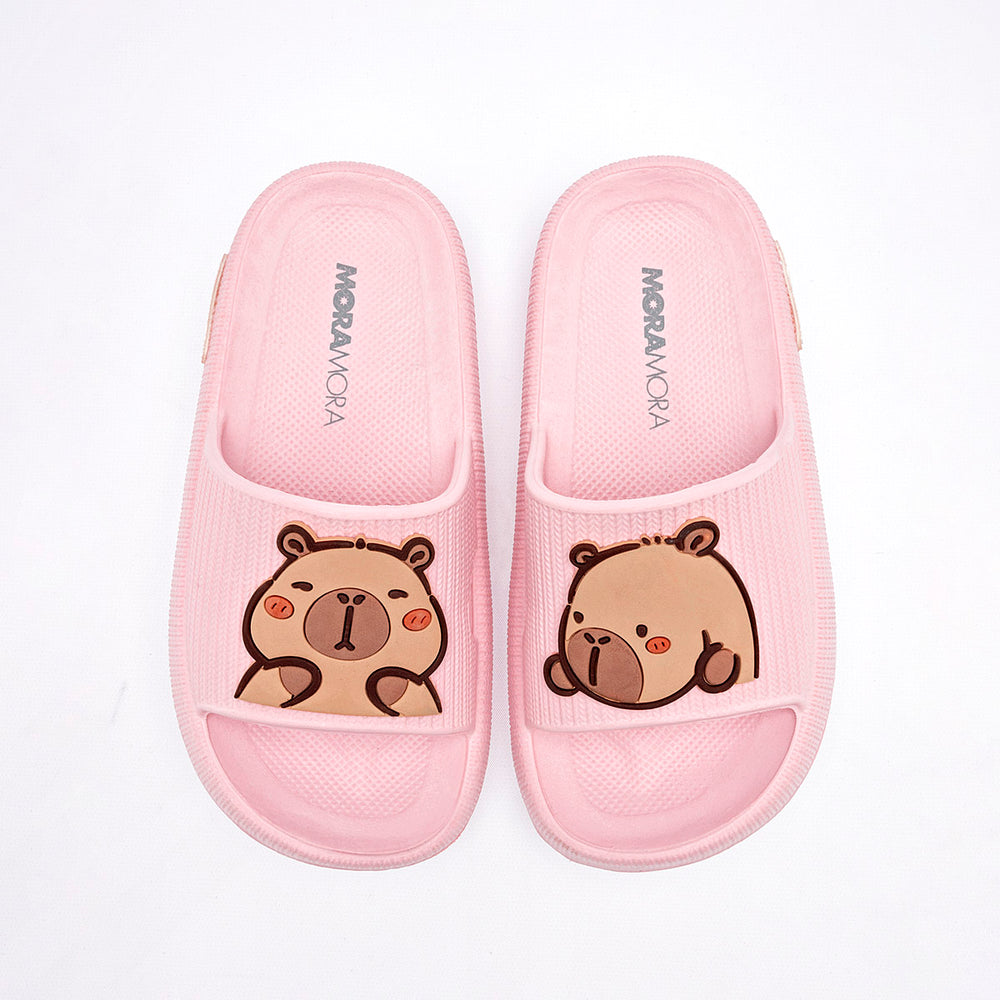 Presenta un diseño de banda ancha en la parte superior, adornada con una ilustración de un oso de estilo kawaii. El calzado cuenta con una suela gruesa y texturizada, que ofrece un estilo divertido y comodidad para el uso diario.