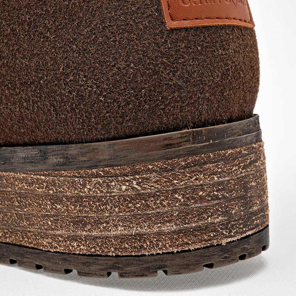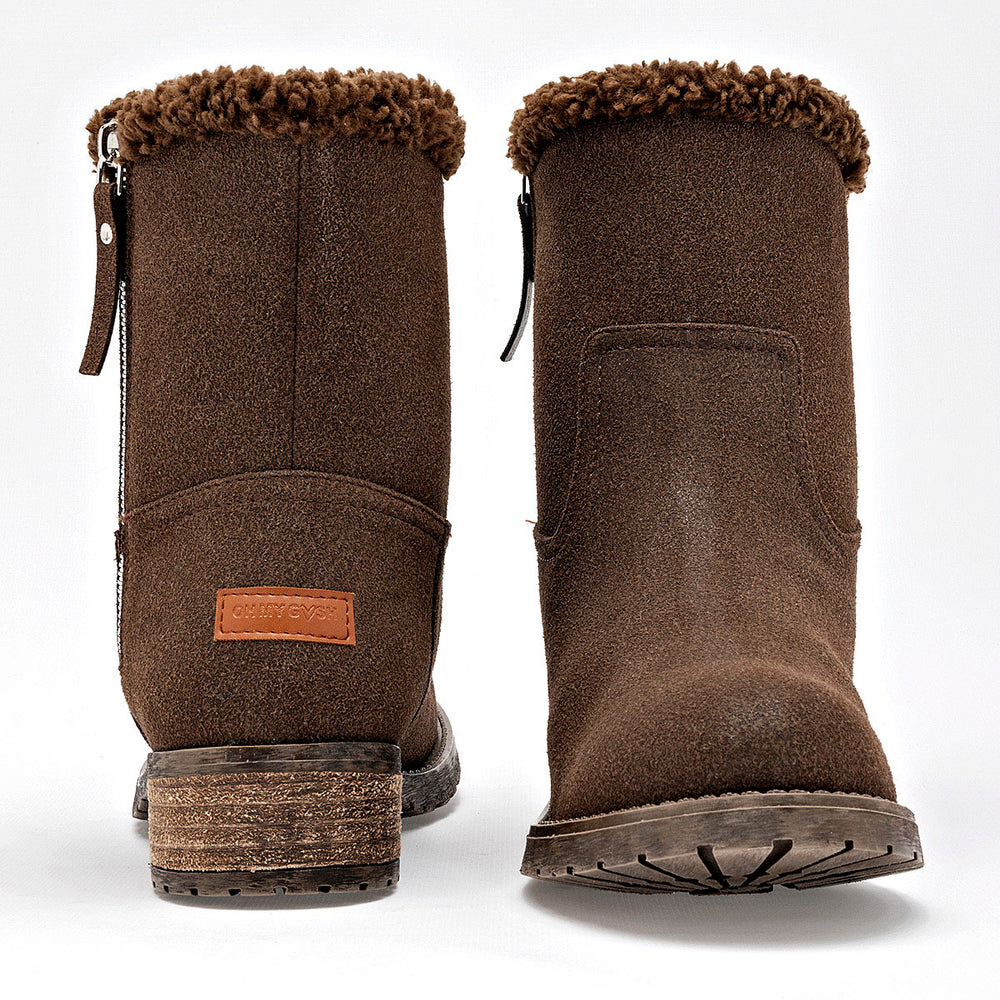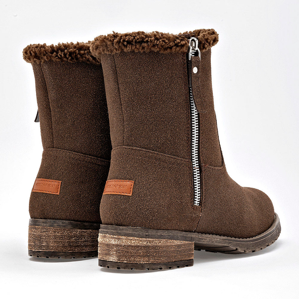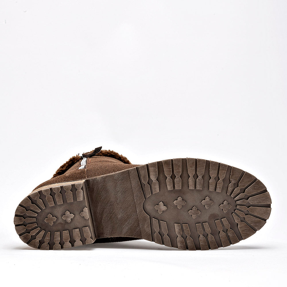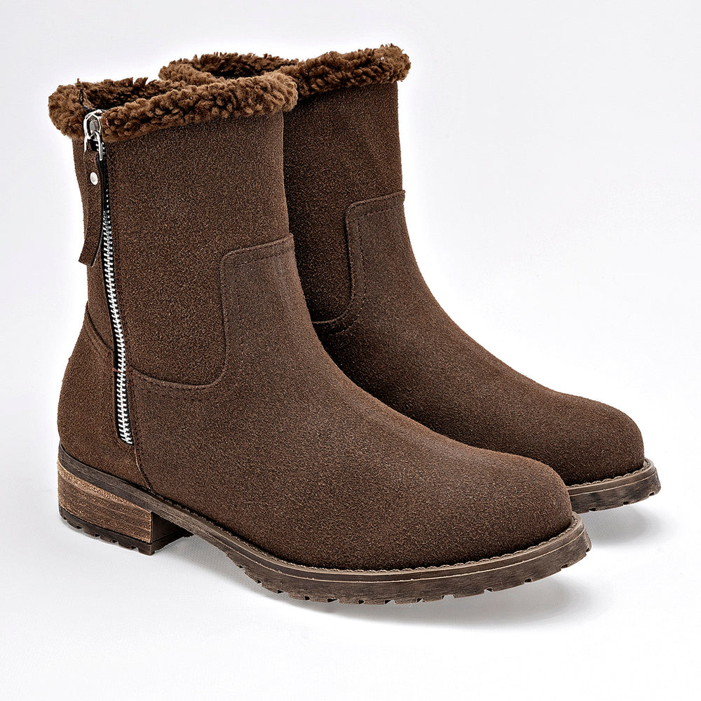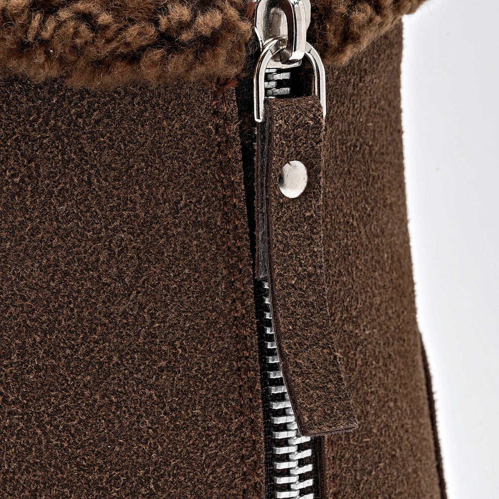 Están confeccionados en un material de gamuza, con un acabado suave y cálido. Su diseño destaca por el forro interior de borrego sintético del mismo color, que se asoma por el borde superior, brindando un toque acogedor y funcional. Tienen un cierre de cremallera metálica en la parte lateral, que no solo facilita su colocación, sino que también añade un detalle de estilo. La suela es baja, con un ligero tacón apilado de madera y una suela de goma con relieve, lo que proporciona un buen agarre.
