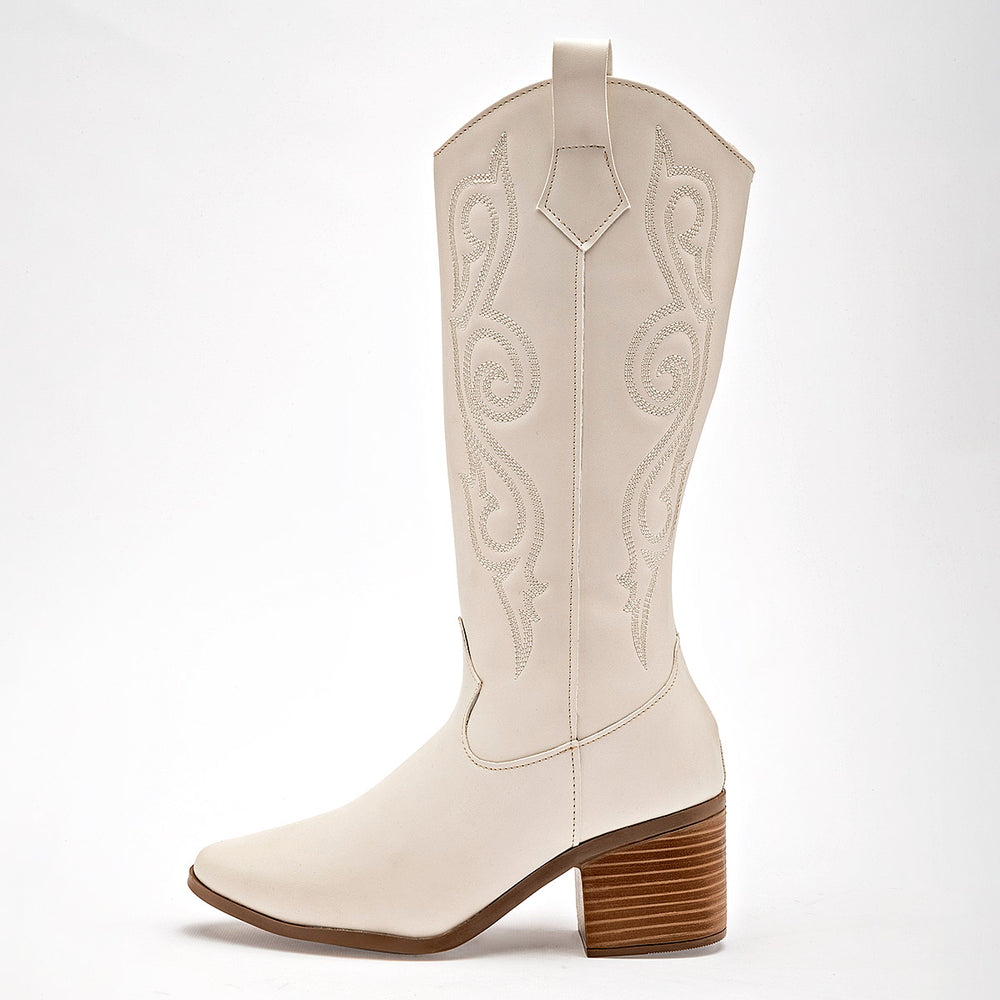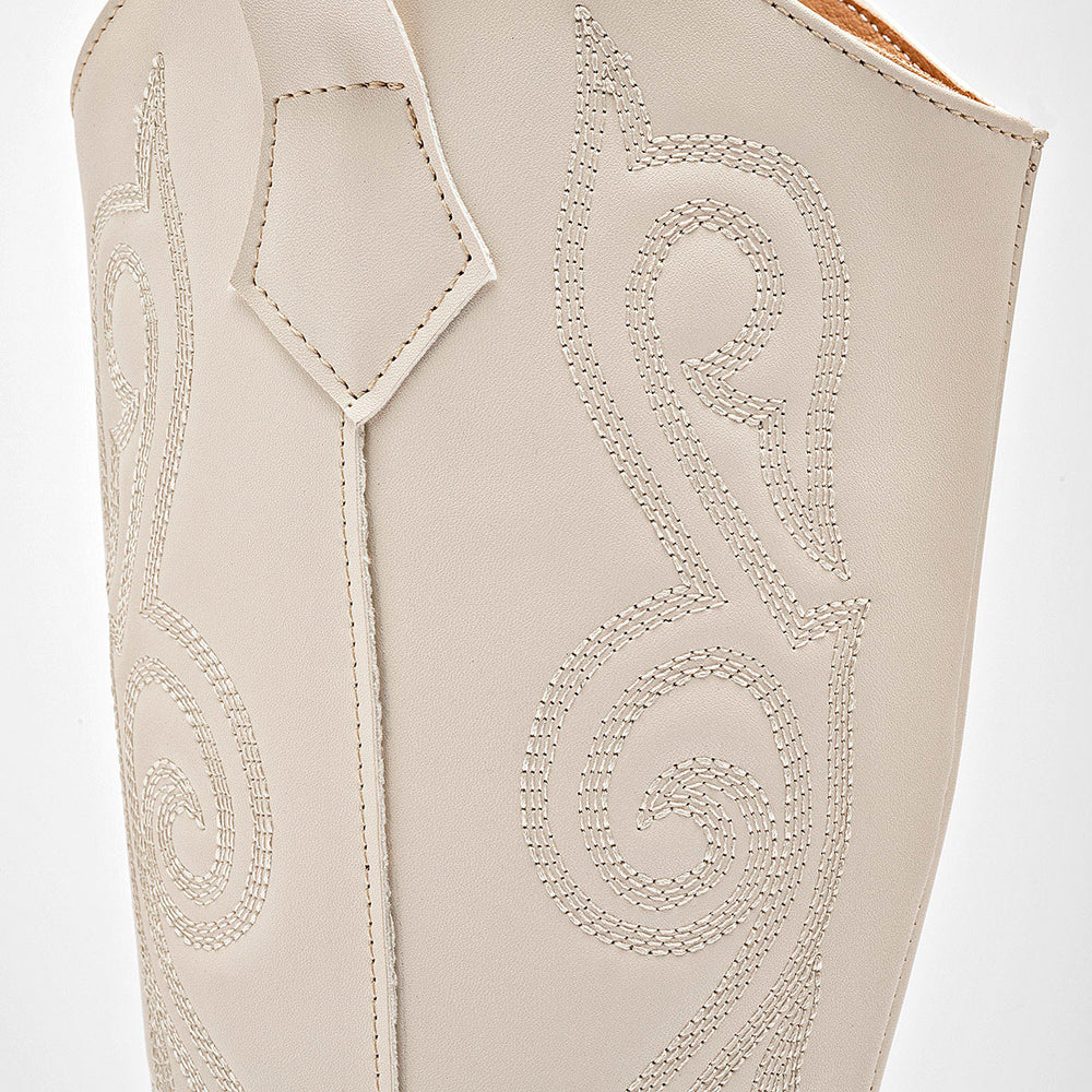 El material tiene un acabado liso y presenta bordados de estilo occidental en la caña. El tacón es de 6 cm, de bloque y con un acabado que simula la madera, lo que le da un toque natural. La punta del calzado es afilada y la caña tiene la característica forma de corte en "V" en la parte superior. Cuenta con dos tiradores laterales para facilitar su colocación.