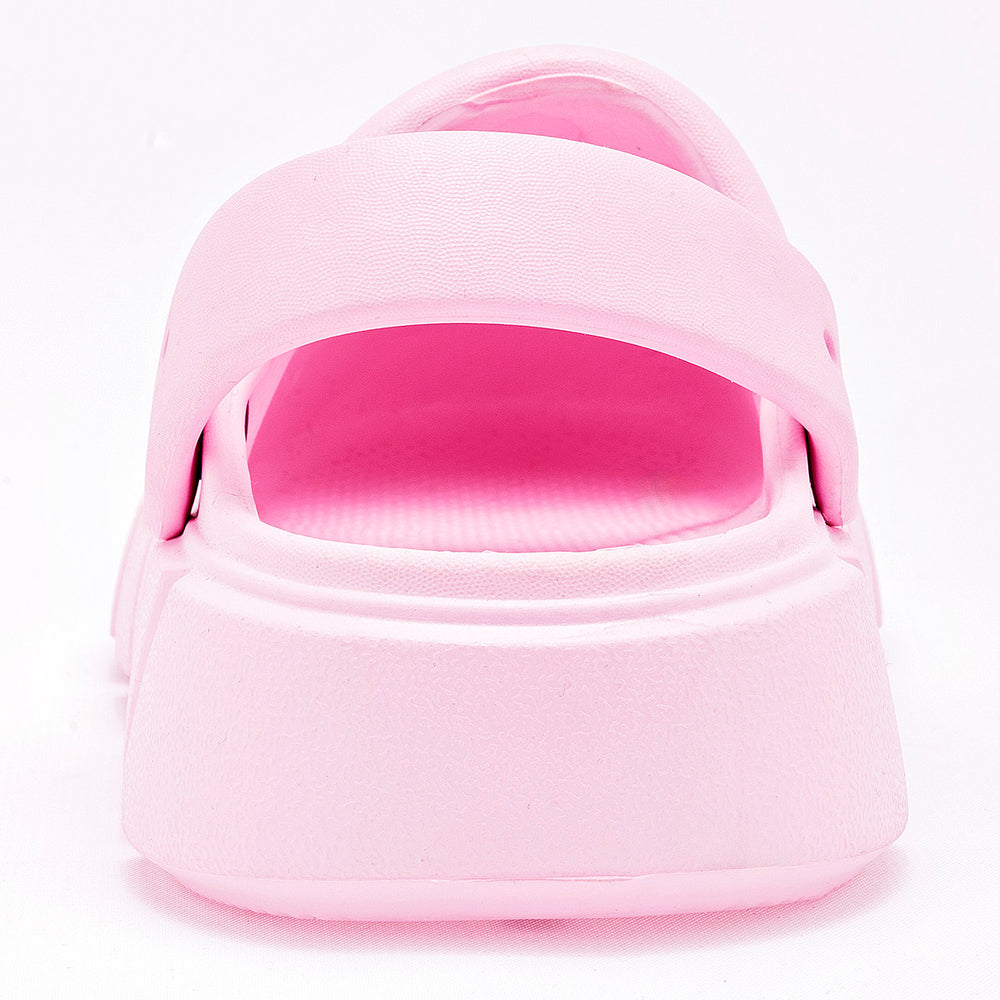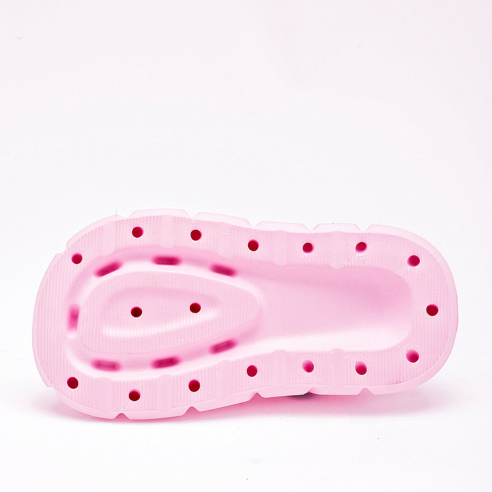 Tienen una tira superior de sujeción para el pie con un adorno de una flor rosa en la parte frontal. El calzado es de goma y cuenta con una suela de plataforma robusta que le da un toque moderno y a la vez brinda comodidad. Son ligeros y se pueden usar con el pie desnudo o con calcetines.