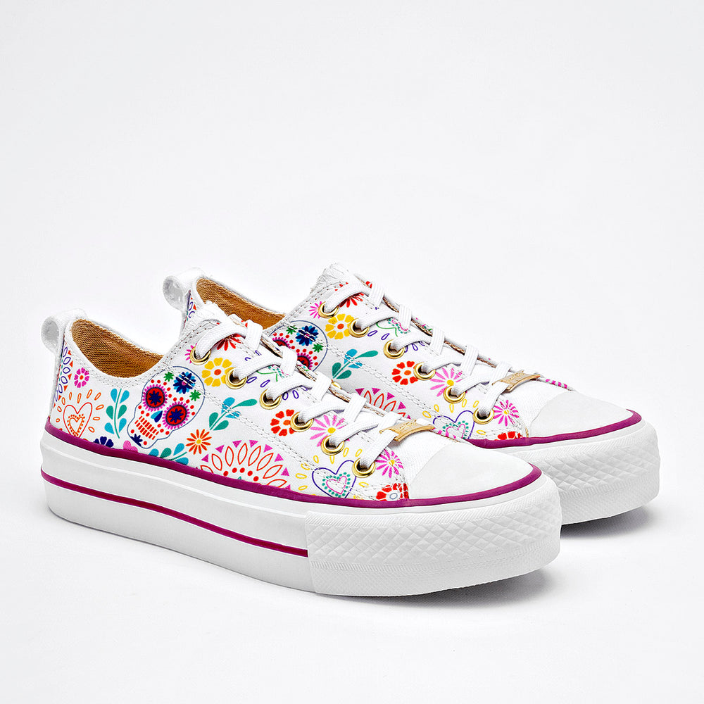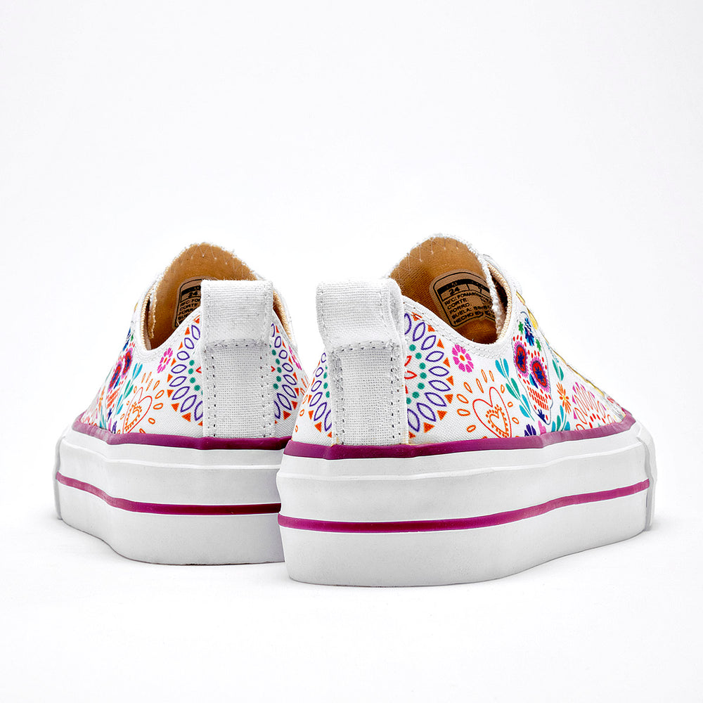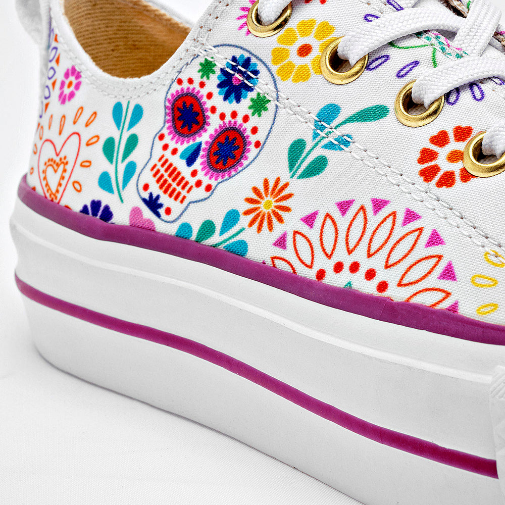 Tenis con plataforma en color blanco, con un diseño vibrante y lleno de personalidad. Están confeccionadas en un material de lona que sirve como lienzo para un estampado inspirado en las calaveras de azúcar y motivos florales, con una paleta de colores variada. La suela es de plataforma, con un detalle en color púrpura, lo que aporta altura y un toque de moda.