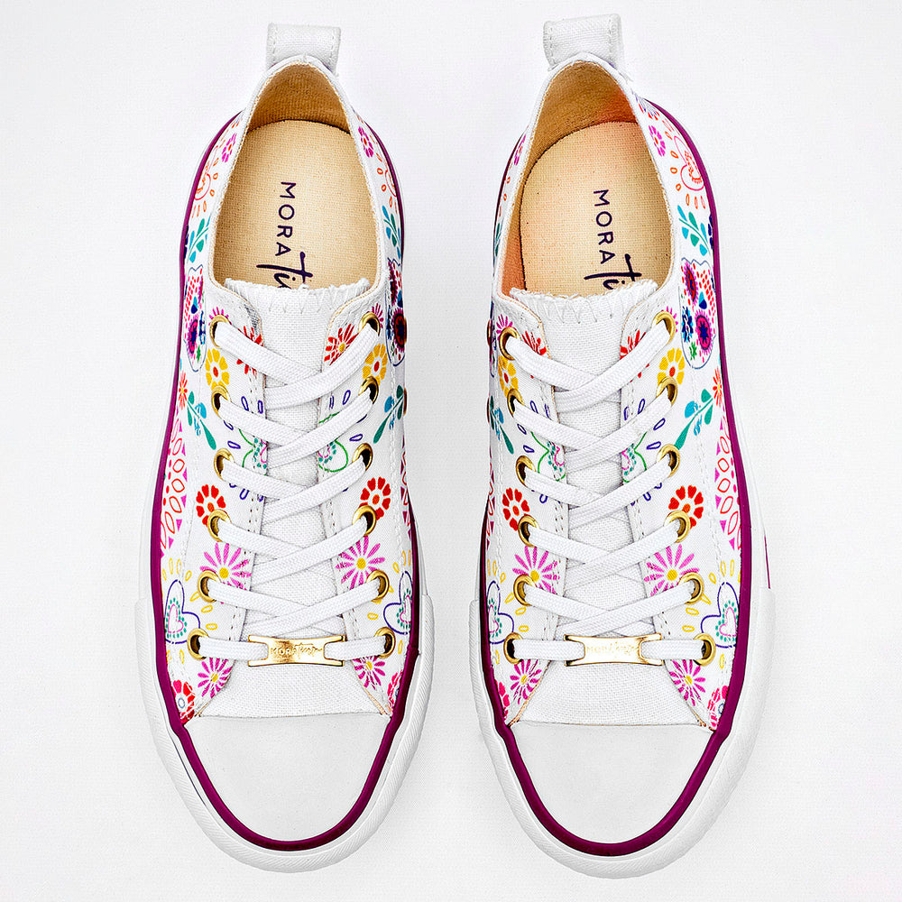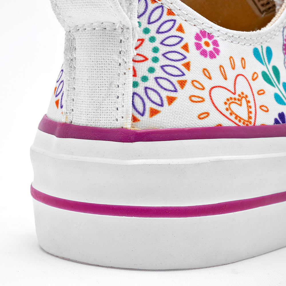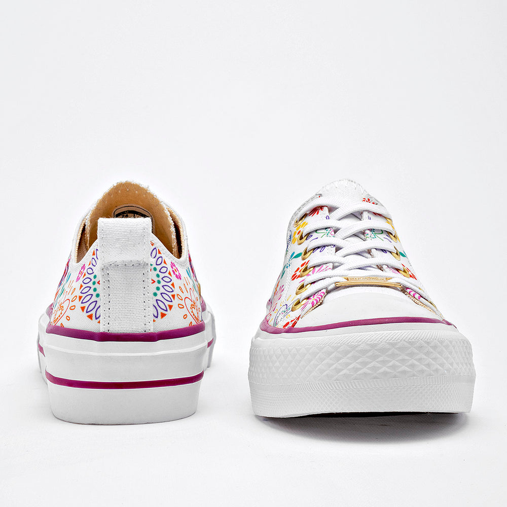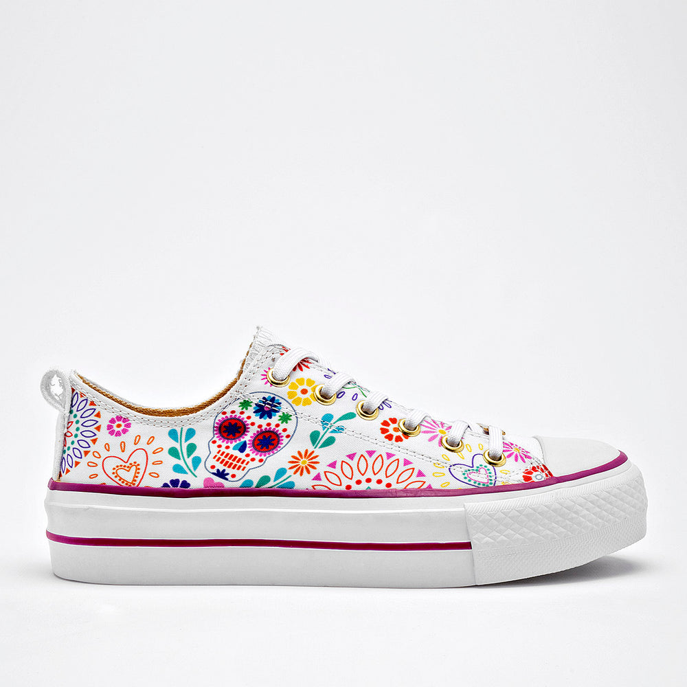 Tenis con plataforma en color blanco, con un diseño vibrante y lleno de personalidad. Están confeccionadas en un material de lona que sirve como lienzo para un estampado inspirado en las calaveras de azúcar y motivos florales, con una paleta de colores variada. La suela es de plataforma, con un detalle en color púrpura, lo que aporta altura y un toque de moda.