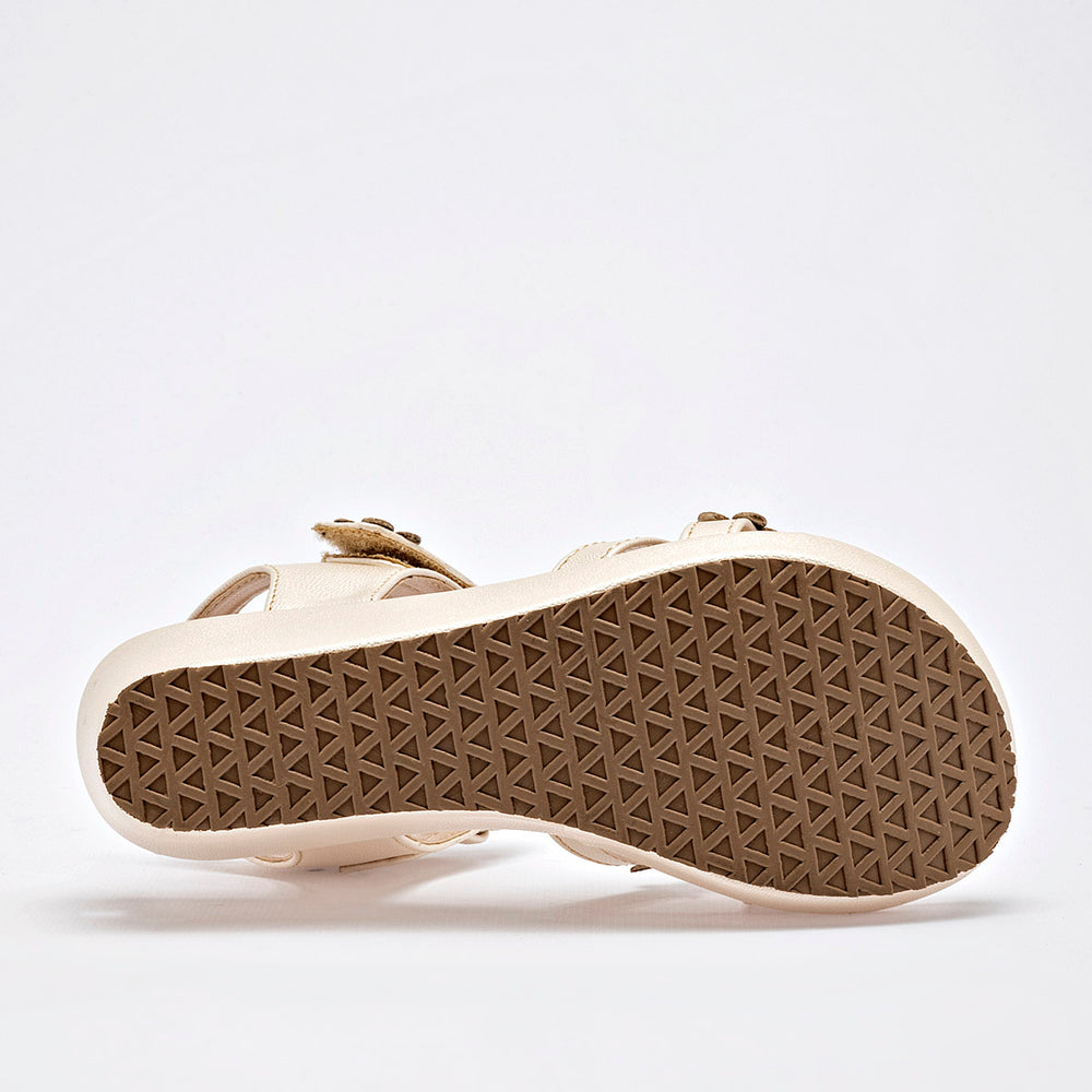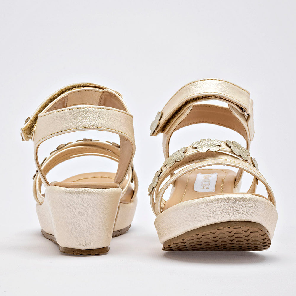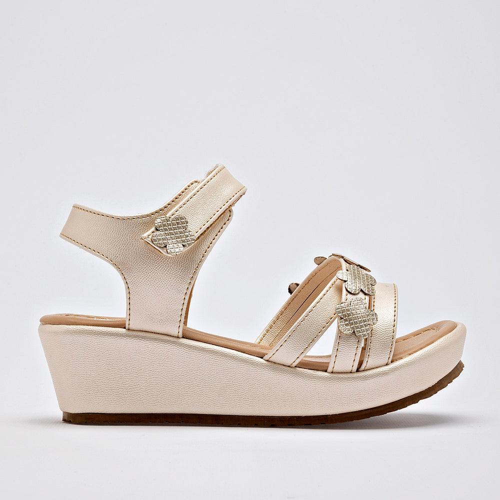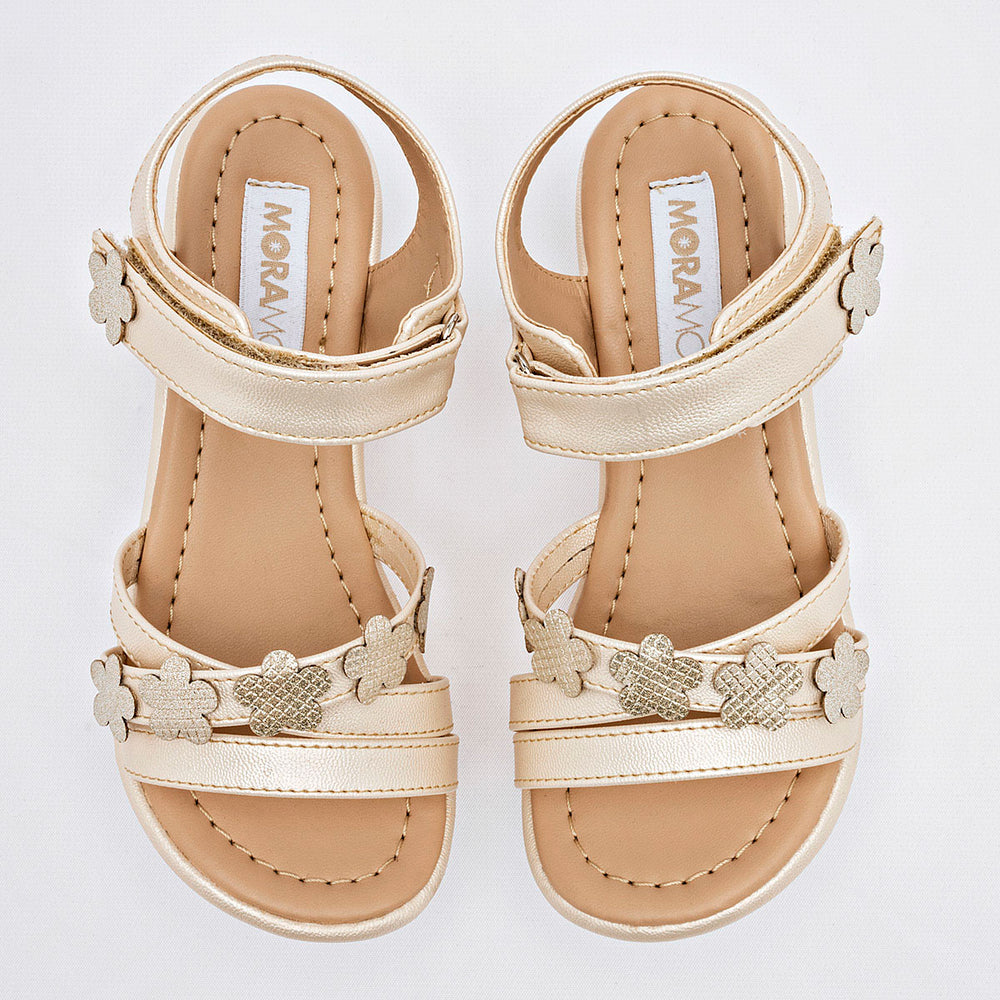 Una sandalia encantadora y moderna que combina estilo y comodidad para las más pequeñas. Confeccionada en un material sintético de acabado metálico en un elegante color champaña estas sandalias son perfectas para cualquier ocasión. El diseño presenta dos tiras frontales adornadas con delicadas flores troqueladas y con glitter, que añaden un toque de fantasía y glamour. La tira superior tiene un práctico y seguro cierre de velcro, lo que facilita que las niñas puedan calzarse y descalzarse por sí mismas.