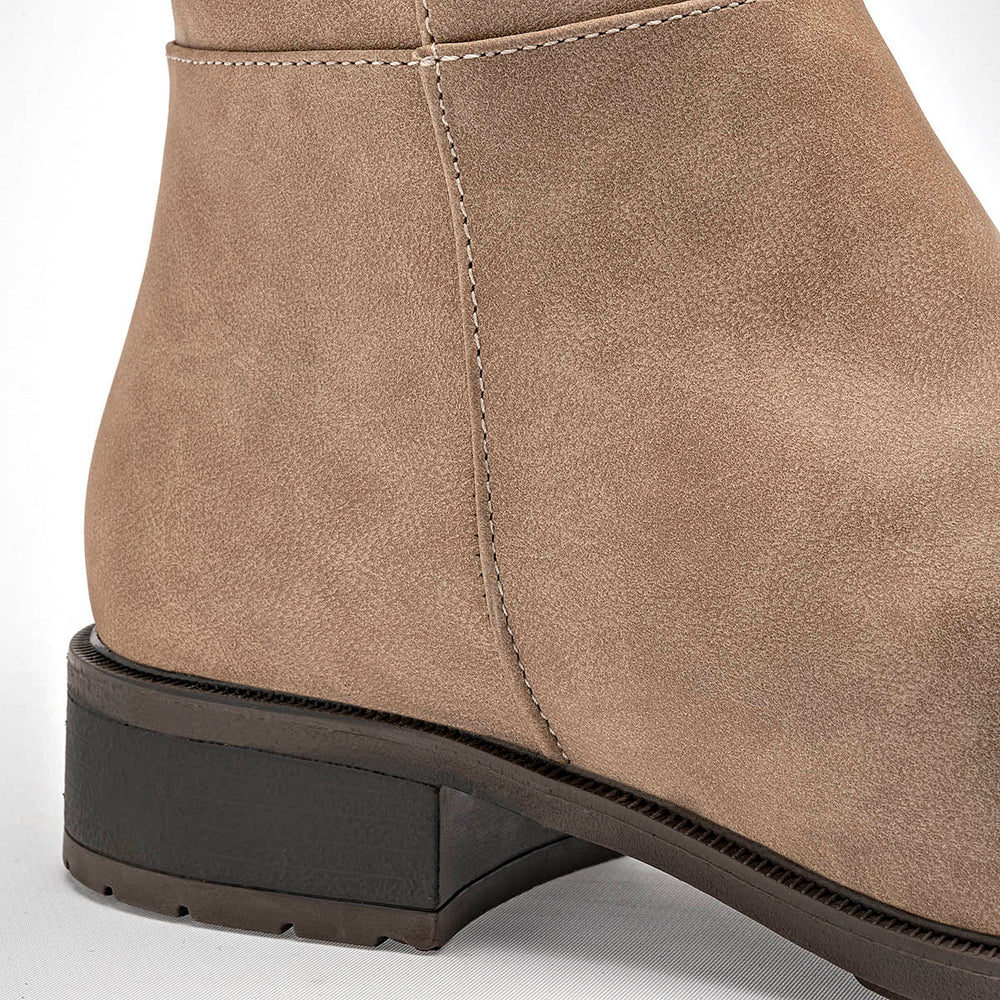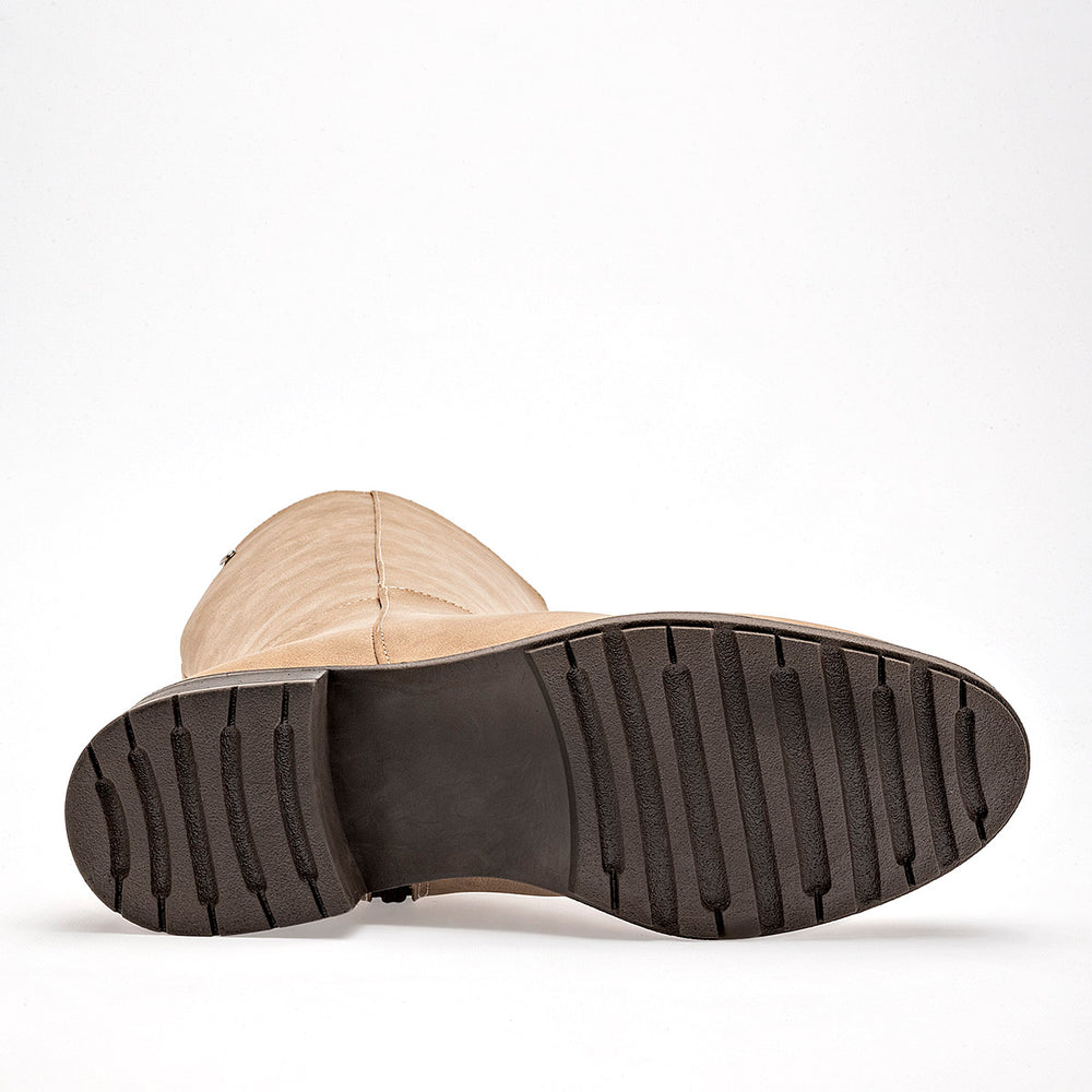 Confeccionadas en un suave material de gamuza, su diseño de caña alta se extiende hasta justo por debajo de la rodilla, ofreciendo una silueta estilizada y limpia. La textura aterciopelada del material les confiere un aspecto sofisticado y cálido. Para un calce práctico y sencillo, cuentan con un cierre lateral para un mayor ajuste y comodidad