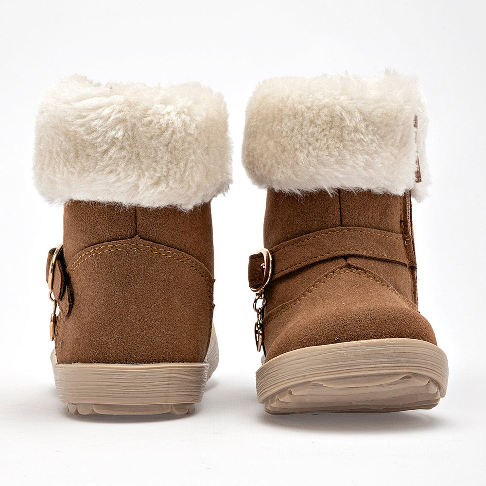 El cuerpo principal es de gamuza sintética o un material similar. La suela es de un tono beige a juego. El puño superior es de pelo sintético de color crema o blanco.