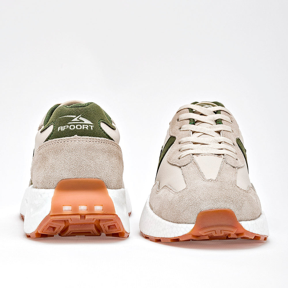 Tenis de corte bajo, con una combinación de es en tonos neutros como , claro y verde oliva oscuro. Presenta una mezcla de materiales como ante y material sintético liso. El logo distintivo de la en verde oscuro está visible en el lateral. La suela es robusta y de , con una suela exterior de goma de que se extiende hasta la punta.