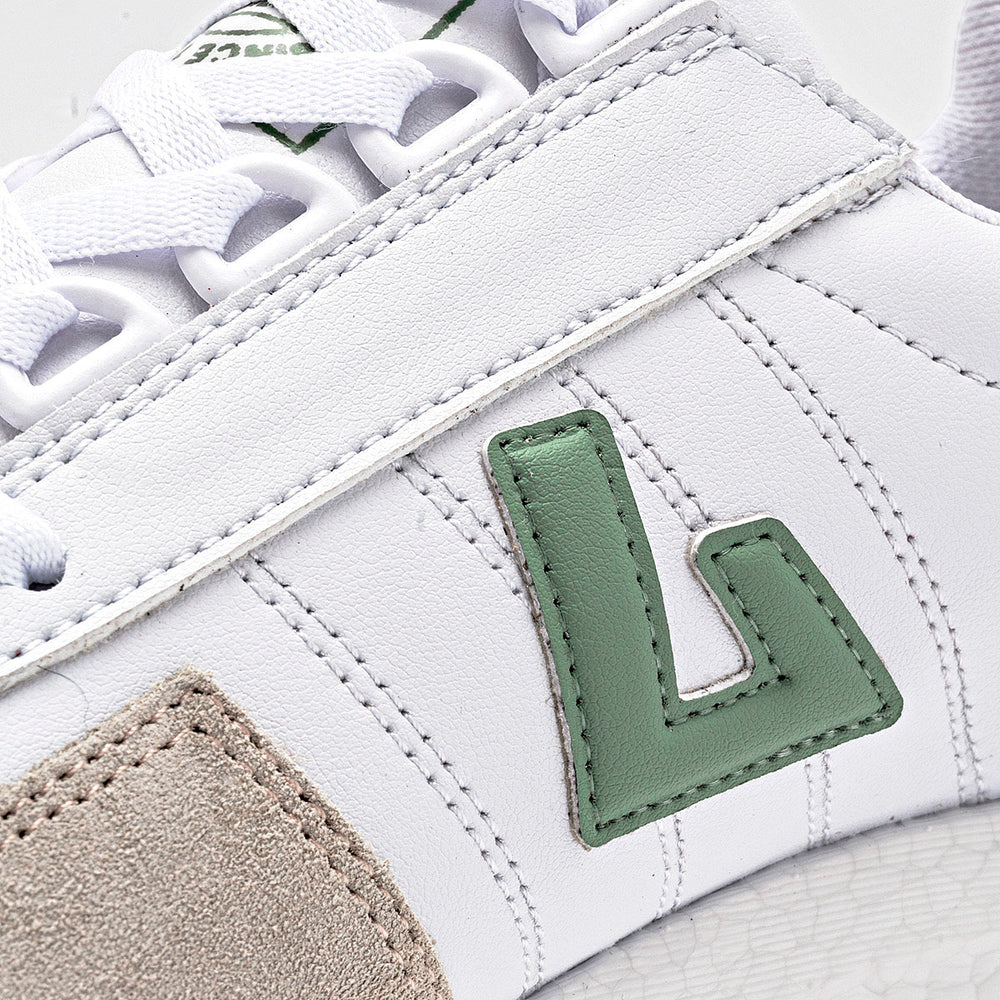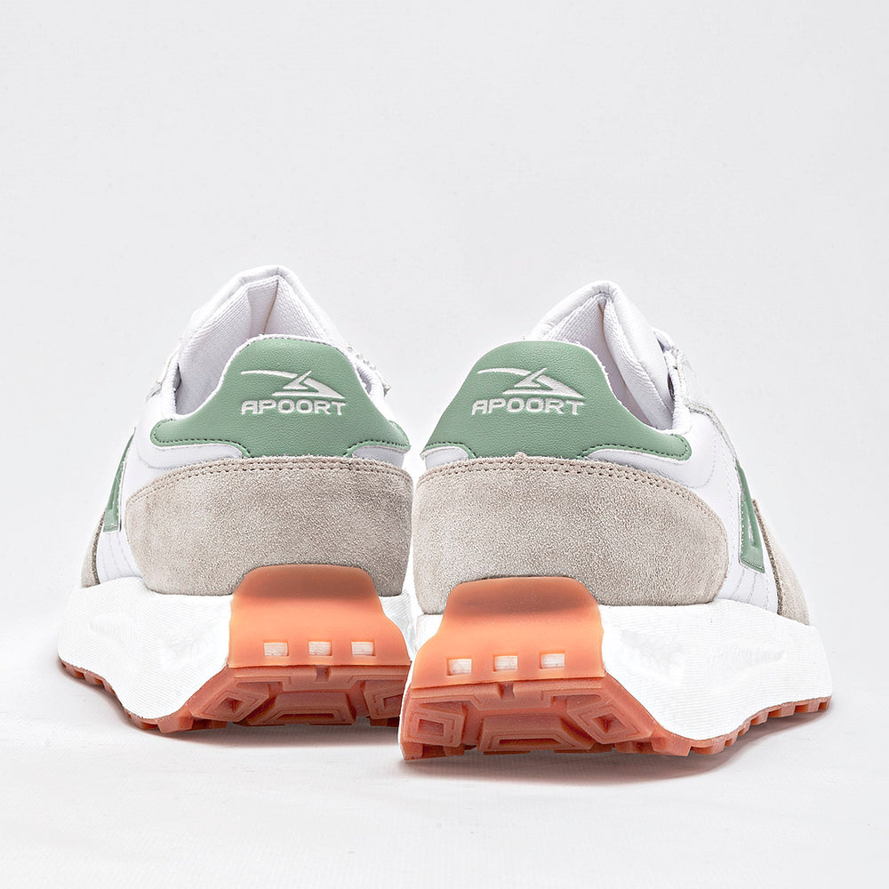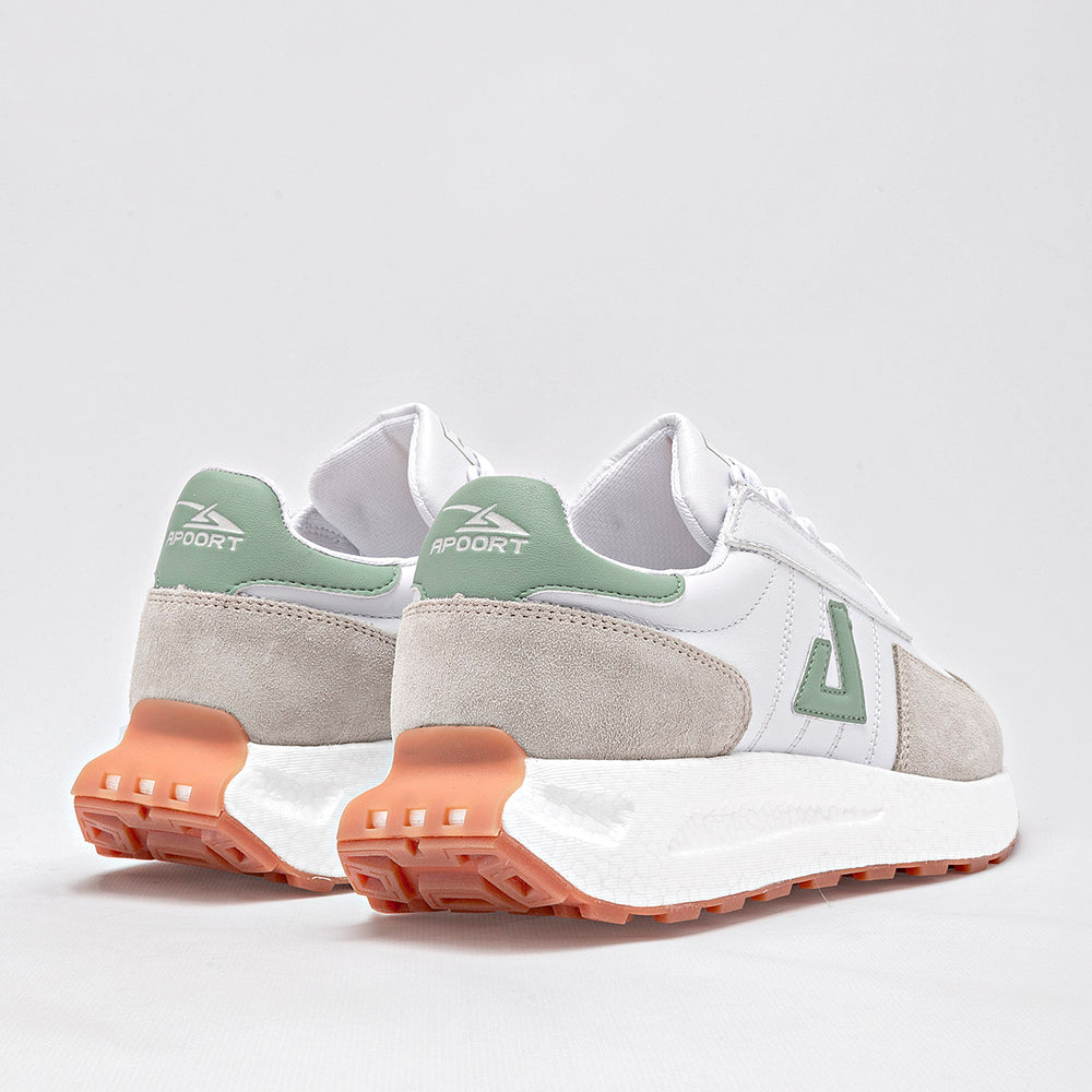 Tenis con un diseño que combina materiales y texturas. La paleta de colores incluye el blanco, un tono gris claro y un suave verde menta o salvia. El calzado presenta una combinación de piel sintética blanca, paneles de gamuza gris en la puntera y los laterales, y detalles en verde en la parte trasera del tobillo y en el logo lateral. La suela es de plataforma de 4 cm, gruesa y texturizada.