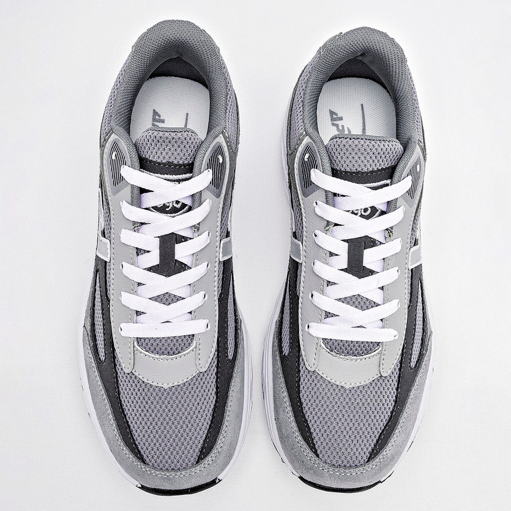 Presenta un diseño de múltiples paneles con una mezcla de materiales, incluyendo malla transpirable y ante. El logo de la marca en color gris claro está visible en el lateral, con un contorno blanco. La suela es robusta y de color blanco, con la parte inferior de goma negra. Los cordones son blancos, creando un contraste llamativo.