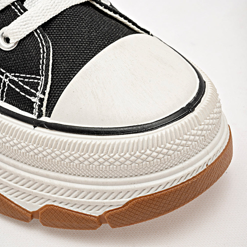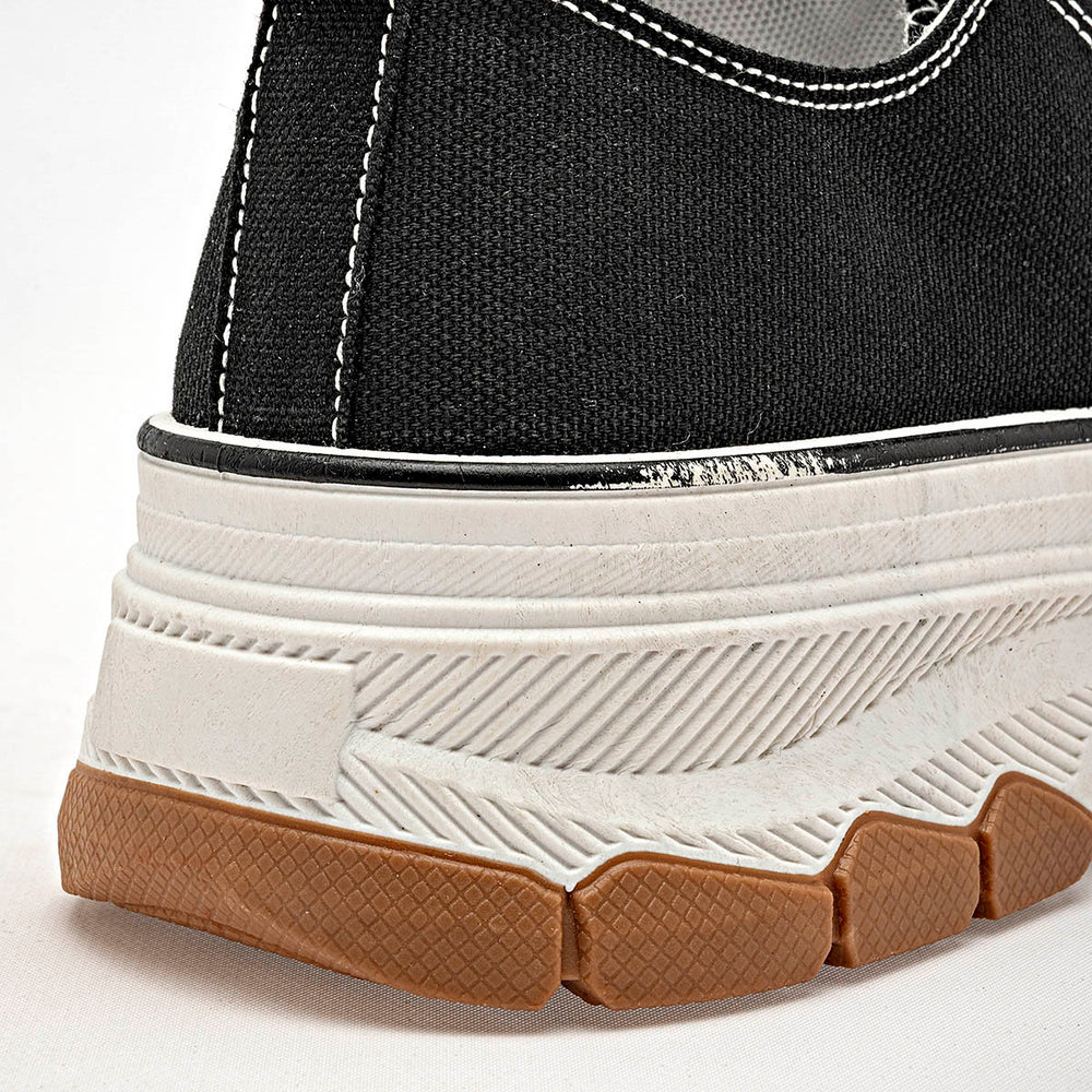 Tenis de lona de corte bajo, con un diseño que fusiona el estilo clásico de los tenis de lona con una suela de plataforma robusta. La plataforma es de 4 cm y tiene una suela de color blanco con una franja negra decorativa, y una base de goma con un patrón de tracción que contrasta y le da un toque moderno.