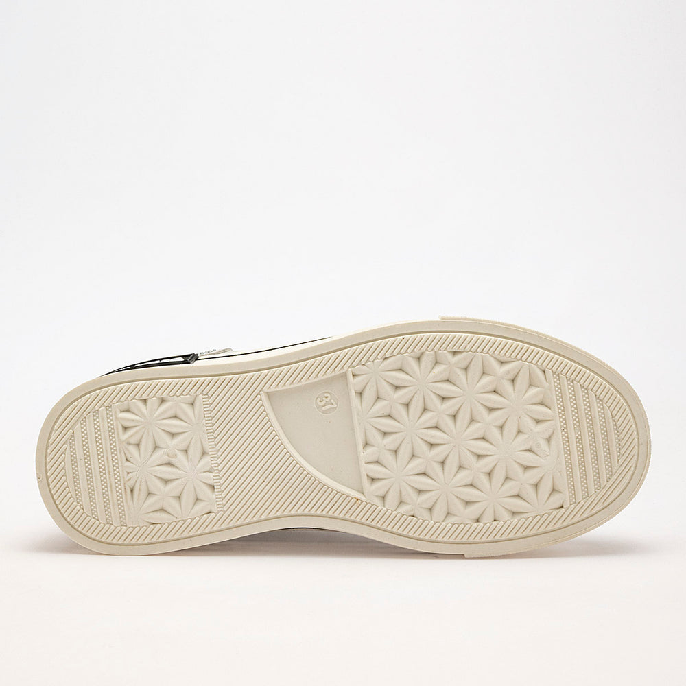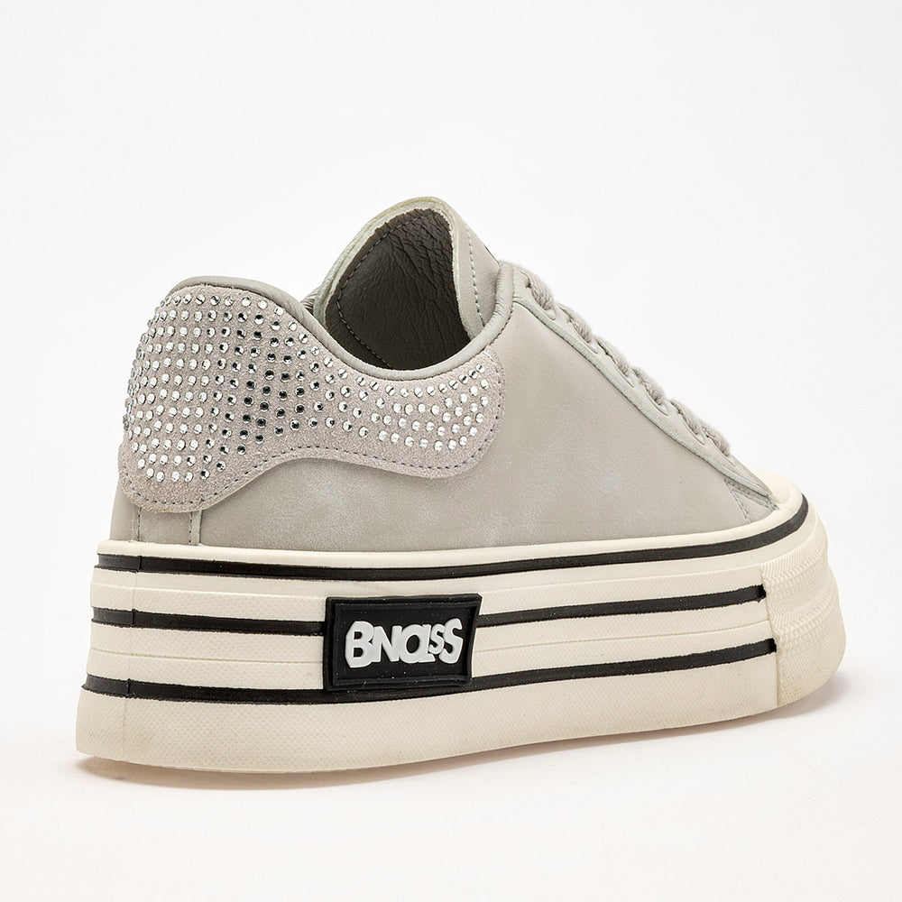 El diseño es llamativo, con una plataforma de 6 cm que presenta dos franjas horizontales en negro. La puntera es de goma en color crema. Un detalle distintivo es el panel trasero del tobillo, que está completamente cubierto de pedrería o brillos plateados, lo que le da un toque glamuroso.