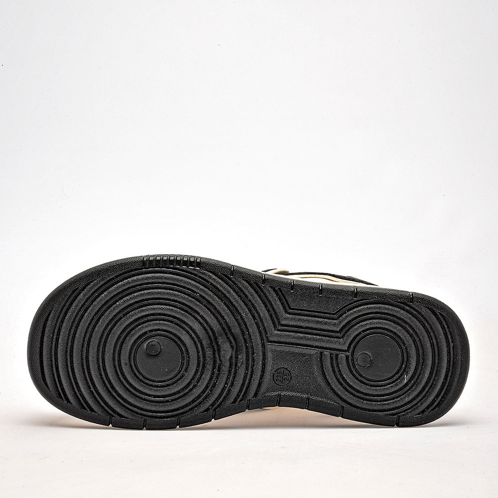 El calzado presenta una plataforma de 3 cm de altura, con un diseño robusto y de doble capa. El material principal es sintético, combinando paneles de color latte y negro. Un detalle distintivo son los recortes laterales en forma de corazón. Los cordones son gruesos y presentan un patrón de zigzag, lo que añade un toque llamativo y moderno.