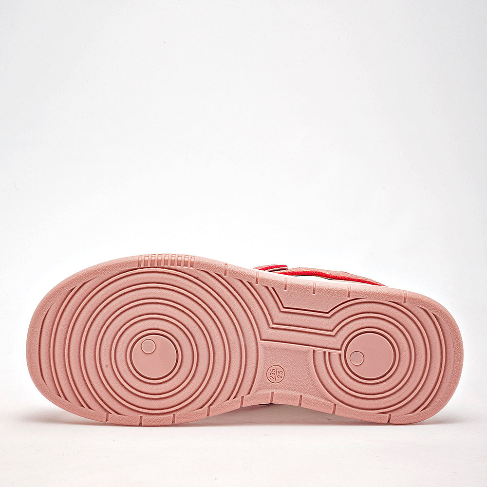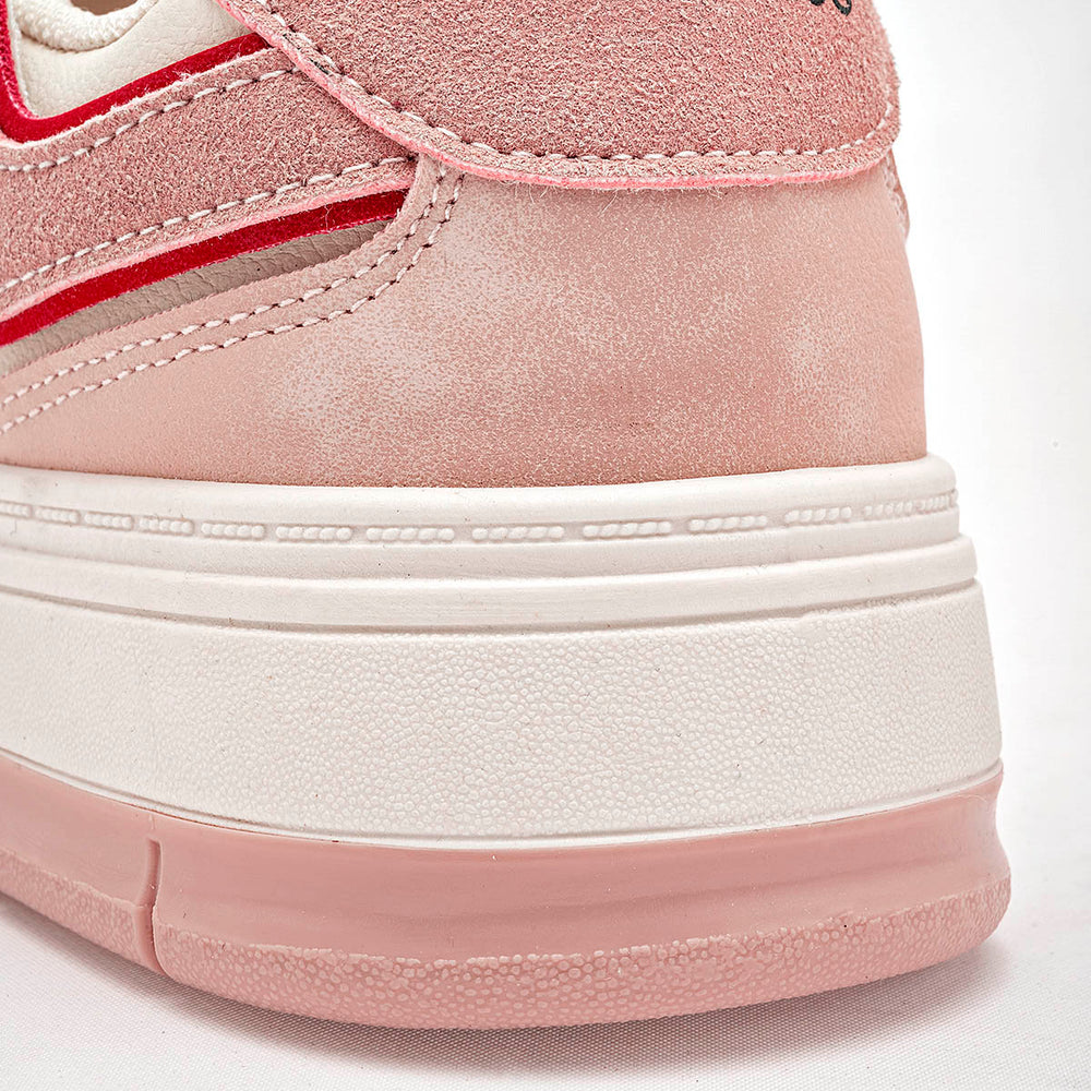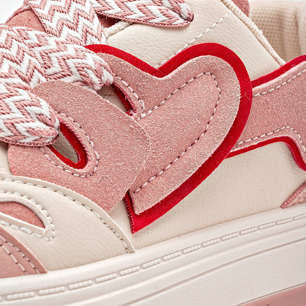 El calzado presenta una suela tipo plataforma de 3 cm de altura, con un diseño robusto y de doble capa. El material principal es sintético, combinando paneles de color latte y rosa. Un detalle distintivo son los recortes laterales en forma de corazón. Los cordones son gruesos y presentan un patrón de zigzag, lo que añade un toque llamativo y moderno.