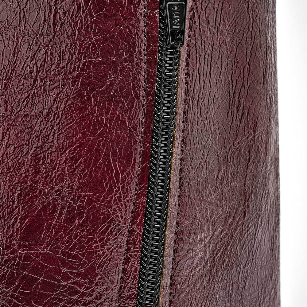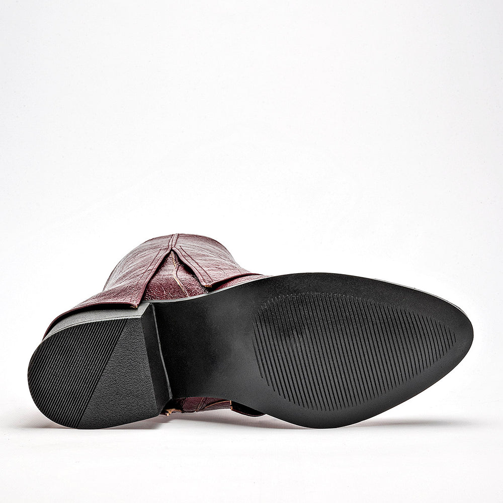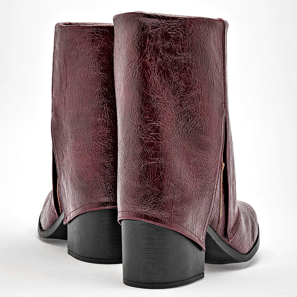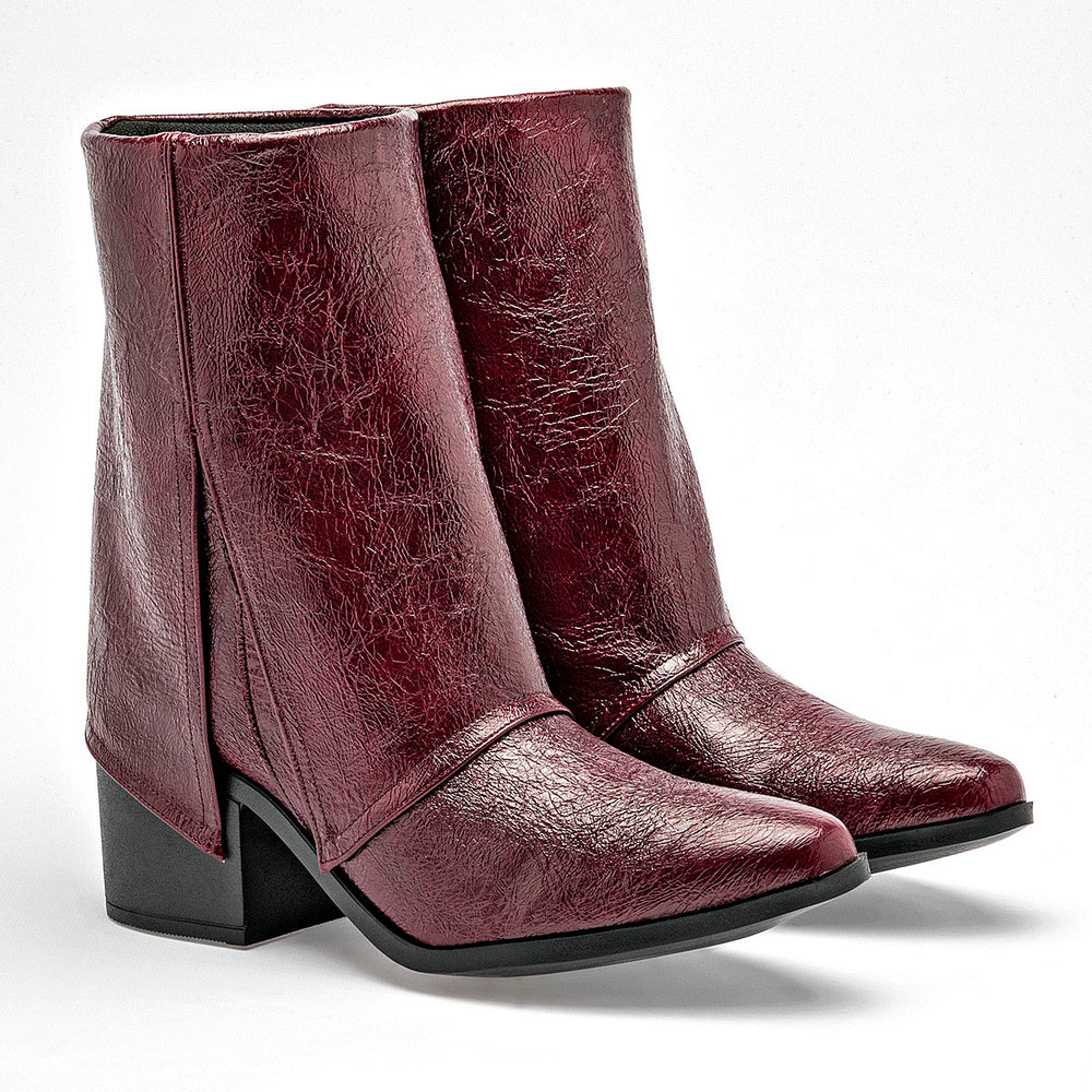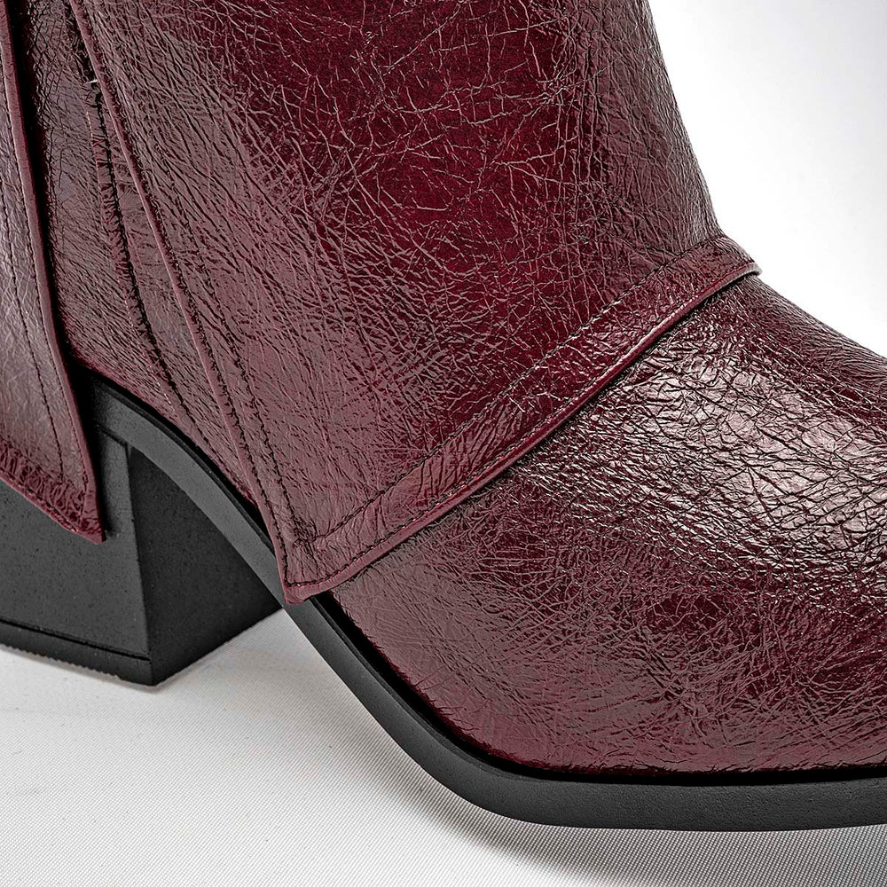 Este botín está confeccionado en un material que simula piel con un acabado texturizado y ligeramente brillante. La característica más notable es su caña, que parece estar diseñada para lucir doblada o arrugada en la parte frontal y lateral. Además, presenta una abertura lateral que añade un toque original y permite mayor movimiento. Incorpora un tacón de bloque de altura media, que proporciona estabilidad y comodidad para el uso prolongado.