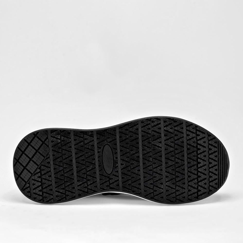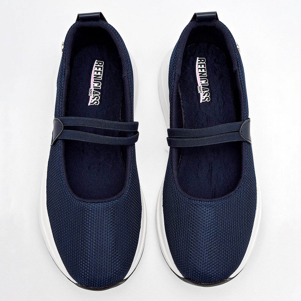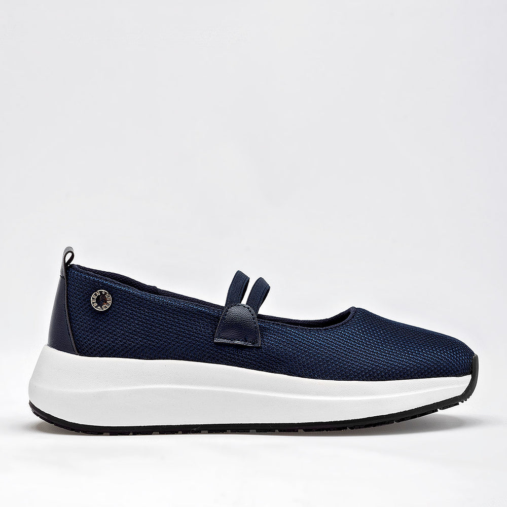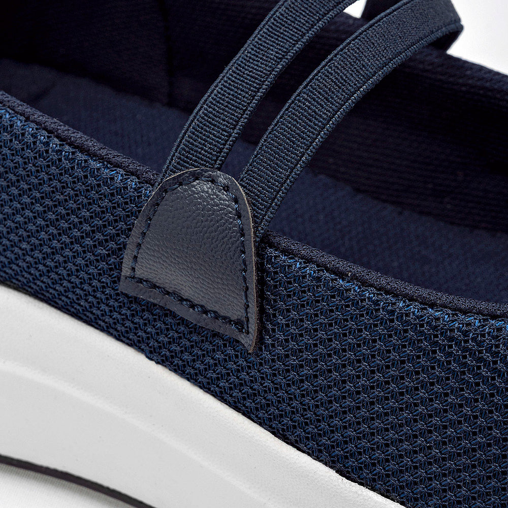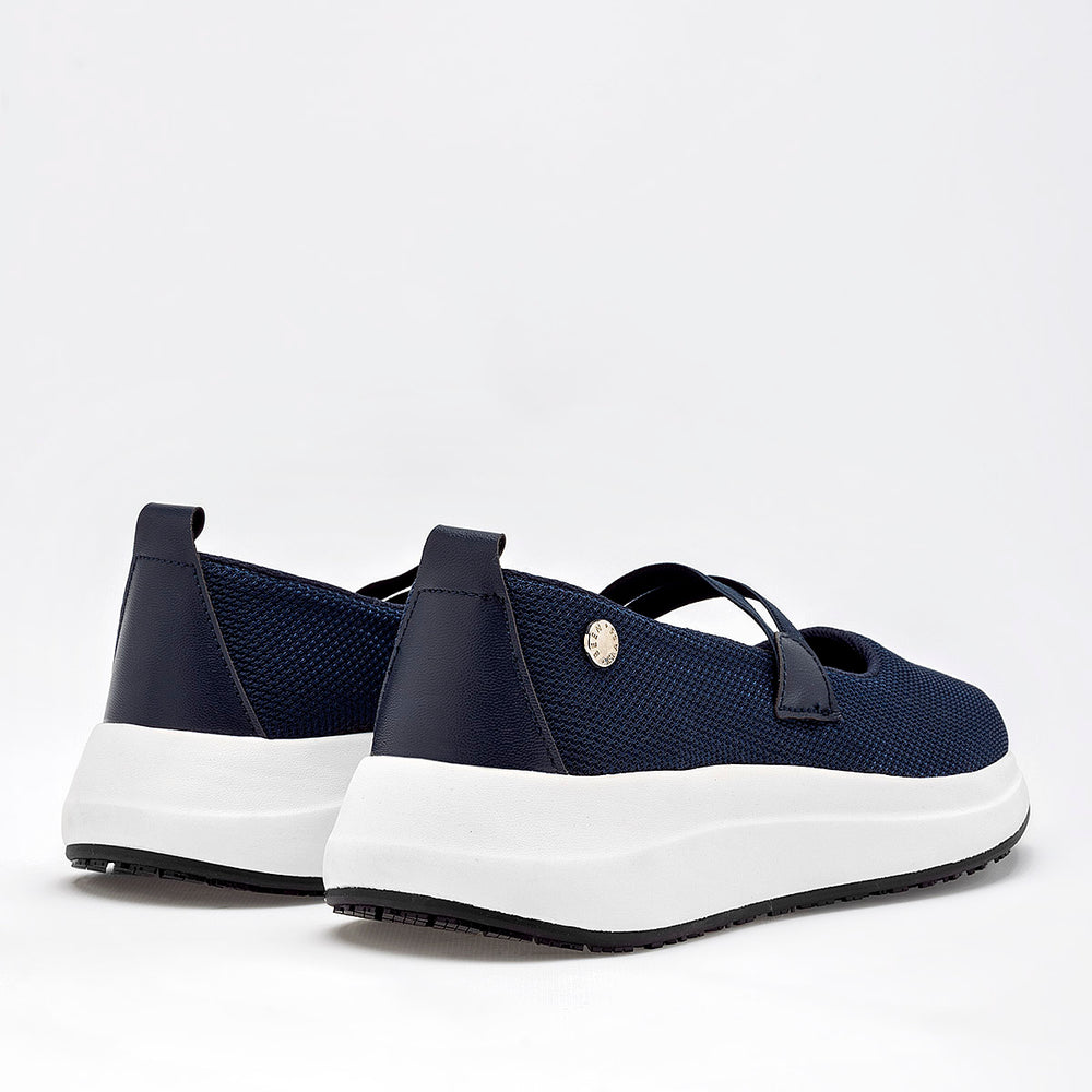 Este zapato esta confeccionado en un tejido de malla transpirable. Cuenta con una suela de plataforma de 4 cm de altura, en color blanco, con una base de goma negra antideslizante. Unas finas tiras cruzadas sobre el empeine, en material sintético, le dan un toque femenino y un mejor ajuste.