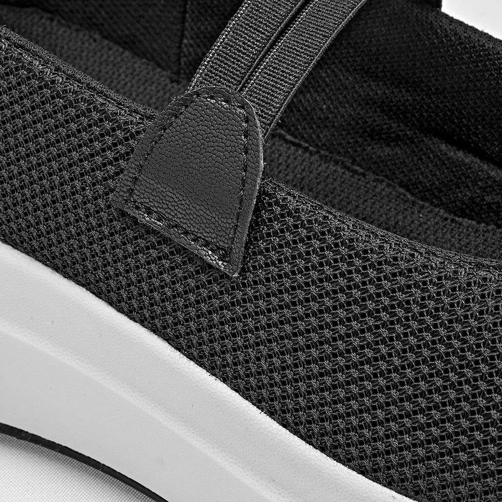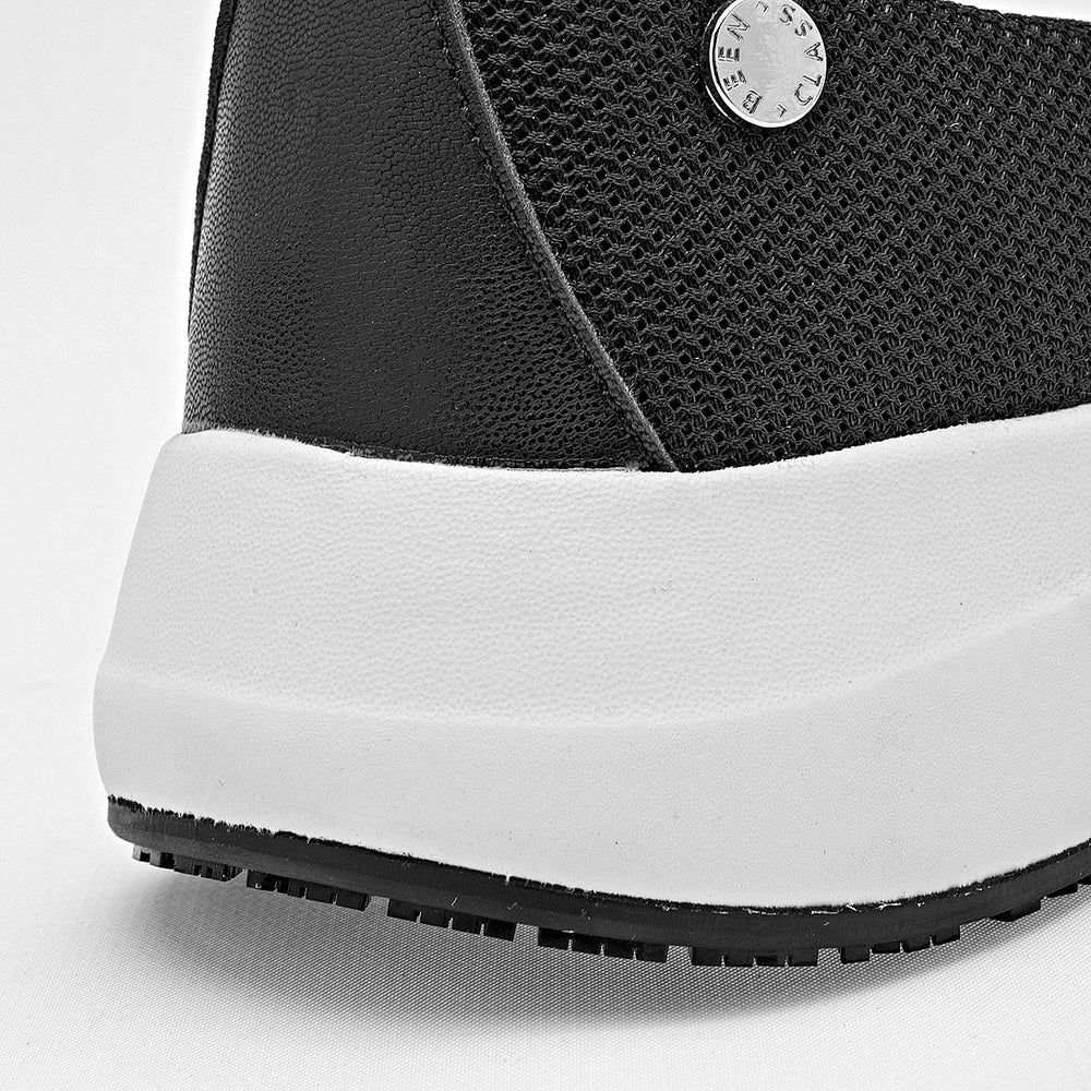 Este zapato esta confeccionado en un tejido de malla transpirable. Cuenta con una suela de plataforma de 4 cm de altura, en color blanco, con una base de goma negra antideslizante. Unas finas tiras cruzadas sobre el empeine, en material sintético, le dan un toque femenino y un mejor ajuste.