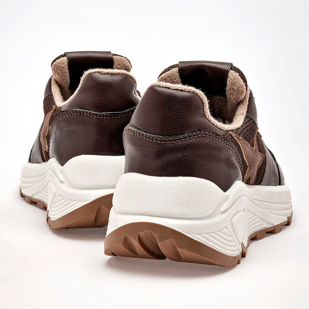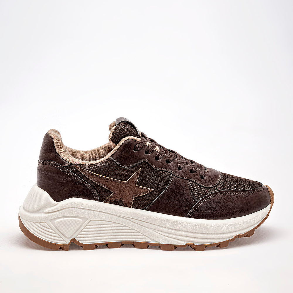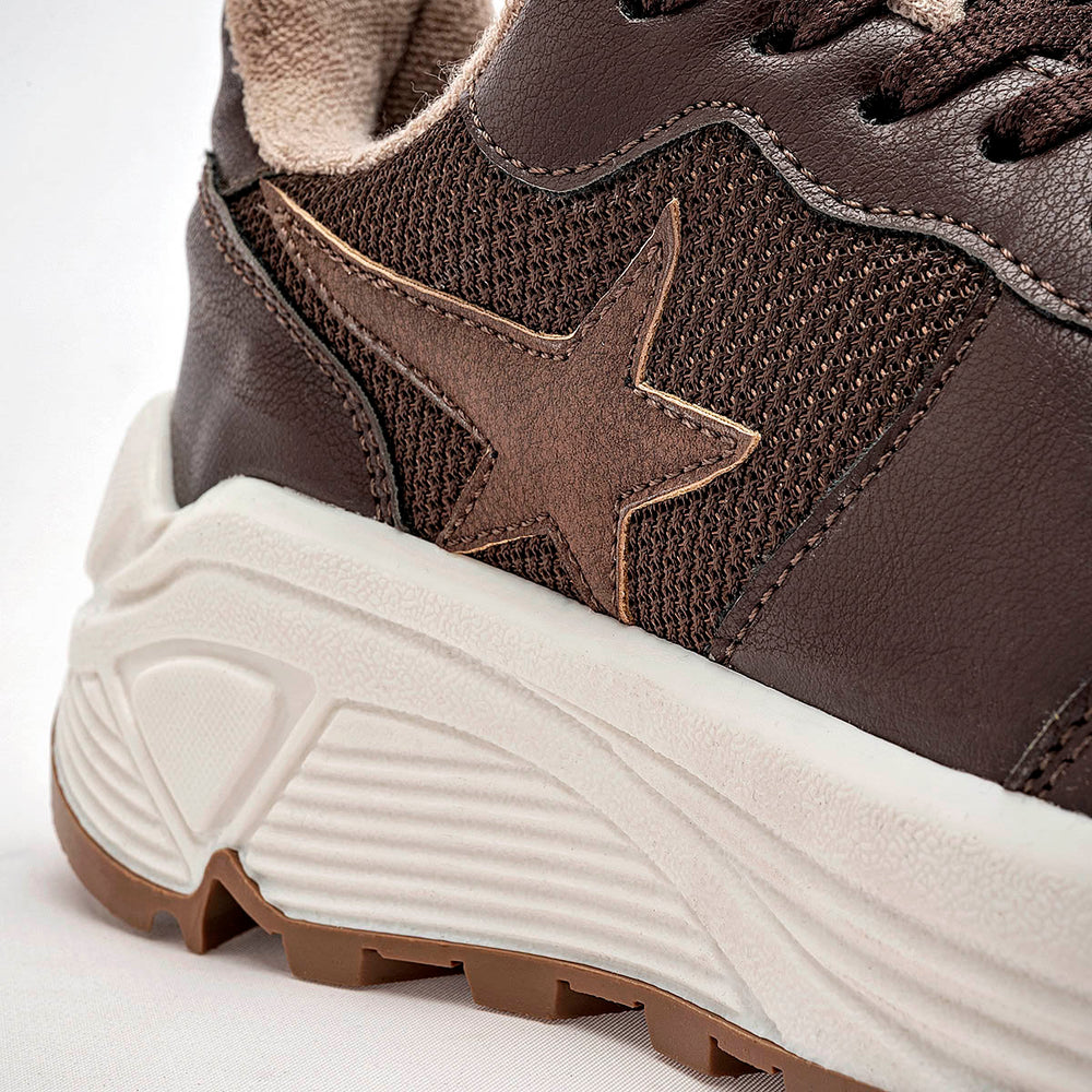 El calzado presenta una base de malla transpirable. Un logo en forma de estrella, en un acabado tipo gamuza adorna el lateral. La suela es de plataforma de 5 cm, robusta y con un diseño ondulado en color crema y una base de goma de tracción. El interior y los cordones son de color marrón, y la lengüeta también lleva el logo de la marca.