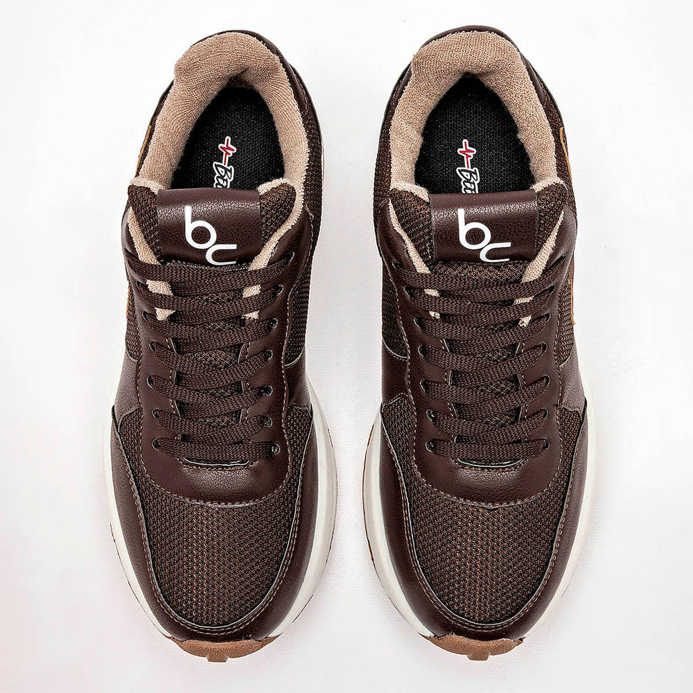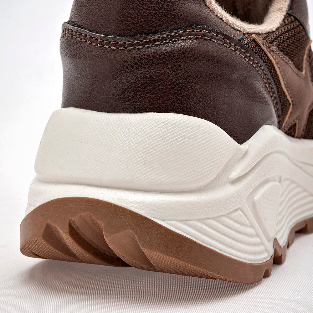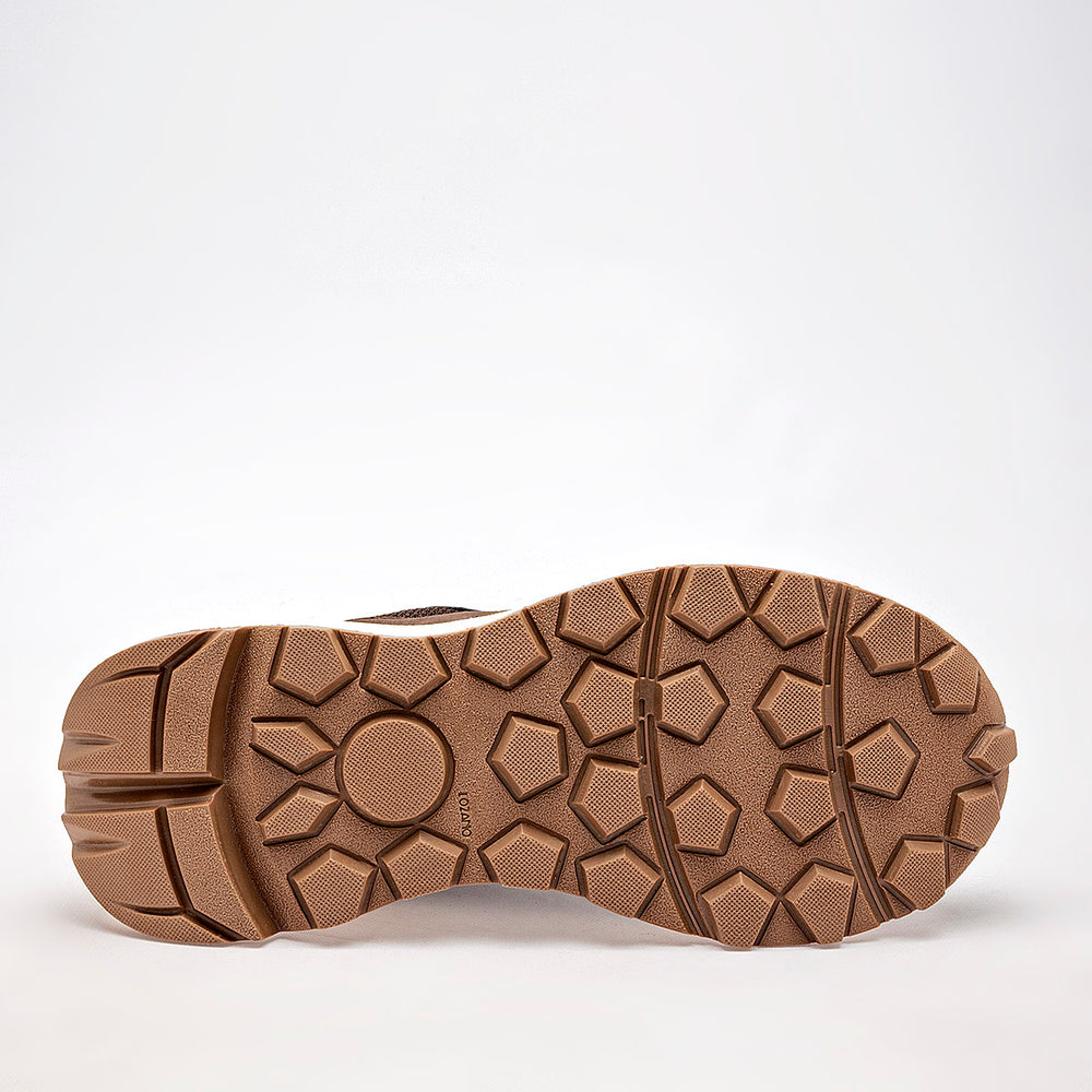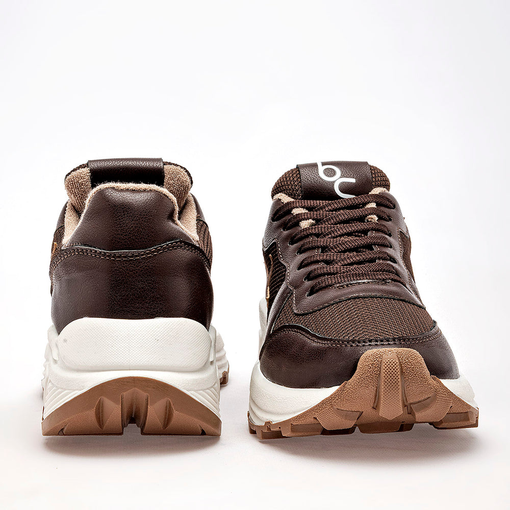 El calzado presenta una base de malla transpirable. Un logo en forma de estrella, en un acabado tipo gamuza adorna el lateral. La suela es de plataforma de 5 cm, robusta y con un diseño ondulado en color crema y una base de goma de tracción. El interior y los cordones son de color marrón, y la lengüeta también lleva el logo de la marca.