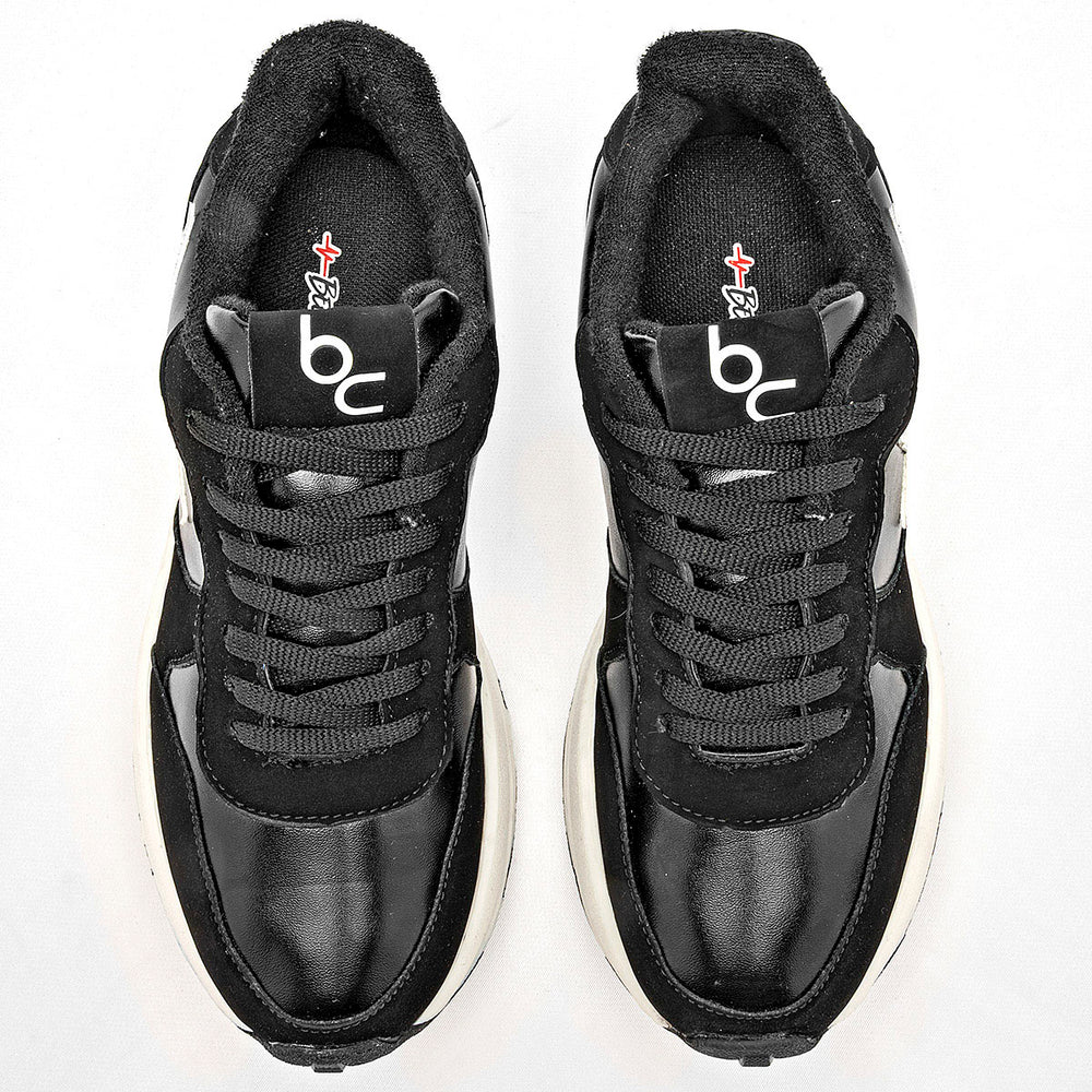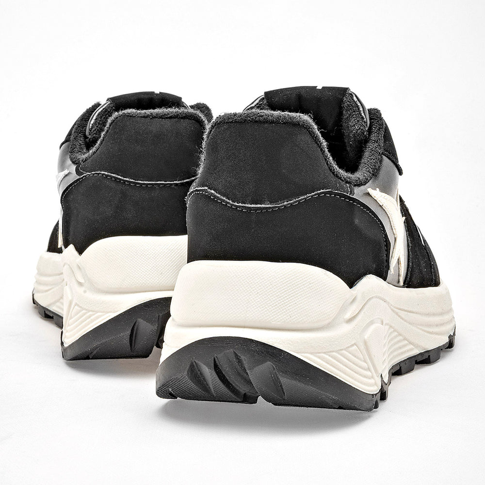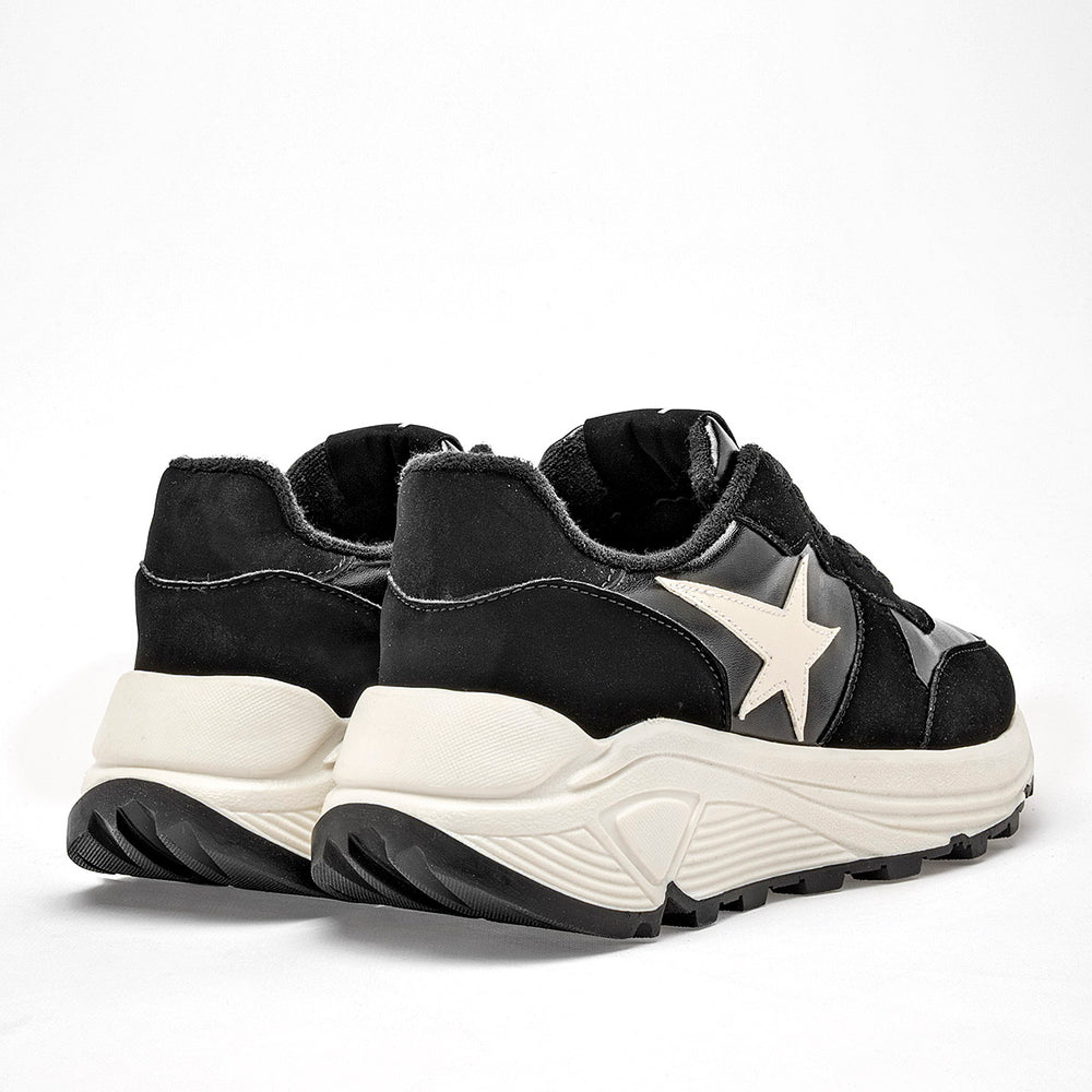 El calzado presenta una base de malla transpirable. Un logo en forma de estrella, en un acabado tipo gamuza adorna el lateral. La suela es de plataforma de 5 cm, robusta y con un diseño ondulado en color crema y una base de goma de tracción. El interior y los cordones son de color negro, y la lengüeta también lleva el logo de la marca.