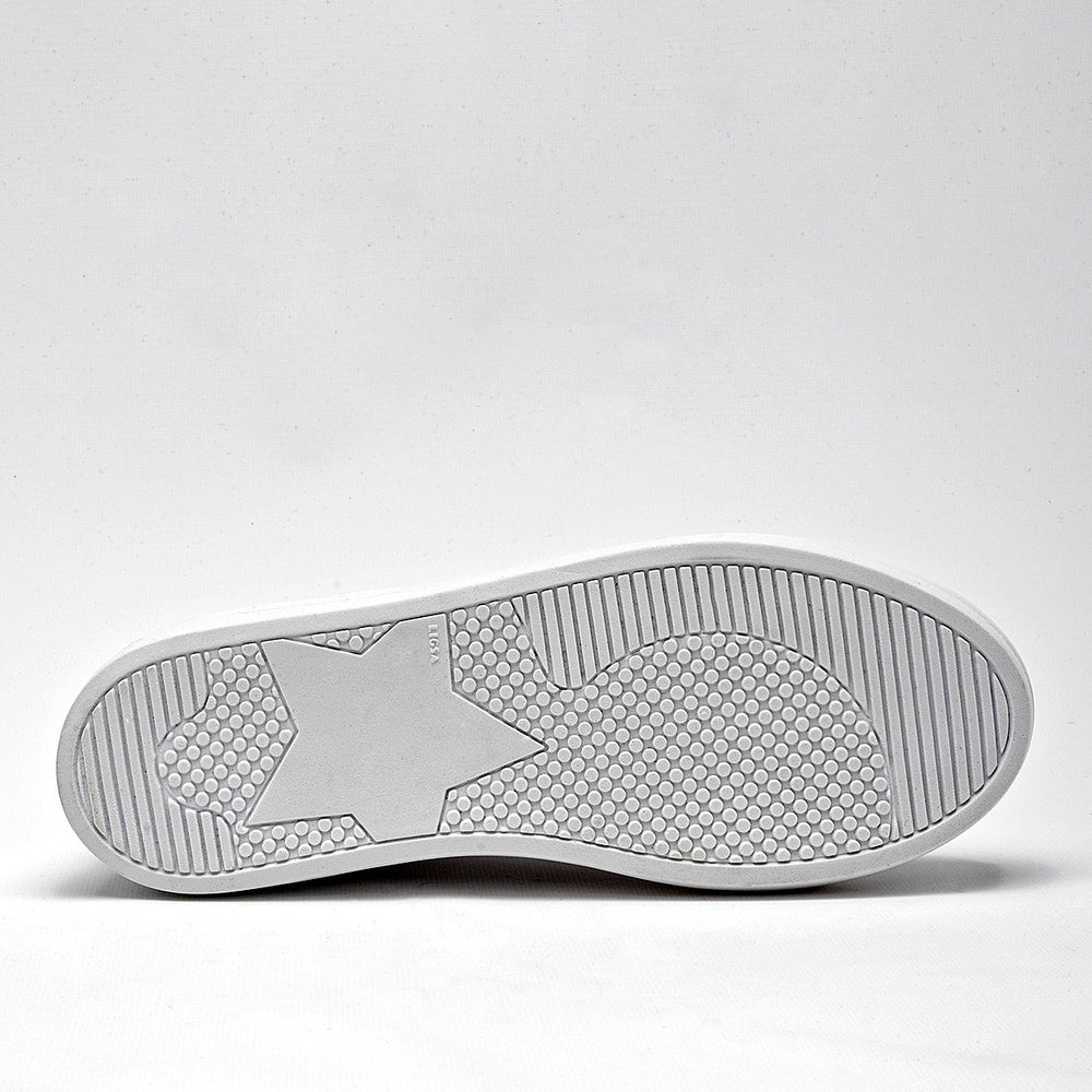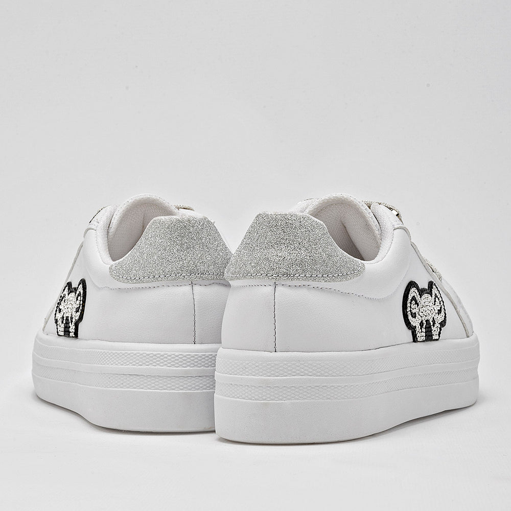 Tenis de plataforma en color blanco, con un diseño casual y divertido. La parte exterior presenta un parche de un koala decorado con pedrería brillante. El talón es de color plateado con acabado de glitter, y los cordones son brillantes. La suela de plataforma mide 4 cm de altura, brindando un estilo moderno y cómodo.