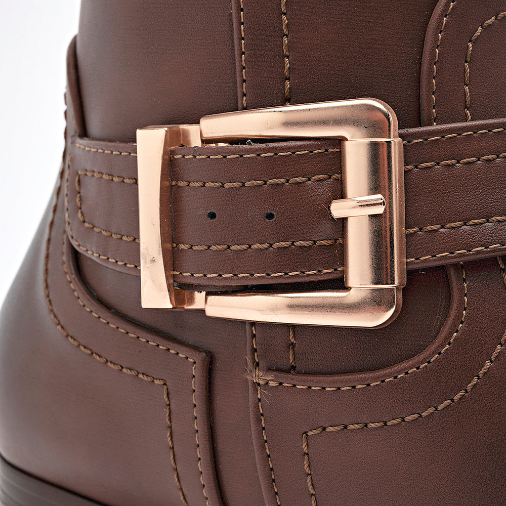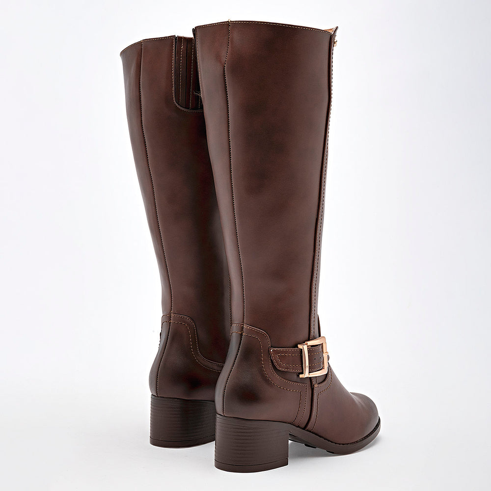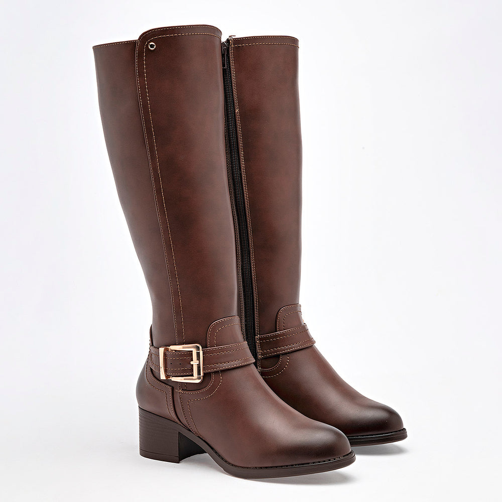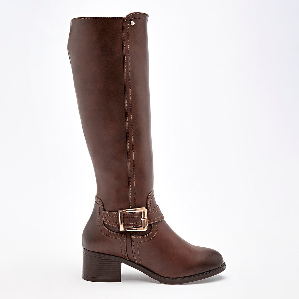 Presenta un diseño de caña alta, con un acabado liso y costuras decorativas que le dan un toque de estilo. En la parte del tobillo, tiene una correa con una hebilla metálica en tono dorado, que añade un detalle elegante. El tacón es ancho y estable, de 5 cm, lo que brinda altura con gran comodidad para el día a día.