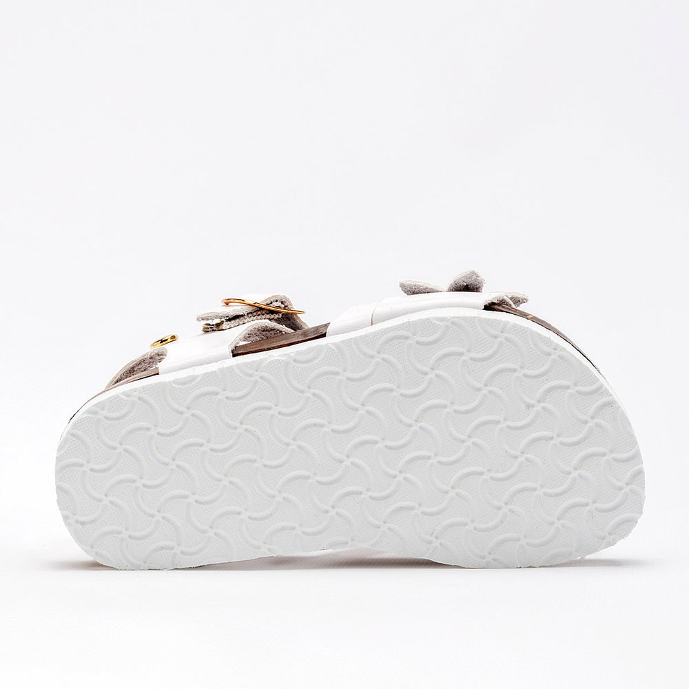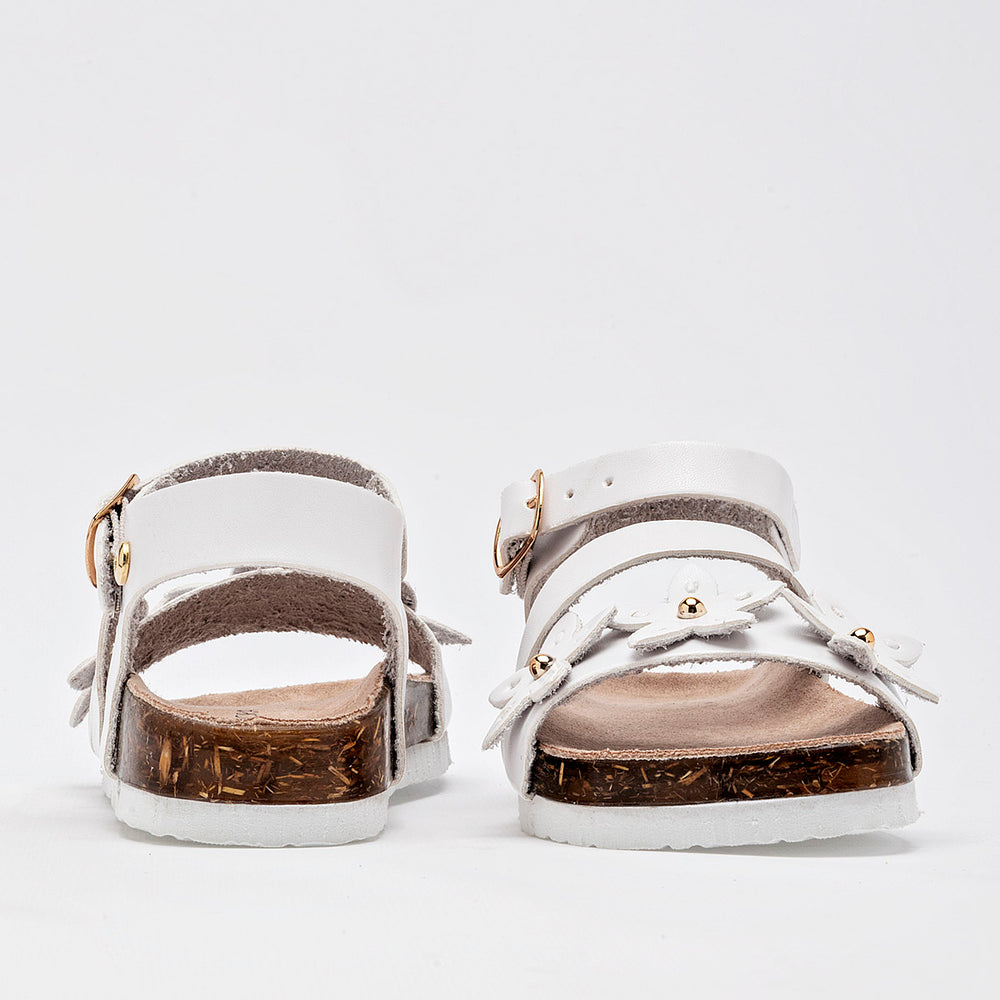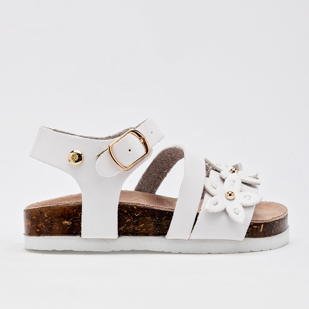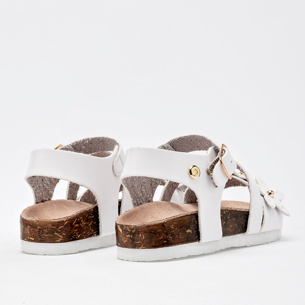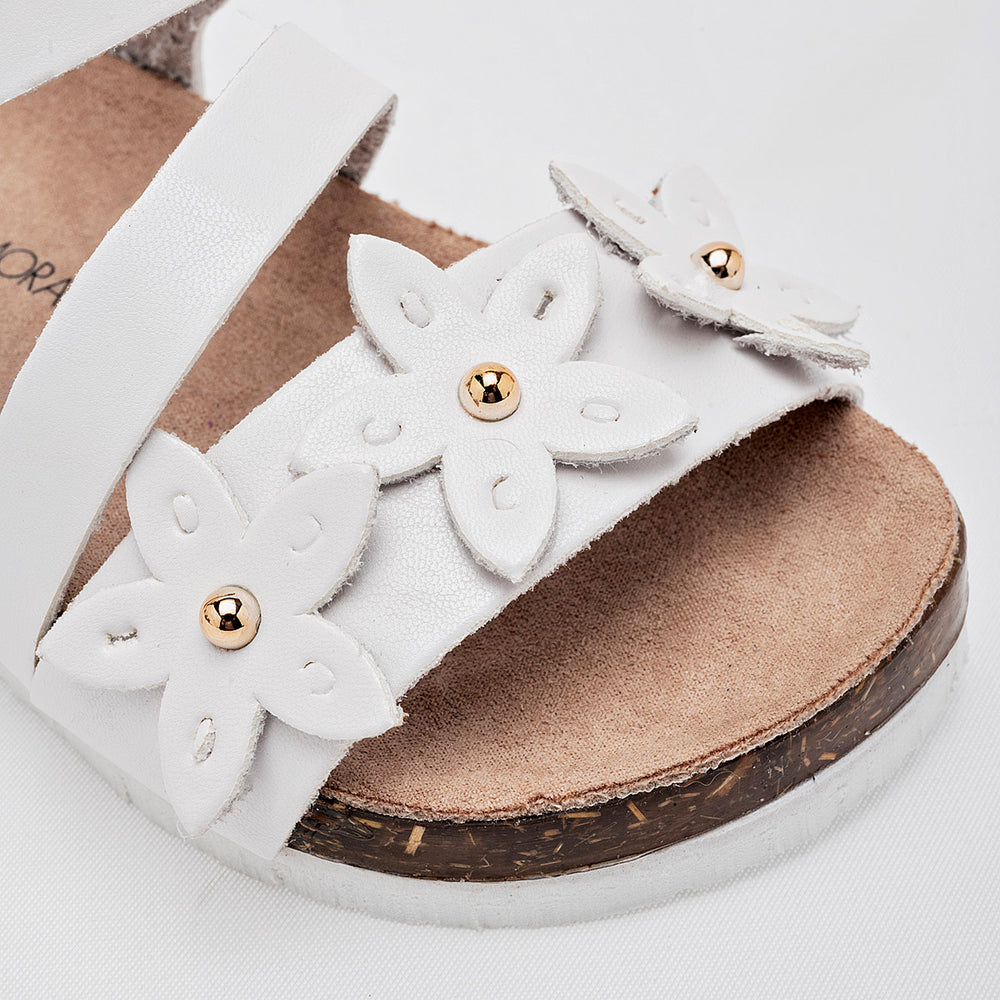 El calzado presenta una suela de tipo corcho, que no solo aporta un toque natural, sino que también ofrece ligereza y comodidad. La parte superior está compuesta por varias tiras de material sintético liso de color blanco, y destaca un adorno floral en la tira del empeine, con detalles de metal dorado en el centro de las flores. Cuentan con una correa ajustable en el tobillo con cierre de hebilla metálica, garantizando un ajuste seguro.