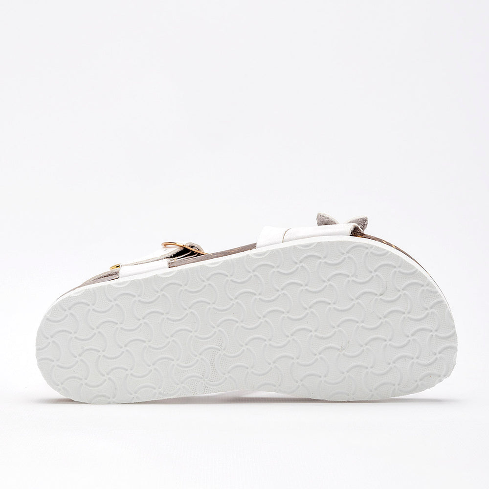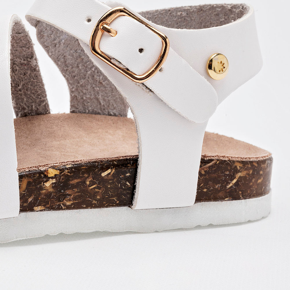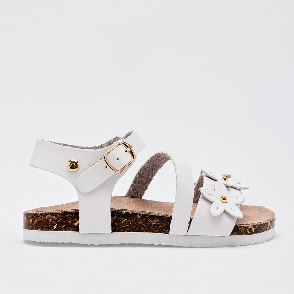 El calzado presenta una suela de tipo corcho, que no solo aporta un toque natural, sino que también ofrece ligereza y comodidad. La parte superior está compuesta por varias tiras de material sintético liso de color blanco, y destaca un adorno floral en la tira del empeine, con detalles de metal dorado en el centro de las flores. Cuentan con una correa ajustable en el tobillo con cierre de hebilla metálica, garantizando un ajuste seguro.