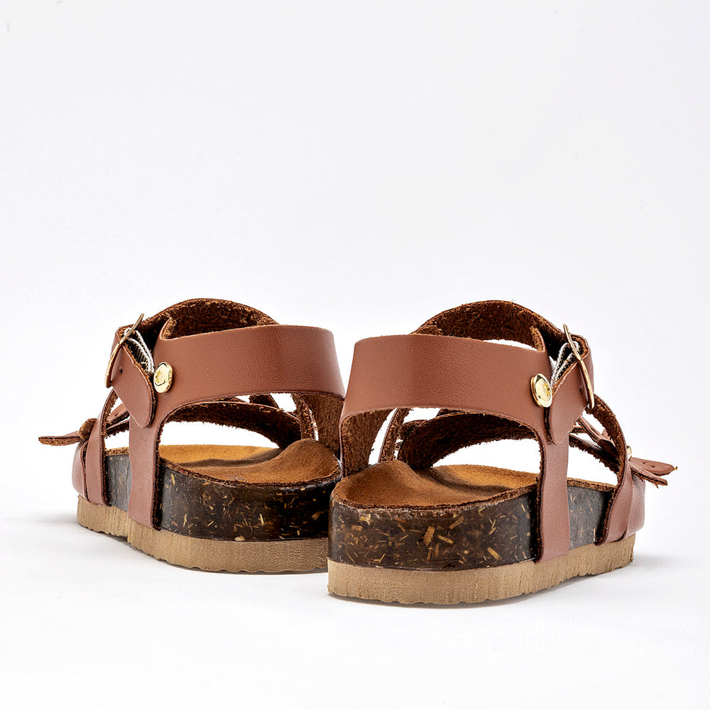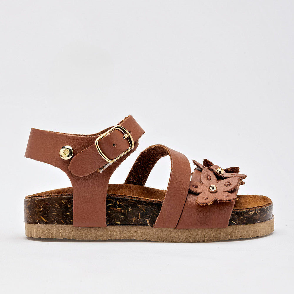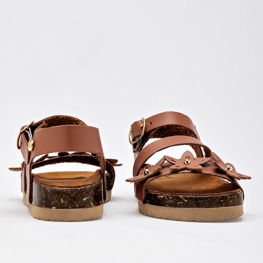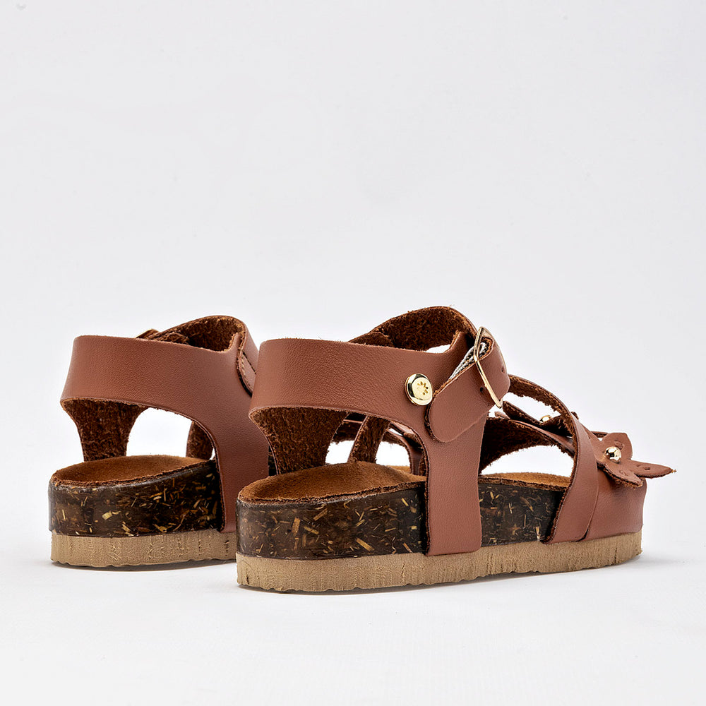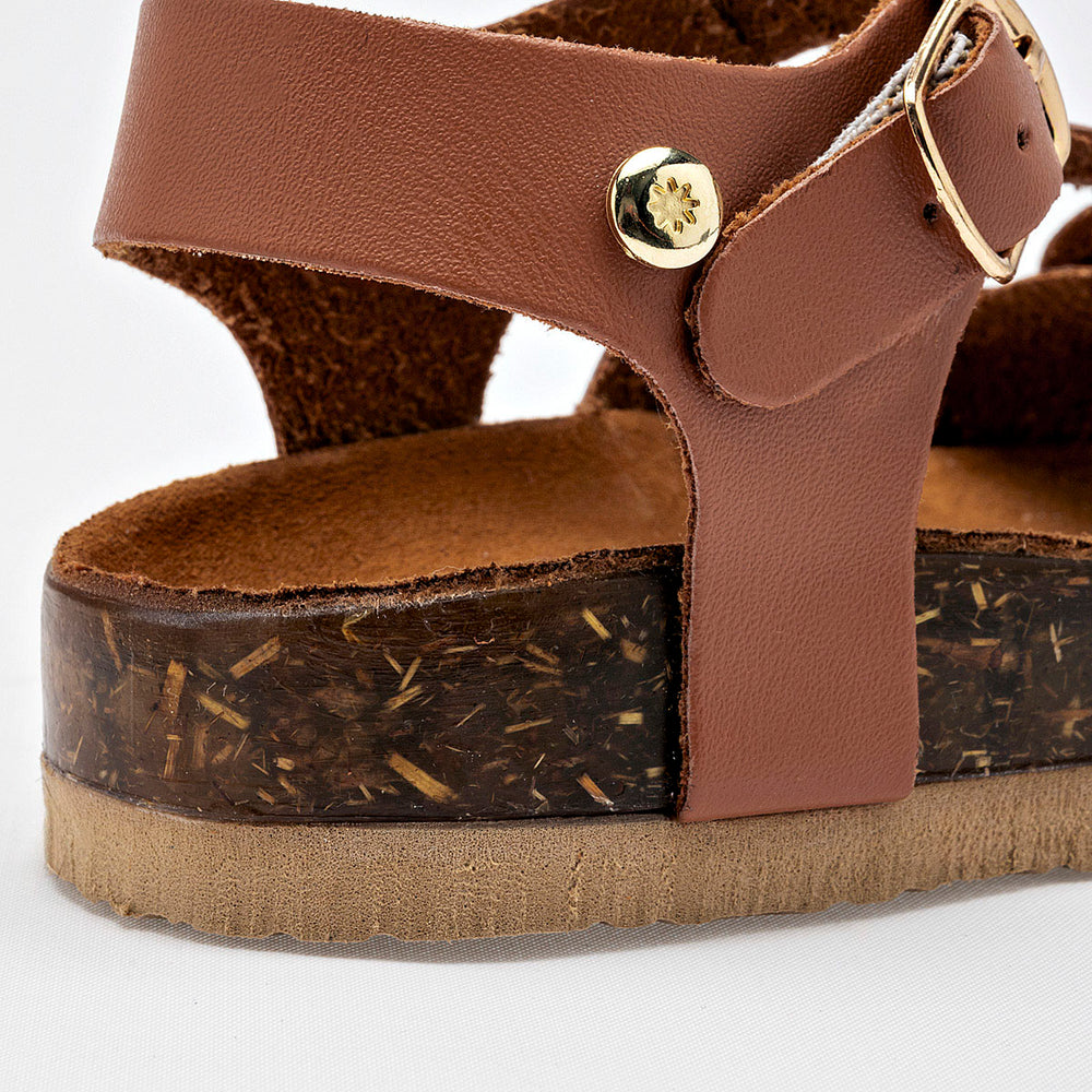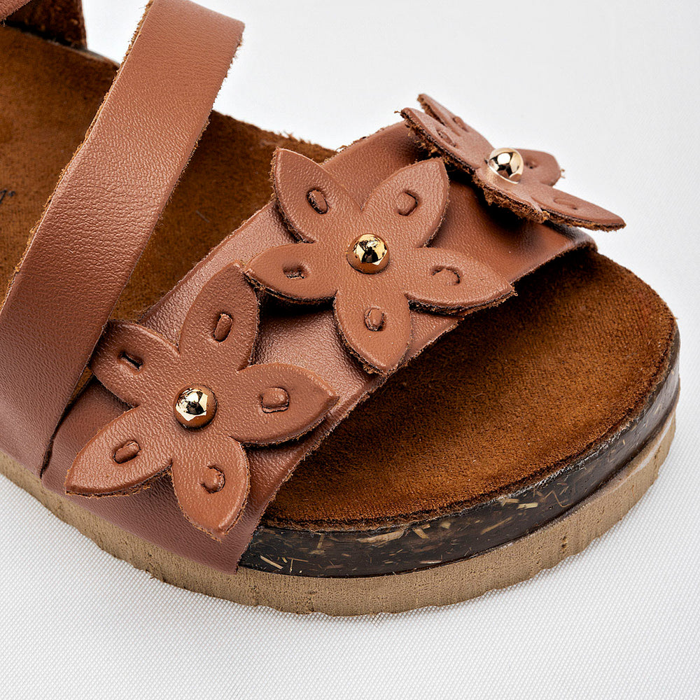 El calzado presenta una suela de tipo corcho, que no solo aporta un toque natural, sino que también ofrece ligereza y comodidad. La parte superior está compuesta por varias tiras de material sintético liso de color camel, y destaca un adorno floral en la tira del empeine, con detalles de metal dorado en el centro de las flores. Cuentan con una correa ajustable en el tobillo con cierre de hebilla metálica, garantizando un ajuste seguro.