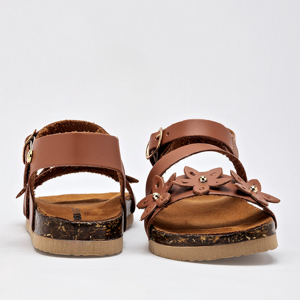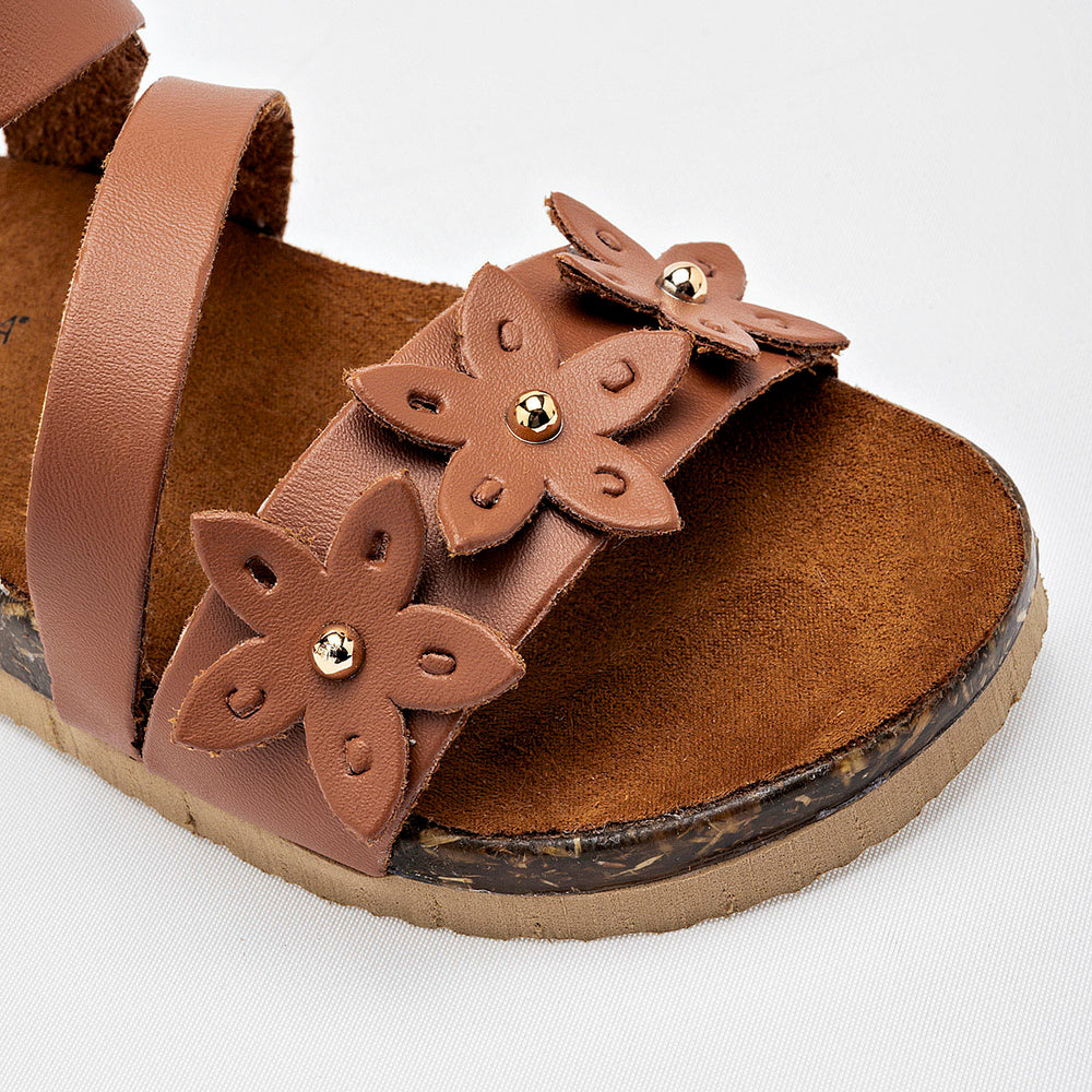 El calzado presenta una suela de tipo corcho, que no solo aporta un toque natural, sino que también ofrece ligereza y comodidad. La parte superior está compuesta por varias tiras de material sintético liso de color camel, y destaca un adorno floral en la tira del empeine, con detalles de metal dorado en el centro de las flores. Cuentan con una correa ajustable en el tobillo con cierre de hebilla metálica, garantizando un ajuste seguro.