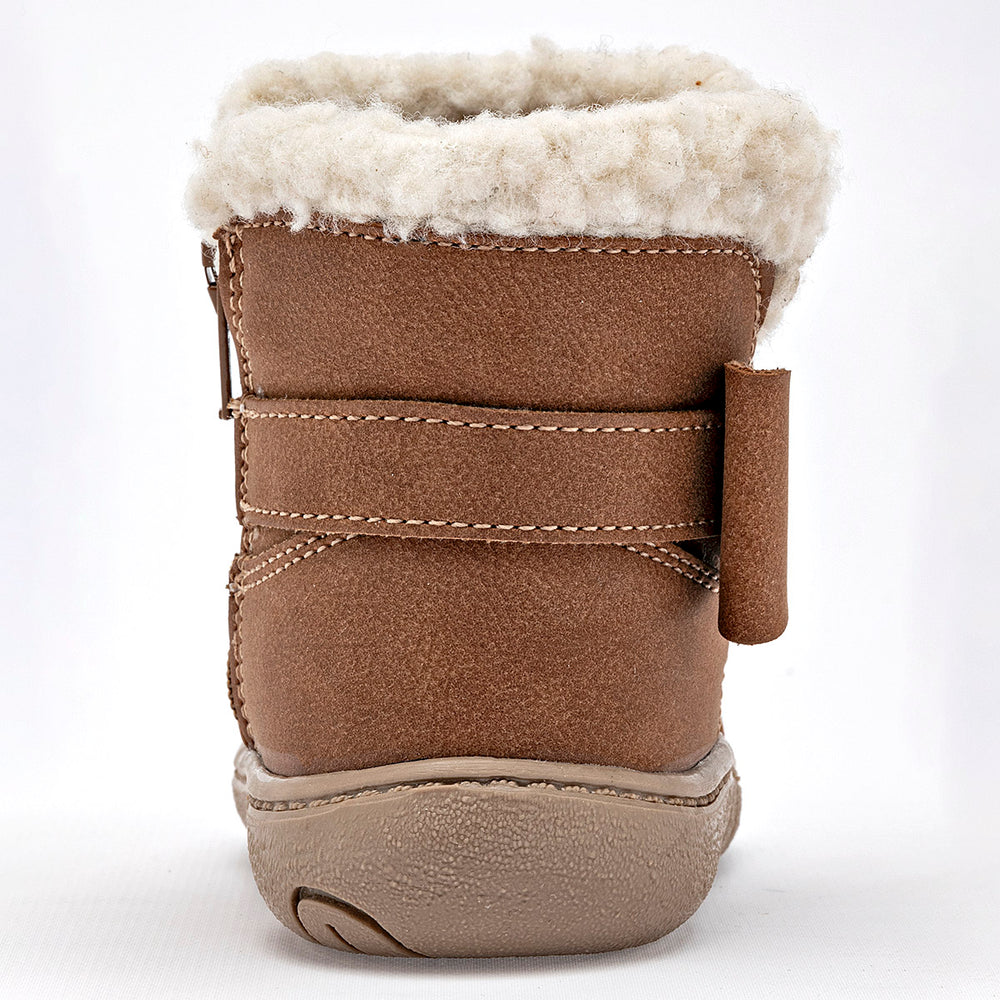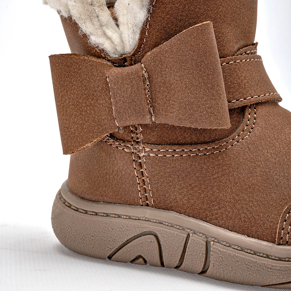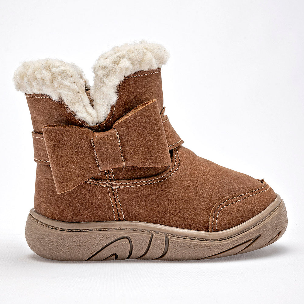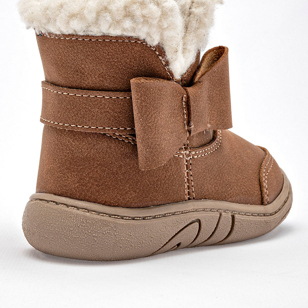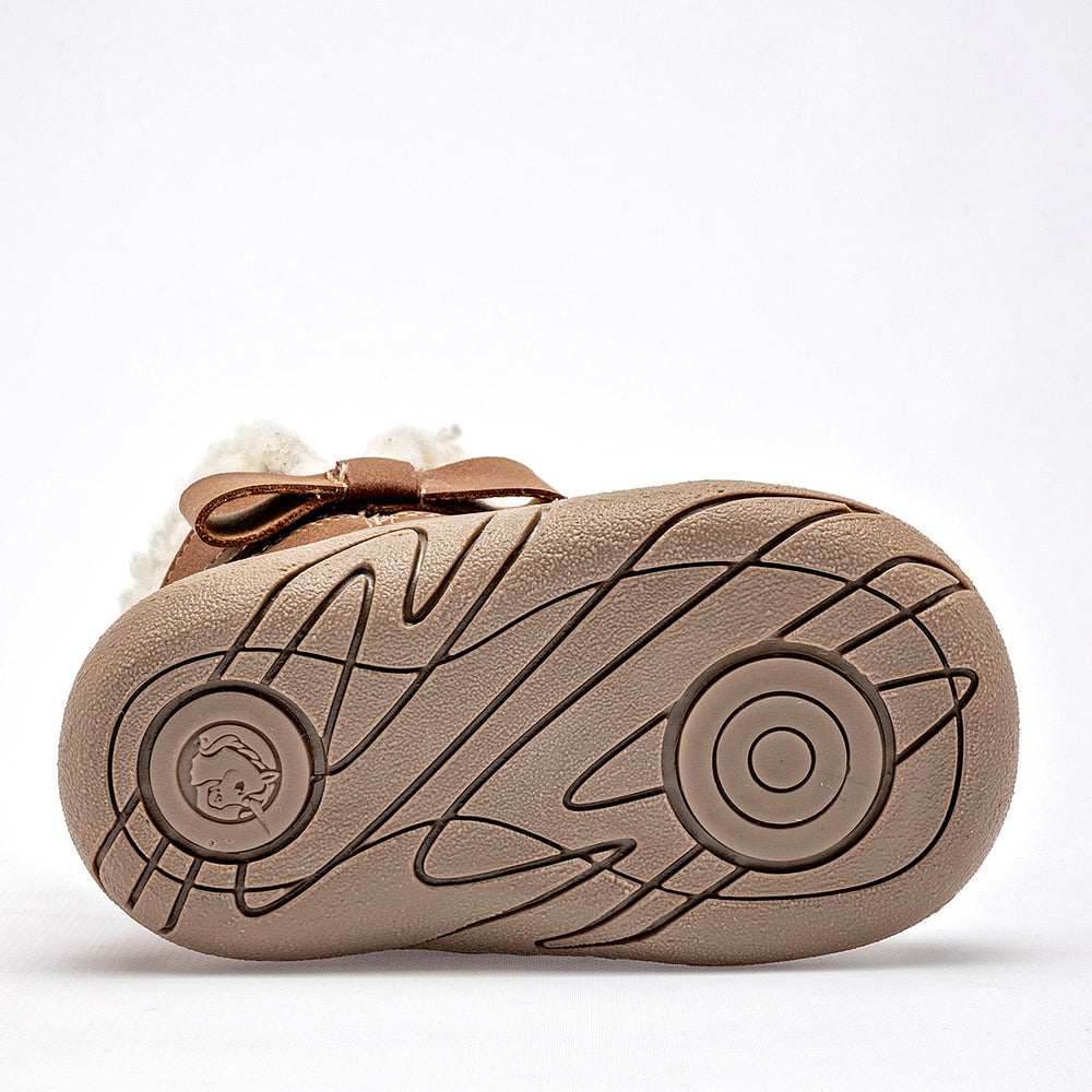 Estas son unas botas para bebé en color marrón con un acabado tipo gamuza. Están diseñadas para el invierno, con un forro interior y un borde superior de pelo sintético de color crema, lo que les da un aspecto cálido y acogedor. El diseño presenta un lazo decorativo en el lateral y una tira con velcro para un ajuste fácil. Tienen una suela de goma con relieve para ofrecer tracción.