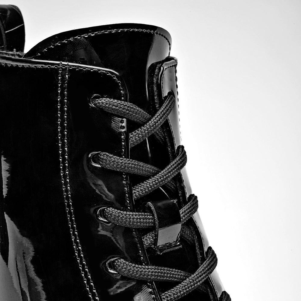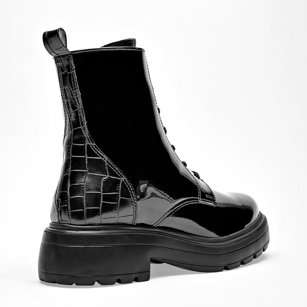 Estos son unos botines de estilo grunge y moderno, con un acabado audaz y llamativo. Están confeccionados en charol brillante, que les da un aspecto pulido y rockero. Cuentan con un sistema de cierre de cordones negros con ojales metálicos, que permite un ajuste perfecto. La suela es tipo track, gruesa y de plataforma, lo que les da altura y un estilo urbano. En la parte trasera, tienen un detalle de textura que simula piel de cocodrilo, añadiendo un elemento de diseño adicional.