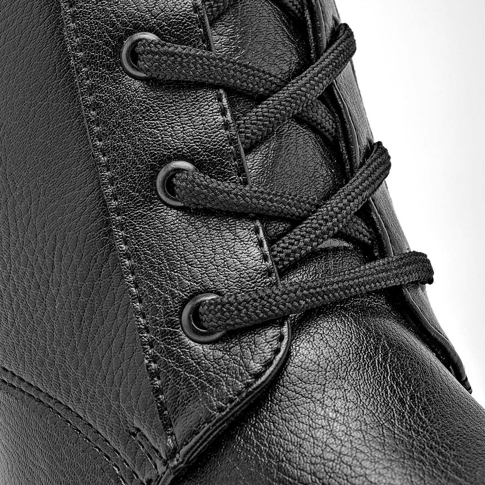 Estos son unos botines de estilo grunge y femenino que combinan la robustez de una bota militar con la elegancia de un tacón. Están confeccionados en un material de piel sintética