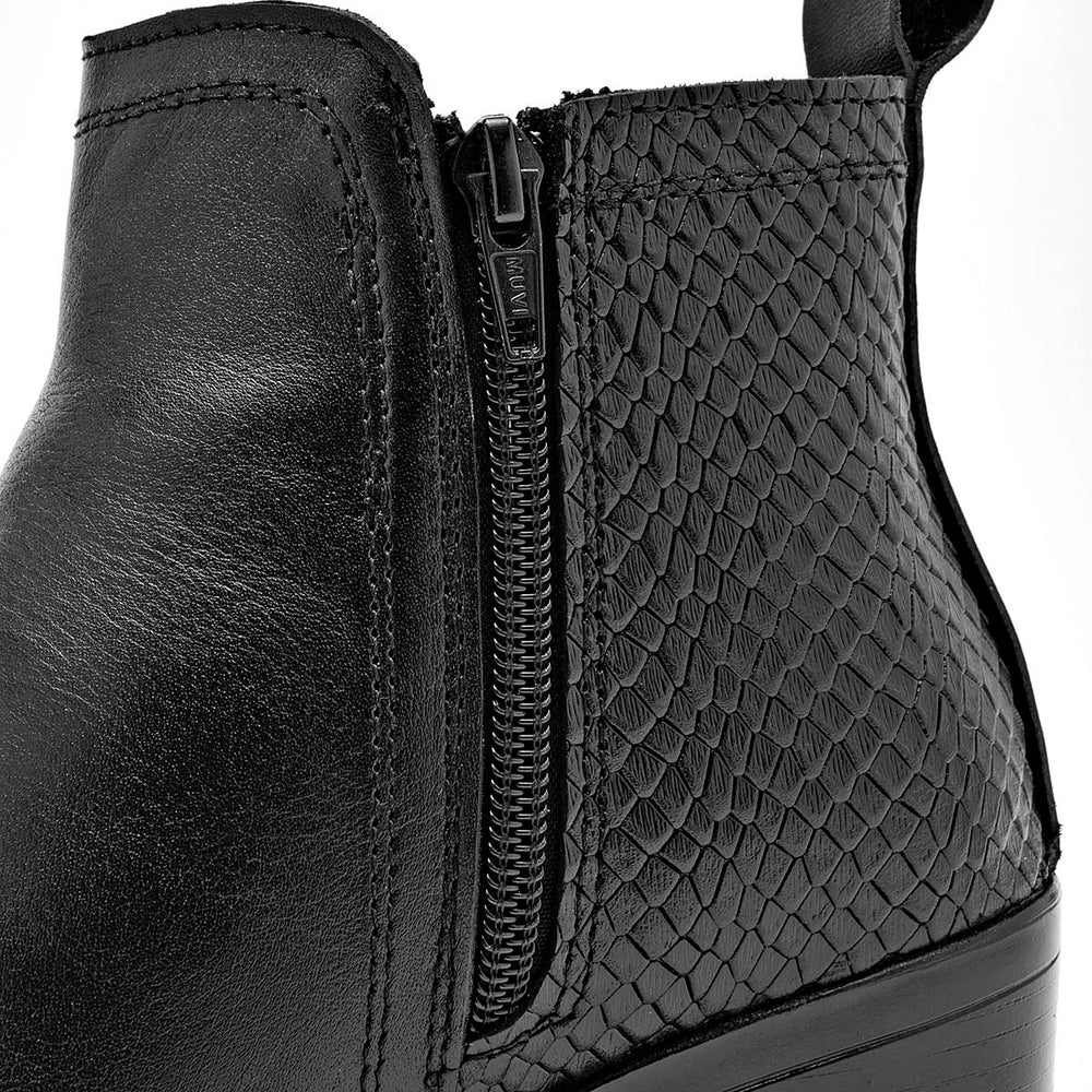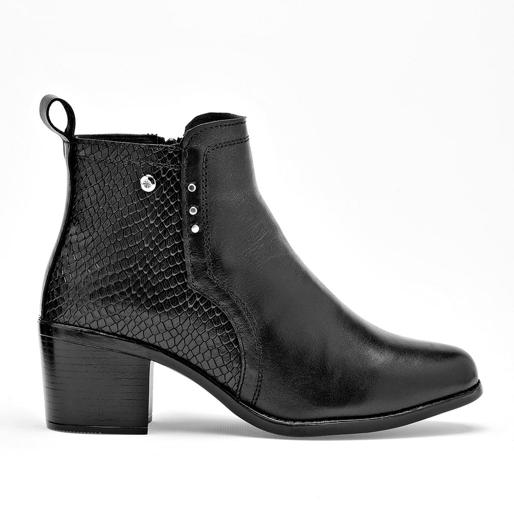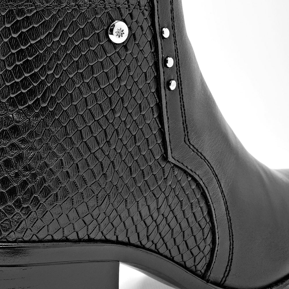 Este botín presenta una mezcla de acabados que lo hacen destacar. La parte frontal y lateral interna muestran un acabado liso, mientras que el panel trasero luce una textura grabada que imita la piel de serpiente , añadiendo profundidad y un toque distintivo. Cuenta con un práctico cierre lateral que facilita su colocación. Un detalle sutil pero llamativo son los tres pequeños apliques metálicos circulares ubicados en el lateral exterior del talón, aportando un ligero brillo y un toque moderno.