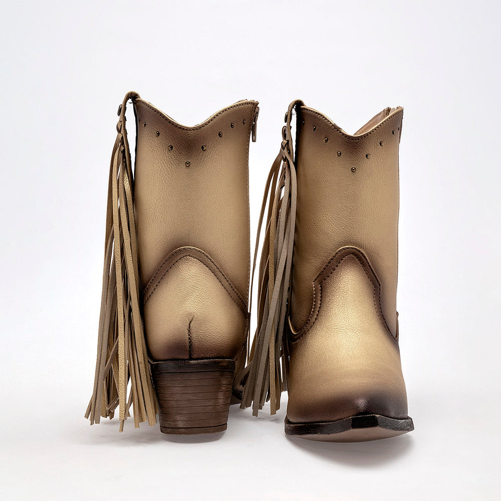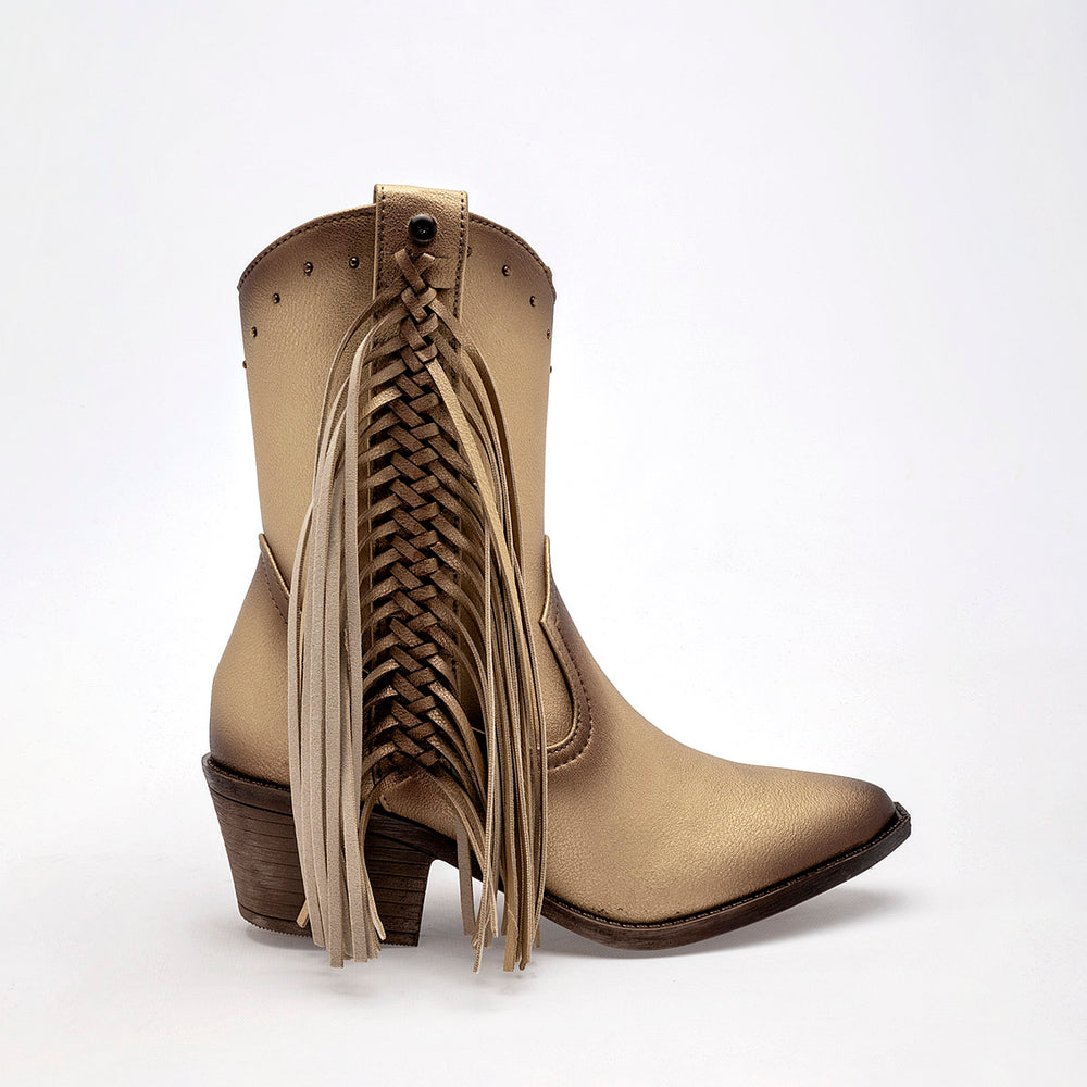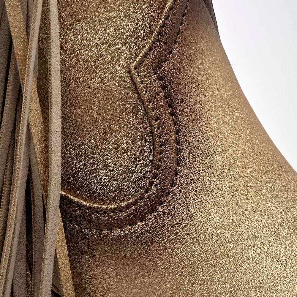 Este botín presenta una silueta de caña media con una punta sutilmente afilada y un tacón bajo de 6 cm, que proporciona la elevación justa con estabilidad. Lo más destacado son los flecos largos y fluidos que caen elegantemente por el lateral exterior de la bota, añadiendo movimiento y un toque bohemio. La parte superior de la caña está adornada con pequeños estoperoles metálicos, que aportan un detalle chic.