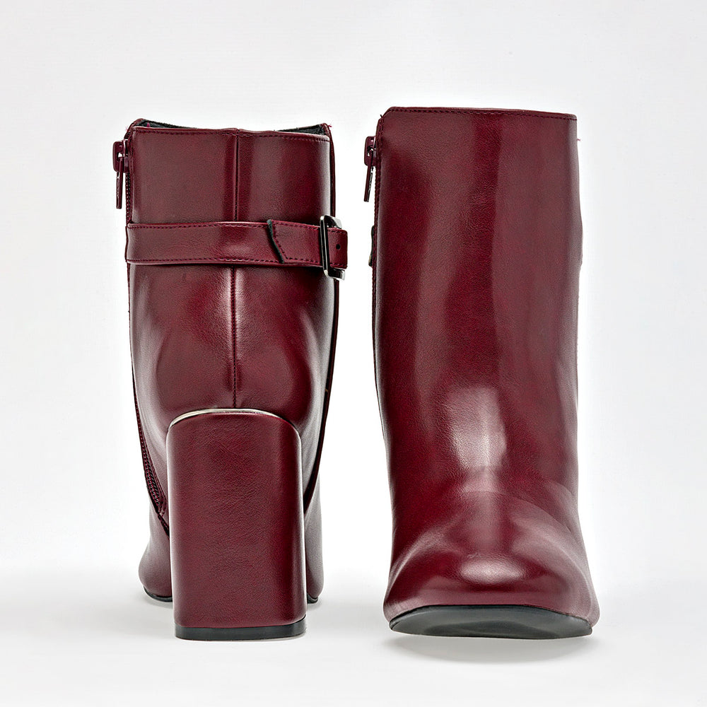 Este botín presenta una silueta refinada con una punta sutilmente redondeada y un imponente tacón de bloque de aproximadamente 9 cm, que proporciona altura y una excelente estabilidad. La parte superior está confeccionada en un material liso con un acabado pulido, evocando elegancia. Un discreto pero chic detalle de correa con hebilla metálica de ajuste adorna la parte trasera del tobillo. El práctico cierre de cremallera en el lateral interior asegura un calce fácil y un ajuste seguro.