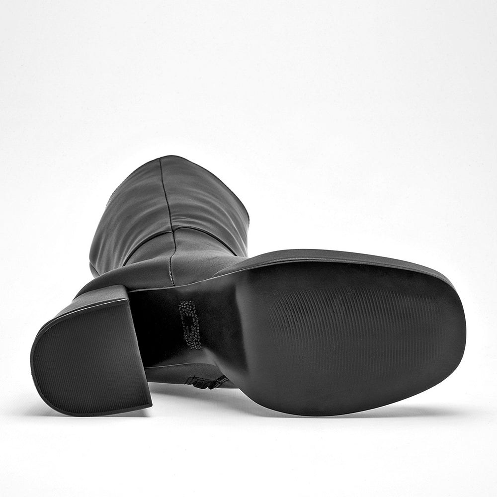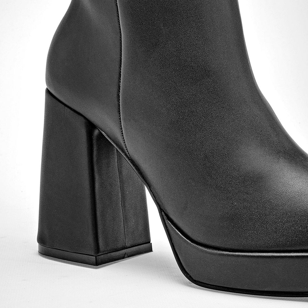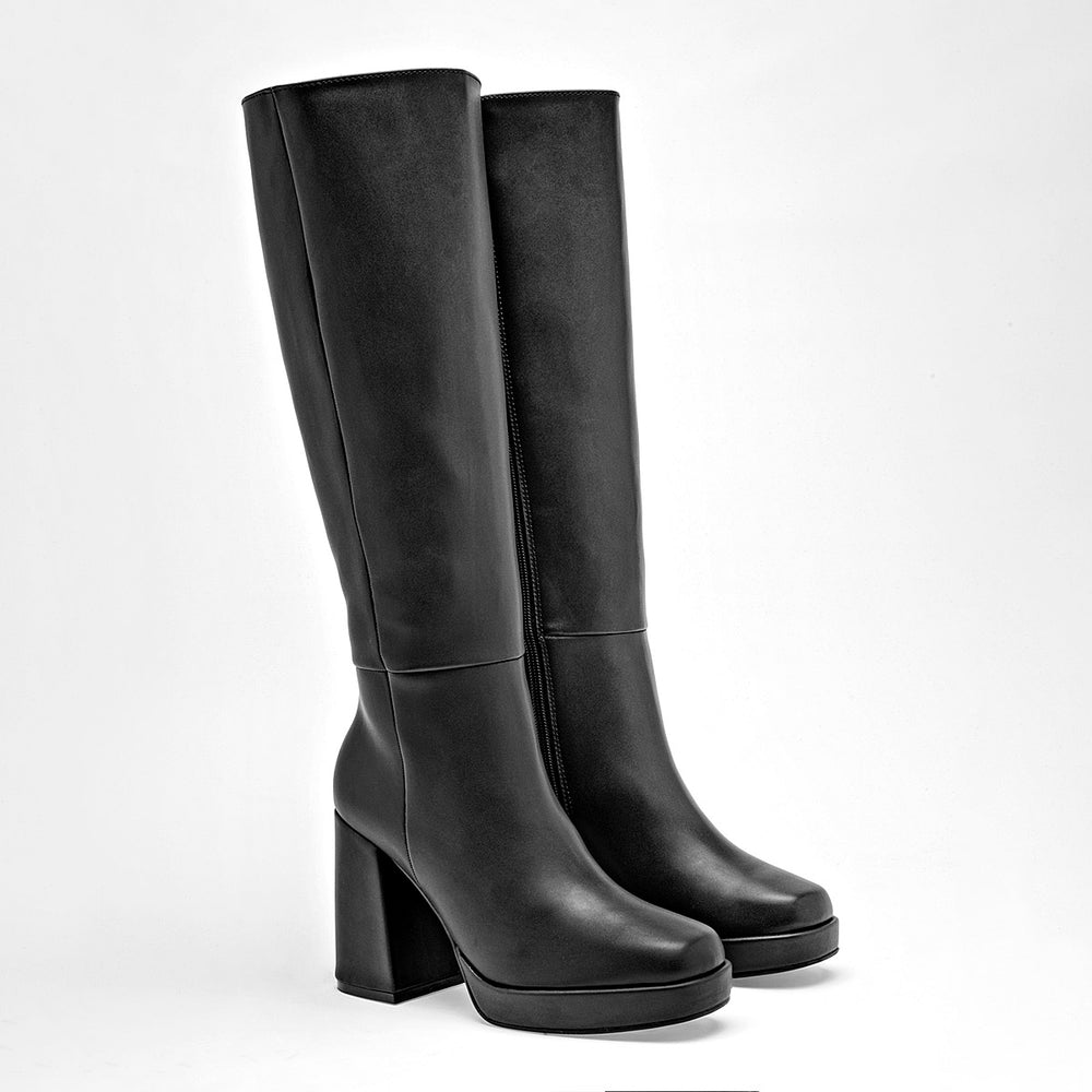 La bota presenta una caña que alcanza aproximadamente la altura de la pantorrilla, lo que ayuda a alargar visualmente la figura y aporta una elegancia notable. Cuenta con un práctico cierre de cremallera lateral que facilita su calce y descalce, asegurando un ajuste cómodo y seguro a la pierna. El diseño se eleva sobre una robusta plataforma delantera y un llamativo tacón de bloque de 10 cm, que proporciona una altura dramática y una pisada sorprendentemente estable.